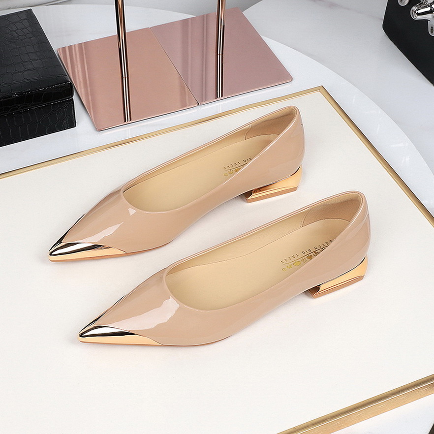 83923 한국 스타일 유행 뾰족한 발가락 낮은 입 편안한 여성 신발 특허 가죽 두꺼운 힐 저발 통근 여성을위한 올 매치 싱글 레이어 신발