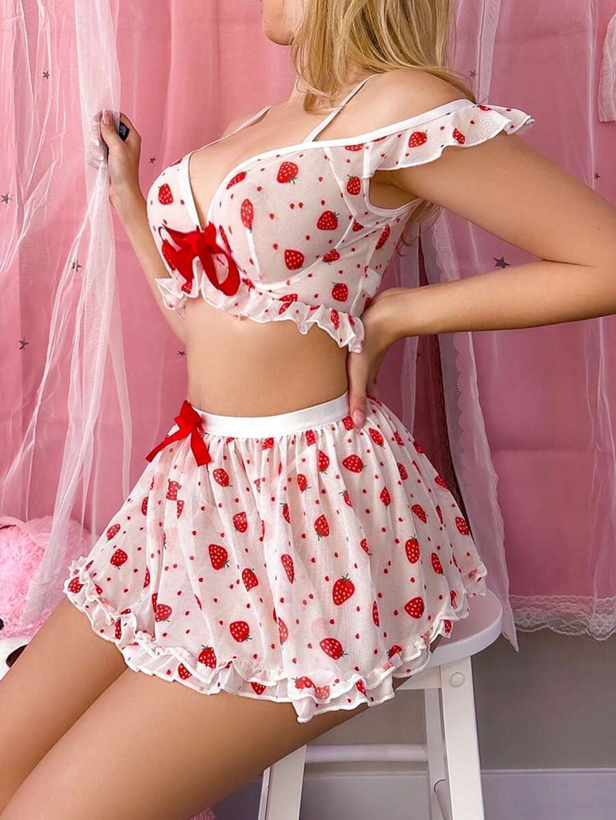 유럽과 미국의 대외 무역 뜨거운 딸기 인쇄 스티칭 레이스 귀여운 파자마 스커트 세트 캐주얼 편안한스토어 가기