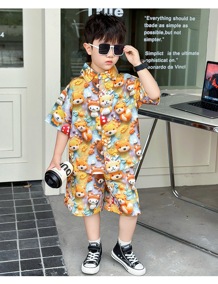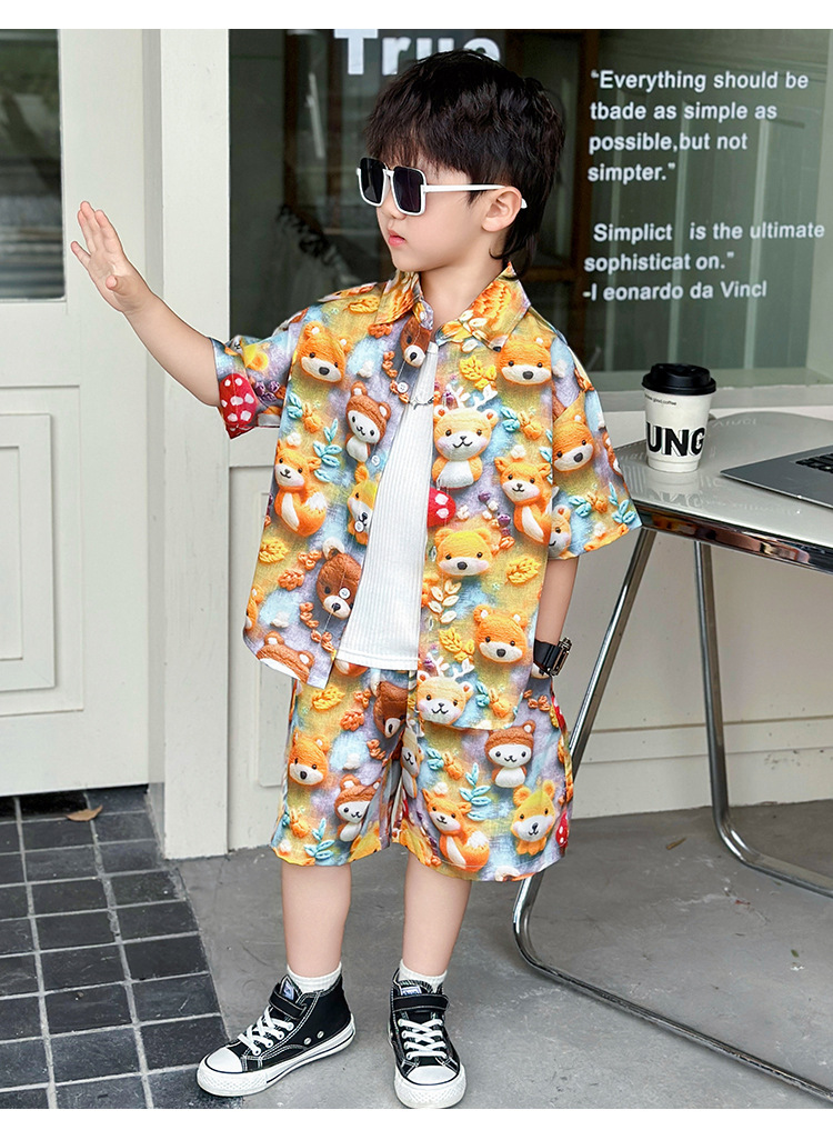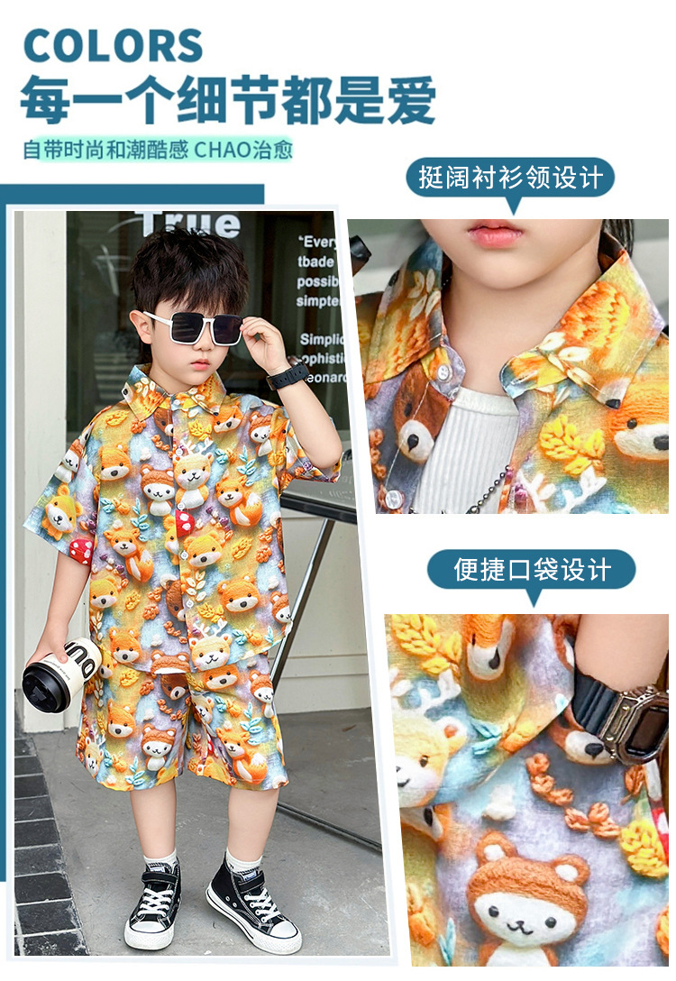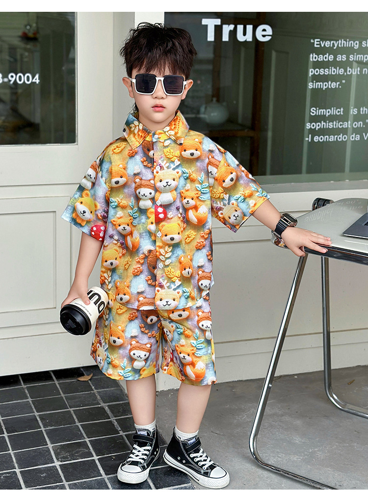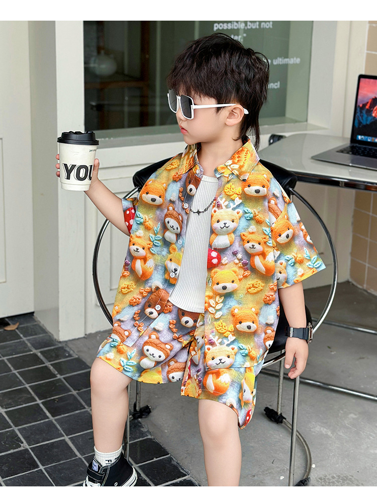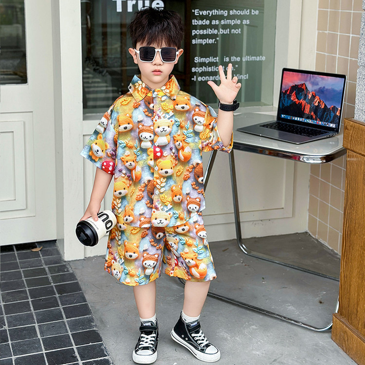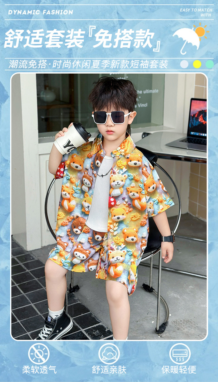 소년 여름 곰 셔츠 정장 어린이 반팔 캐주얼 얇은 투피스 세트 아기 여름 옷 소년