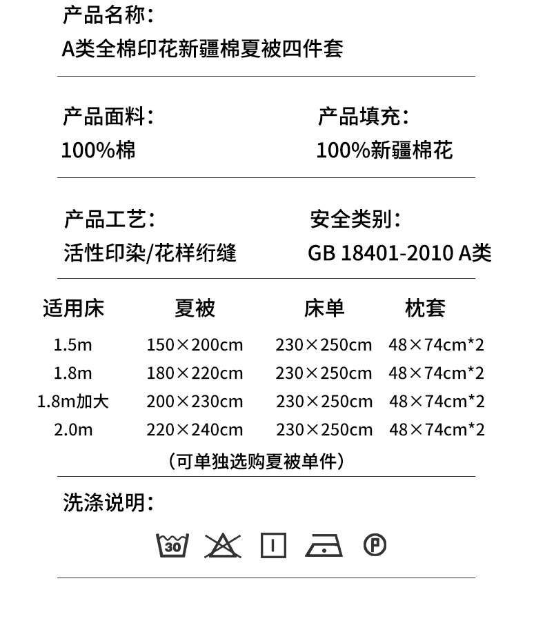 • 1.8m 여름이불 4종세트 [여름이불 1.8m x 2.2m 시트 2.3m x 2.5m 베갯잇 48x74cm 2개] [검사완료]