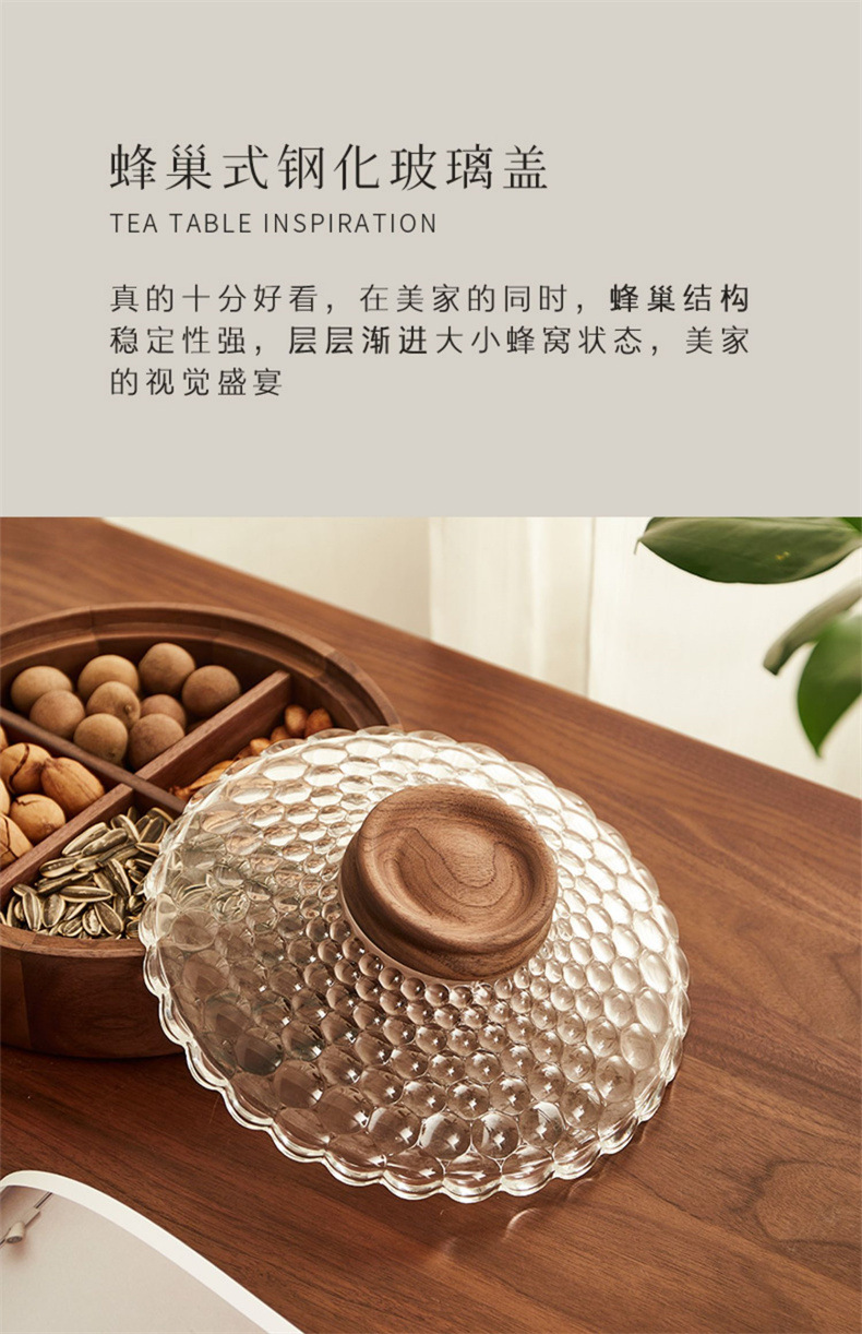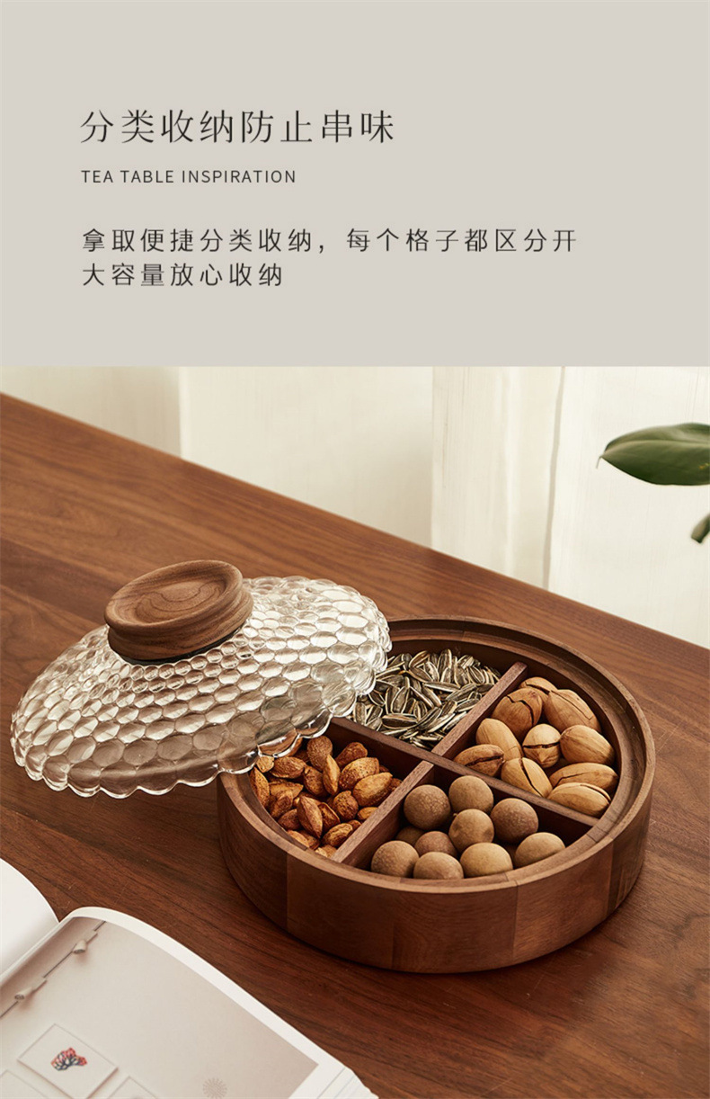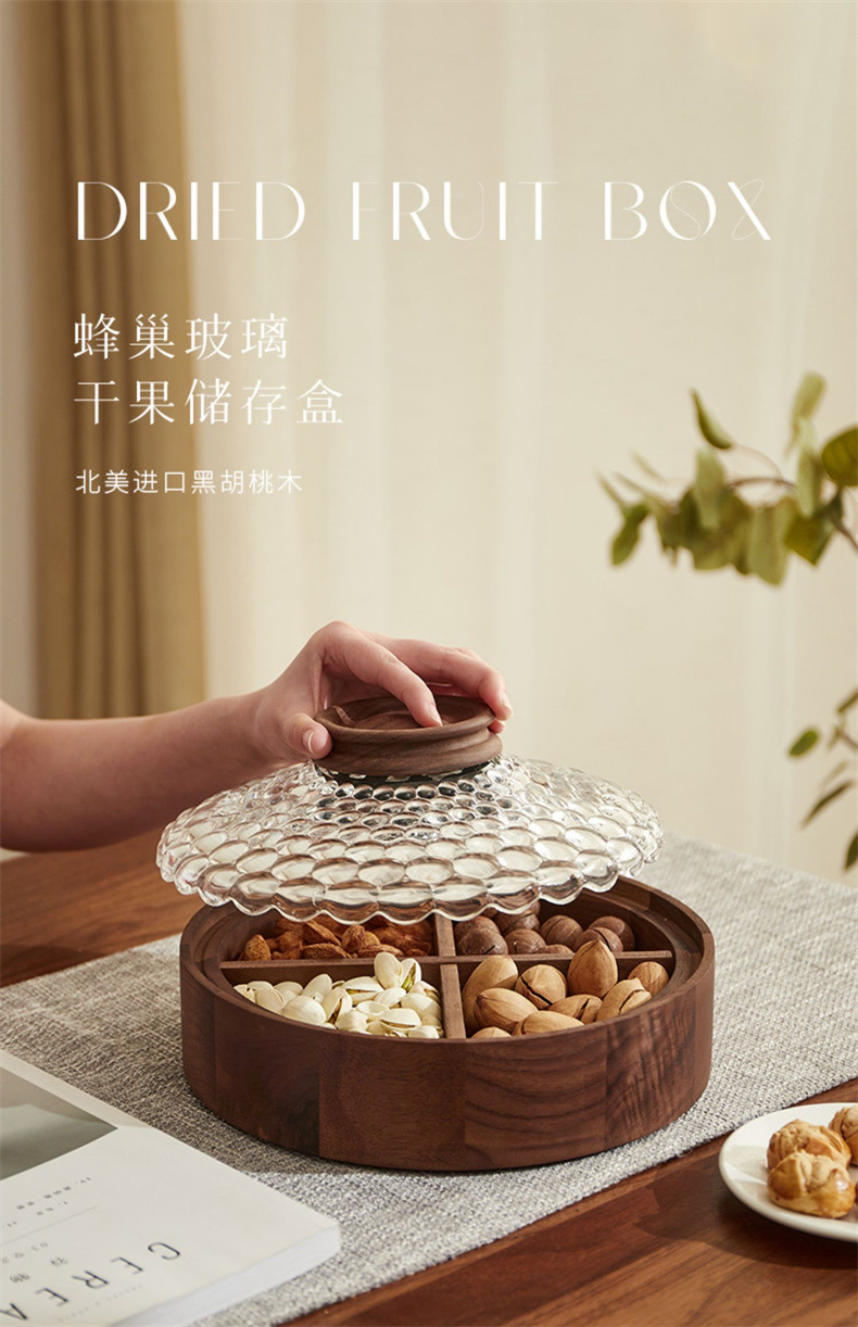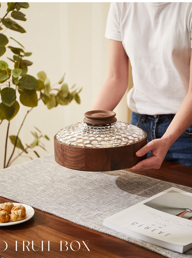 단단한 나무 말린 과일 상자, 과일 접시, 크리스탈 유리 뚜껑, 원형 선물 상자, 새로운 중국식 환대 및 결혼식 보관 상자스토어 가기