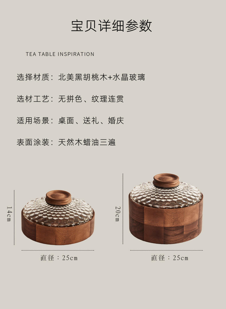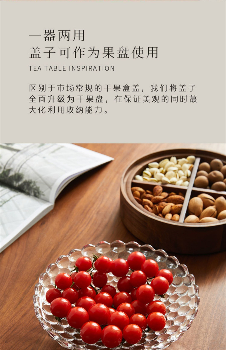 단단한 나무 말린 과일 상자, 과일 접시, 크리스탈 유리 뚜껑, 원형 선물 상자, 새로운 중국식 환대 및 결혼식 보관 상자