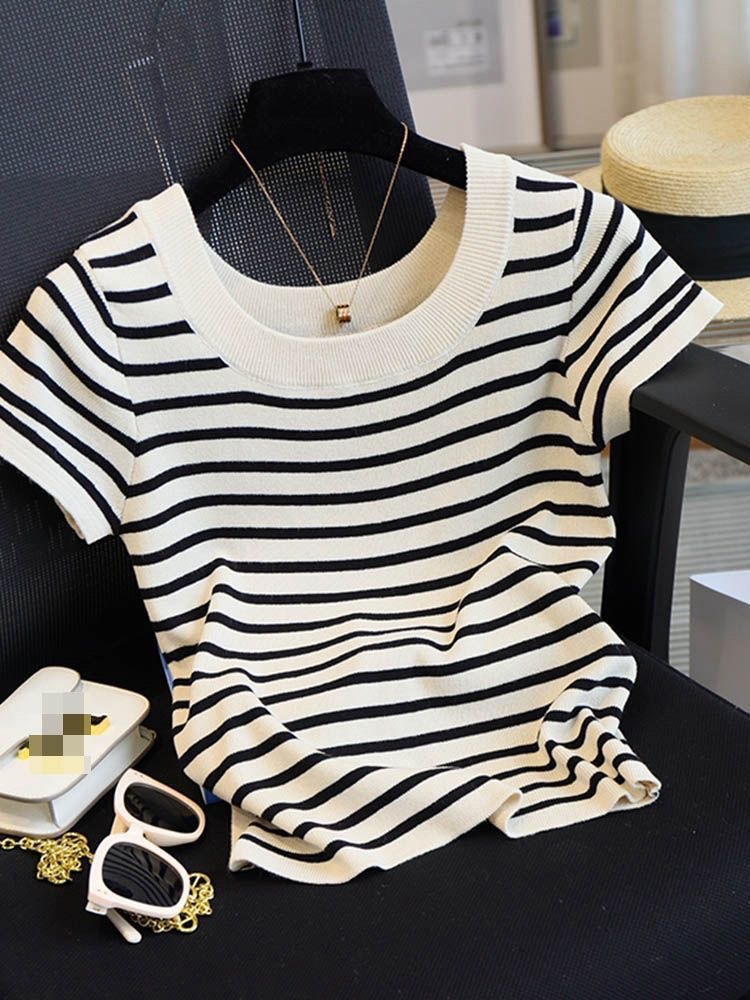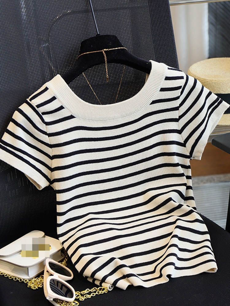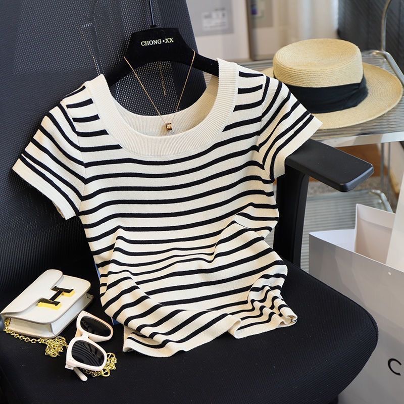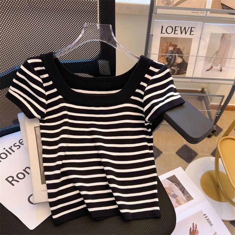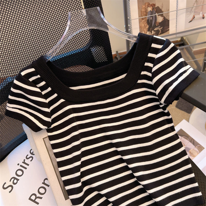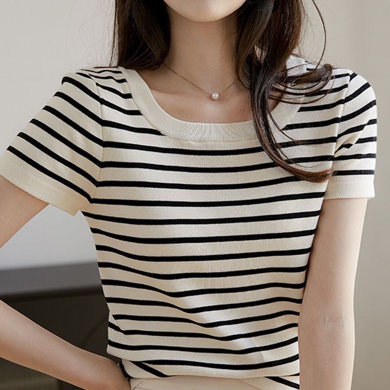 아이스 실크 스트라이프 디자인 반팔 대형 티셔츠 여성용 스퀘어 넥 니트 바닥 셔츠 여름 짧은 슬림 탑 여성용