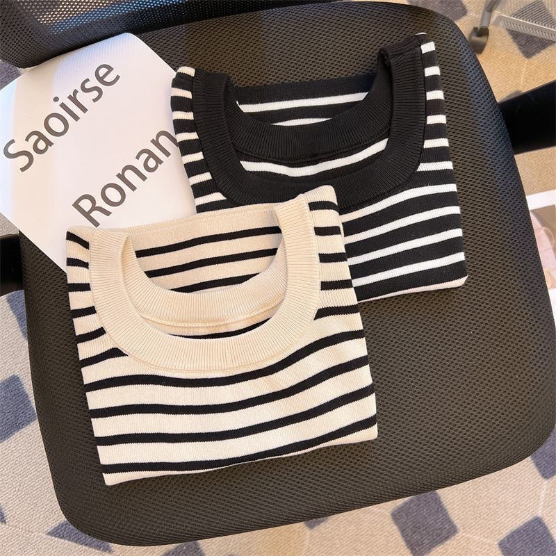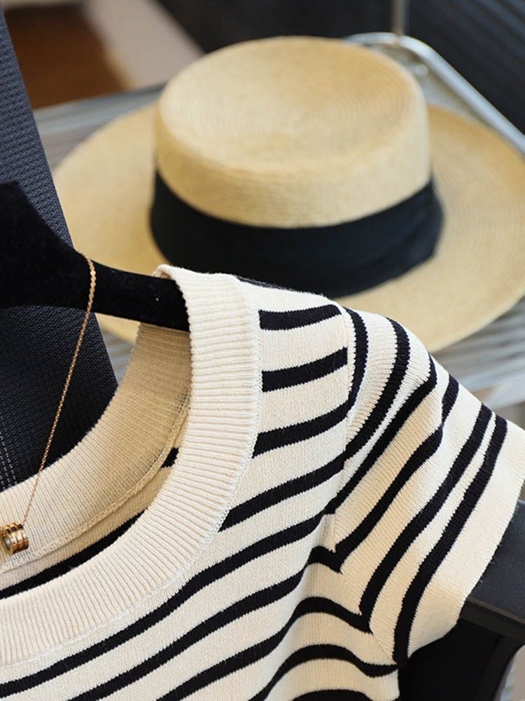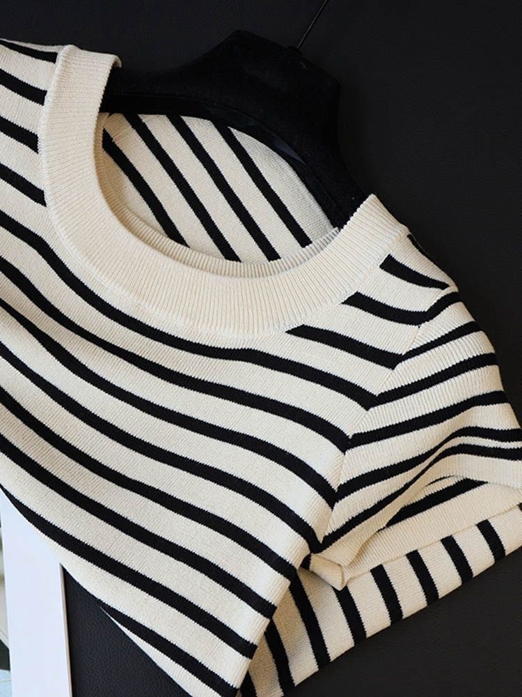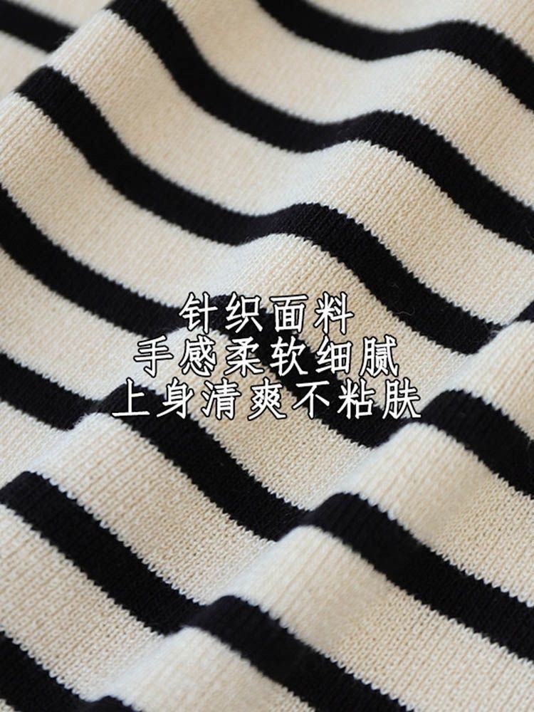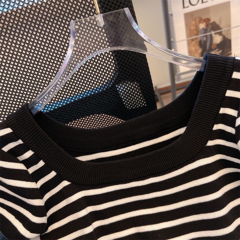아이스 실크 스트라이프 디자인 반팔 대형 티셔츠 여성용 스퀘어 넥 니트 바닥 셔츠 여름 짧은 슬림 탑 여성용