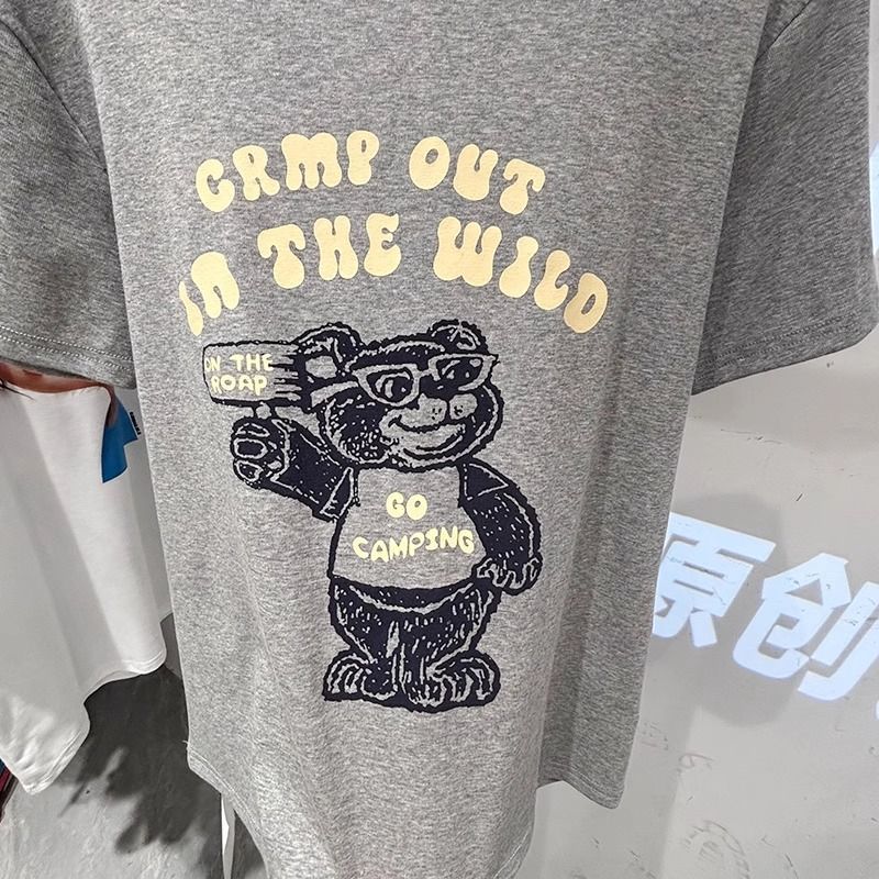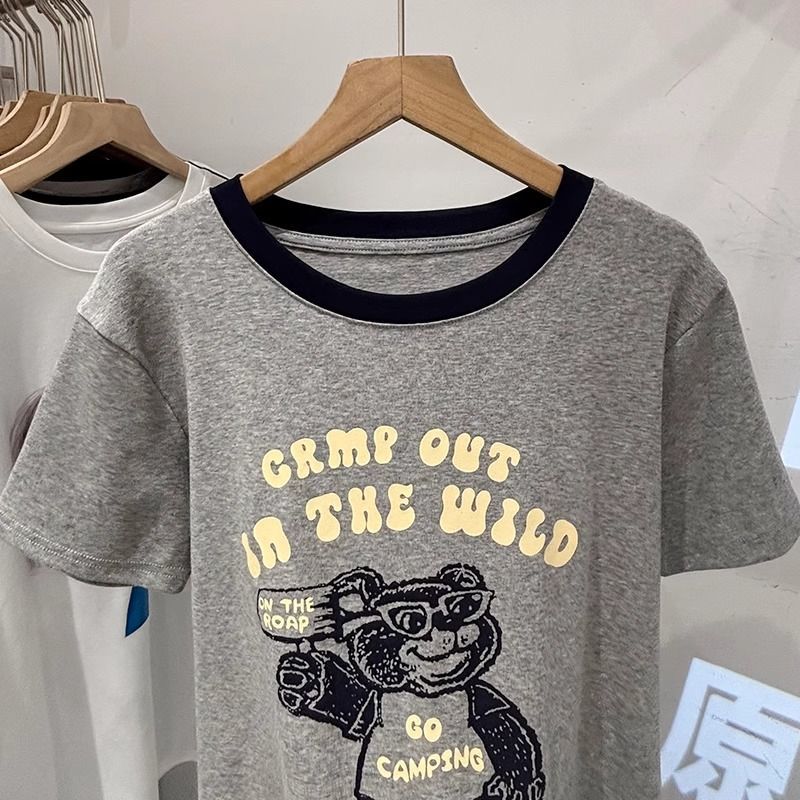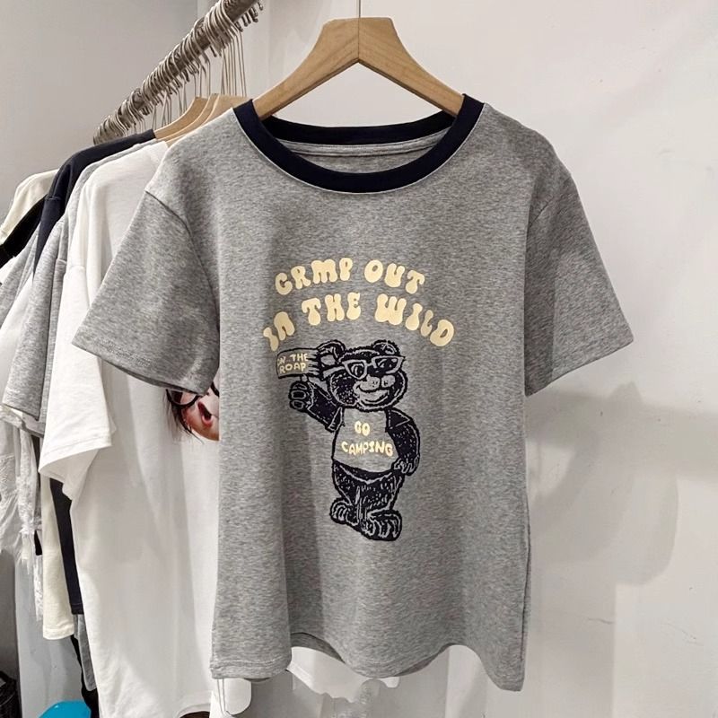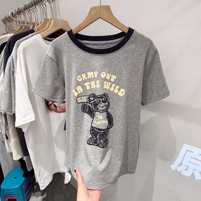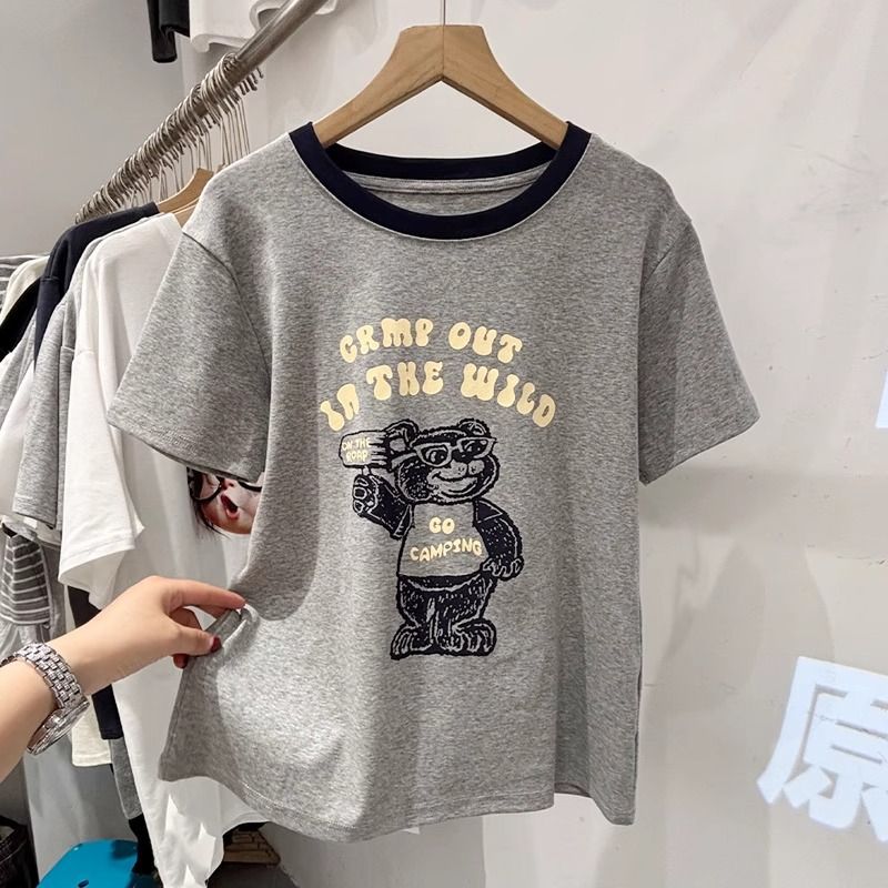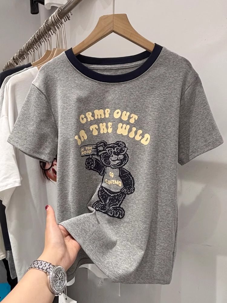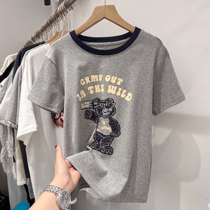 대형 120.00kg 2025 봄과 여름 새로운 만화 곰 편지 인쇄 반팔 티셔츠 여성용 둥근 목 슬림 핏 슬림 핏스토어 가기