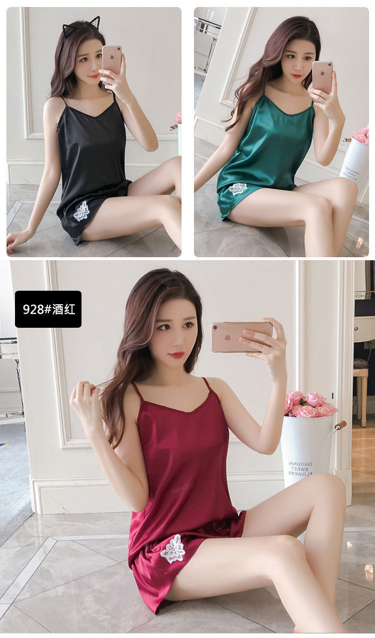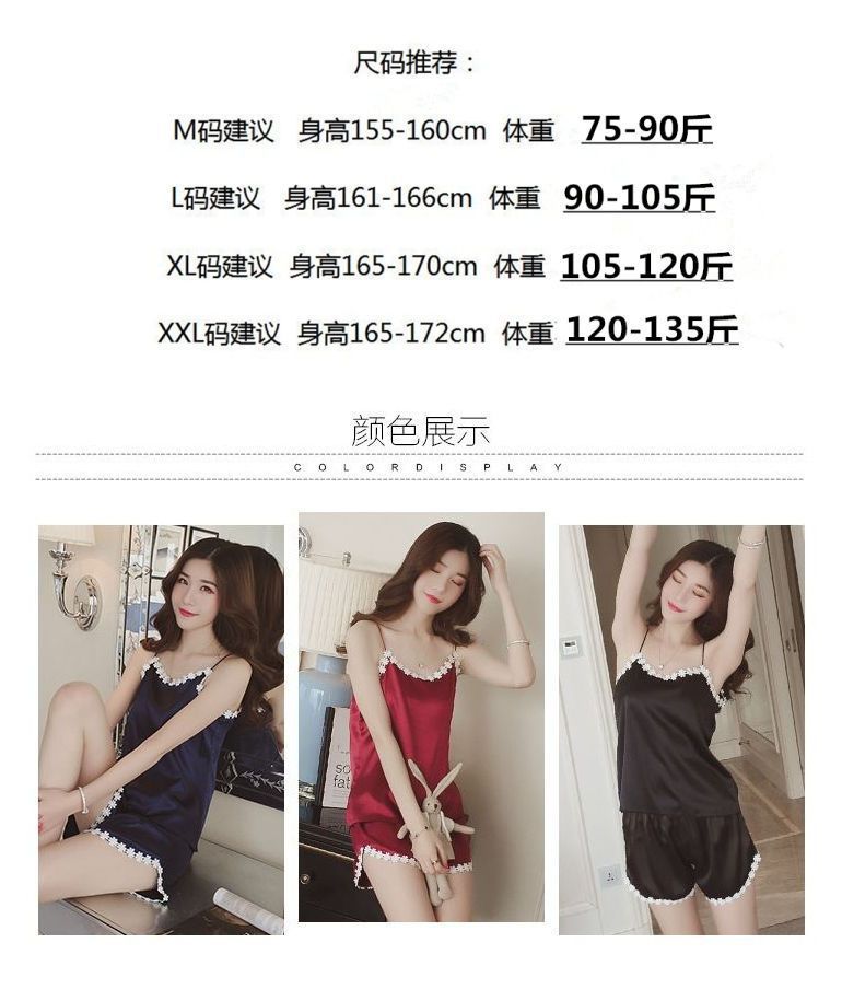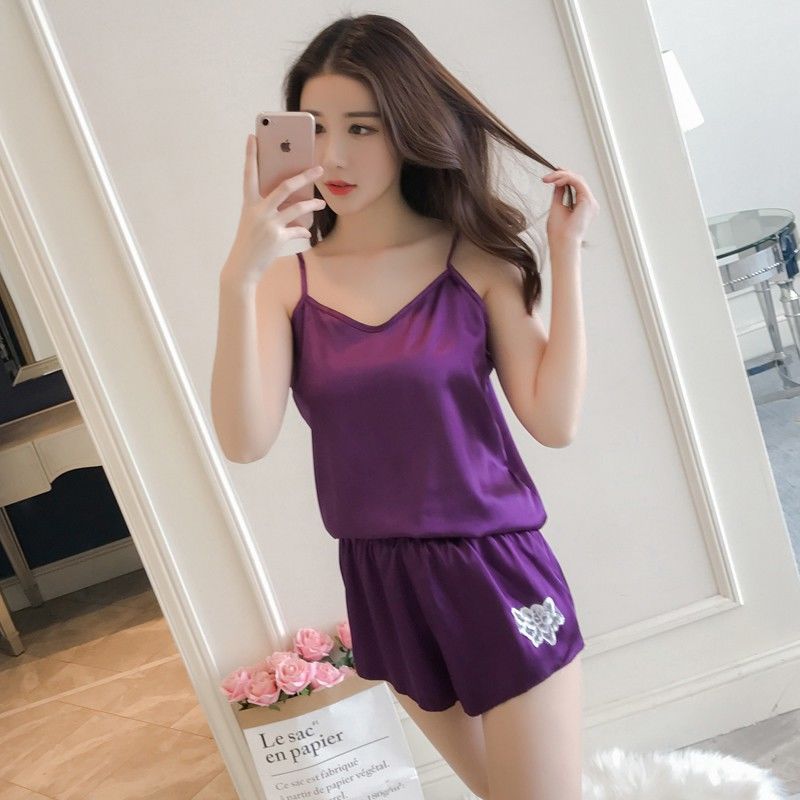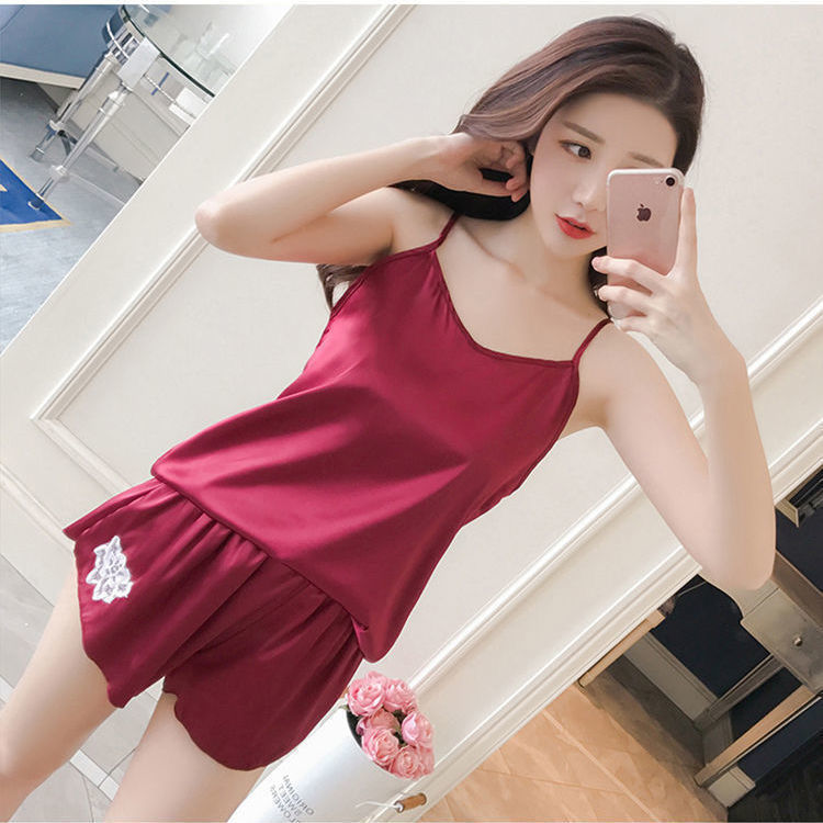 여성용 잠옷 여름 달콤한 얼음 실크 서스펜더 반바지 투피스 학생 한국 패션 여성 여름 느슨한 가정 의류스토어 가기