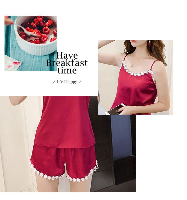 여성용 잠옷 여름 달콤한 얼음 실크 서스펜더 반바지 투피스 학생 한국 패션 여성 여름 느슨한 가정 의류
