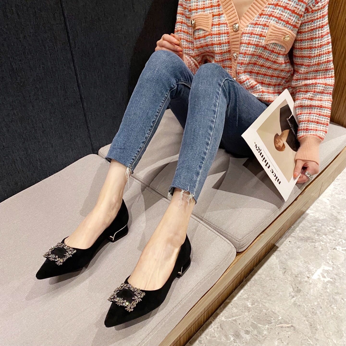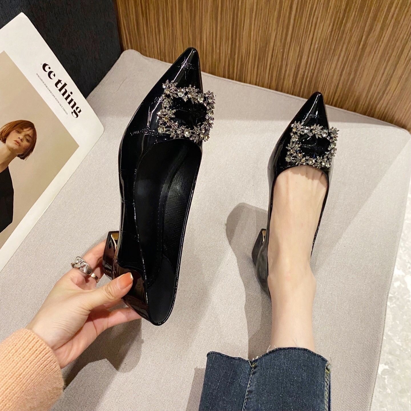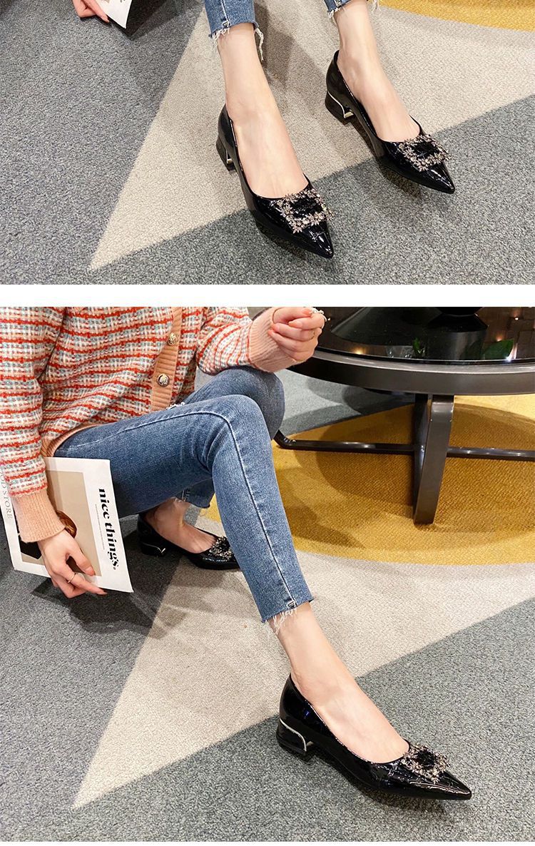 여성을 위한 라인스톤 두꺼운 굽 싱글 슈즈, 틈새 디자인, 2025년 새로운 스타일, 여성용 뾰족한 앞코, 얕은 입구, 플랫 바닥, 프렌치 블랙 작업화스토어 가기