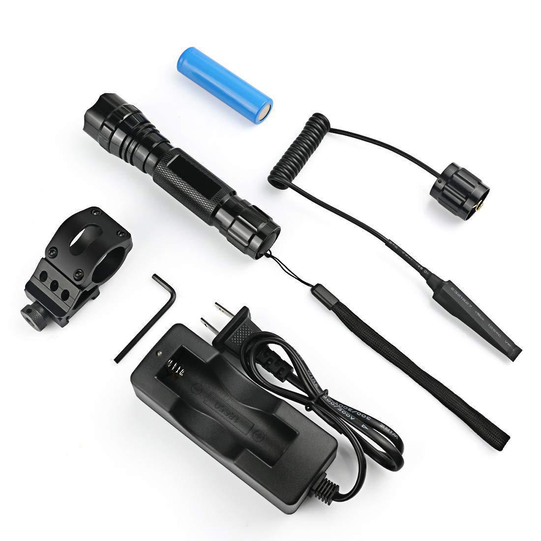 完整套装:1个LED手电筒,1个18650可充电电池,1个18650充电器,1个压力开关,1个手电筒支架。