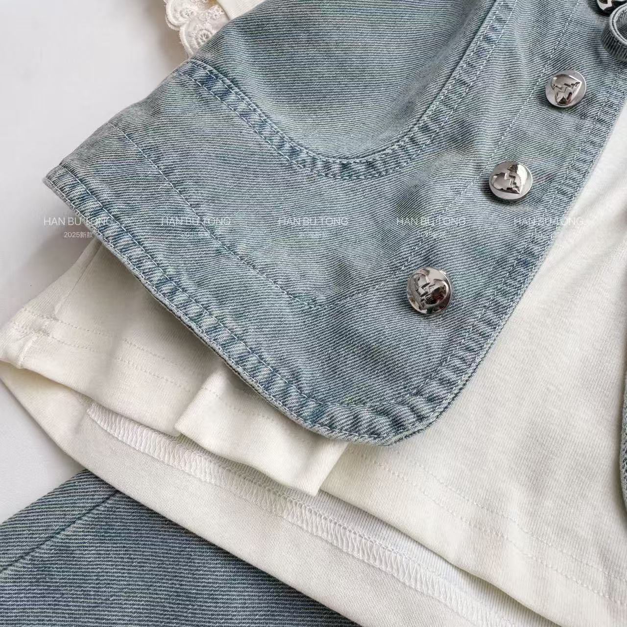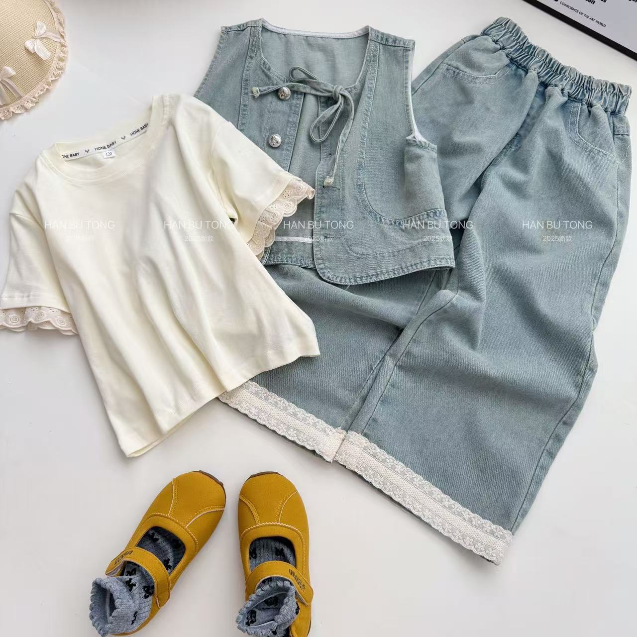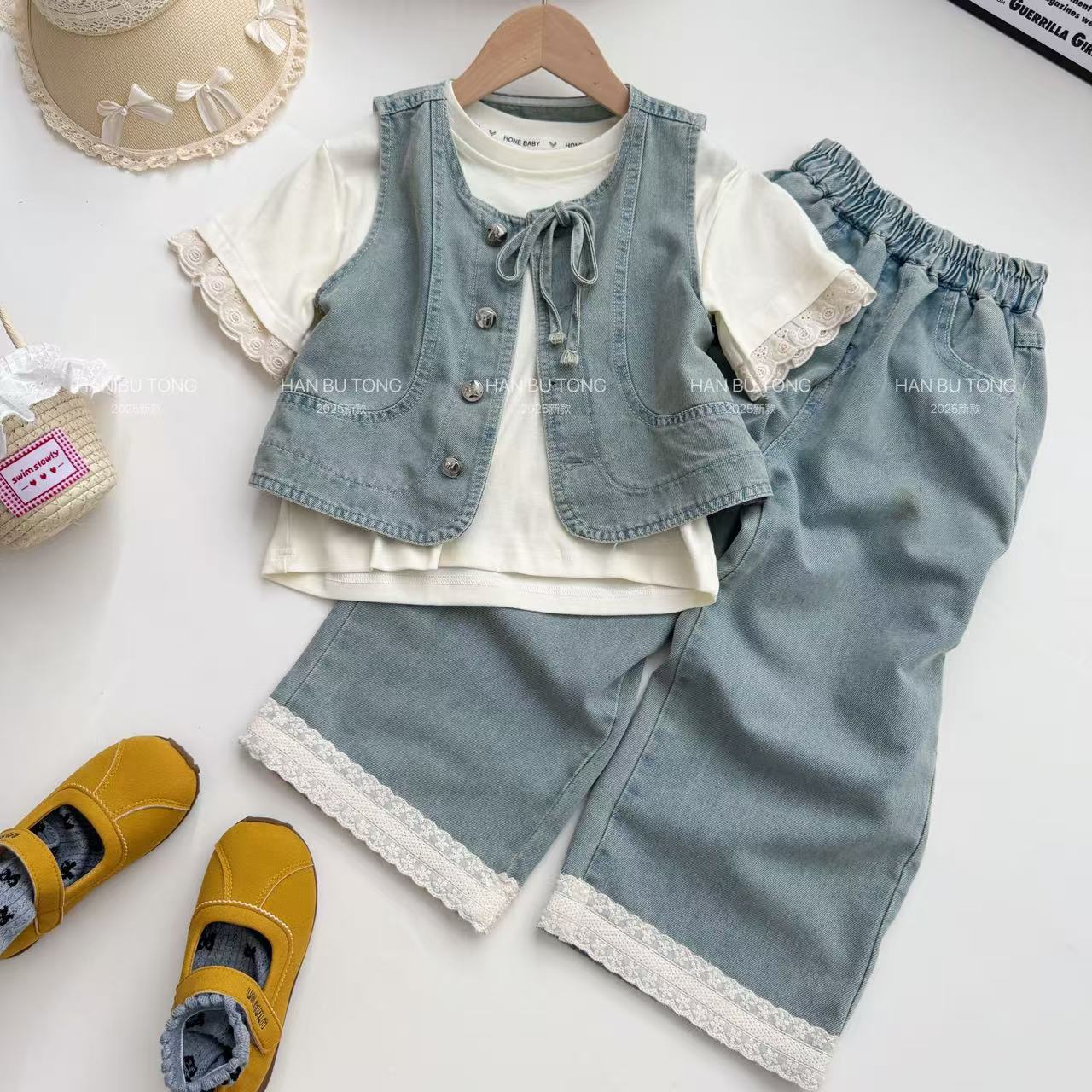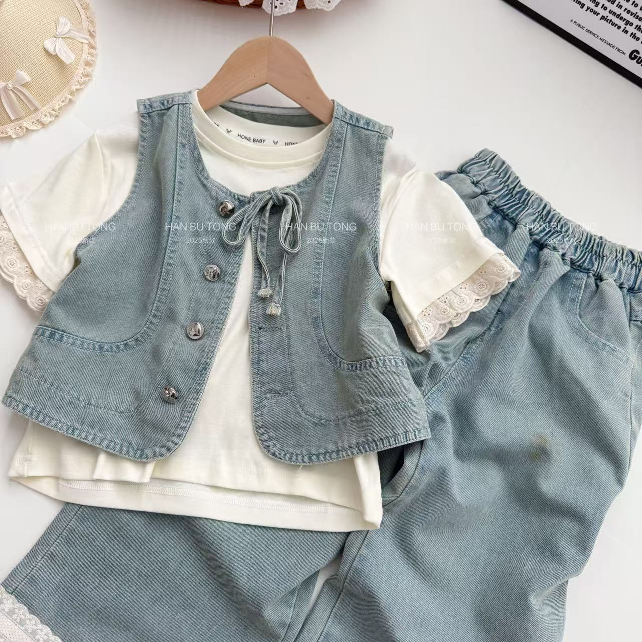 여자 여름 세트 2025 새로운 어린이 서양식 큰 어린이 여름 데님 조끼 반팔 티셔츠 3 피스 유행 세트