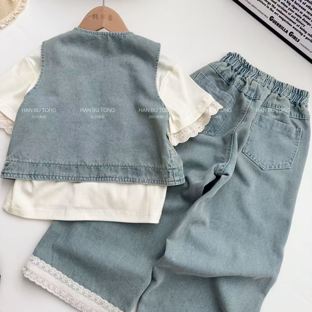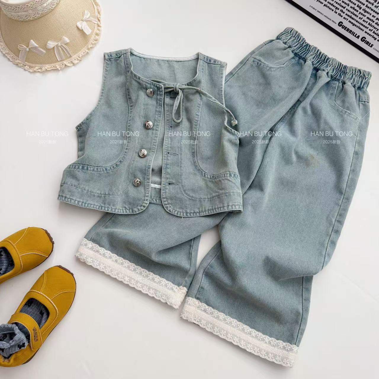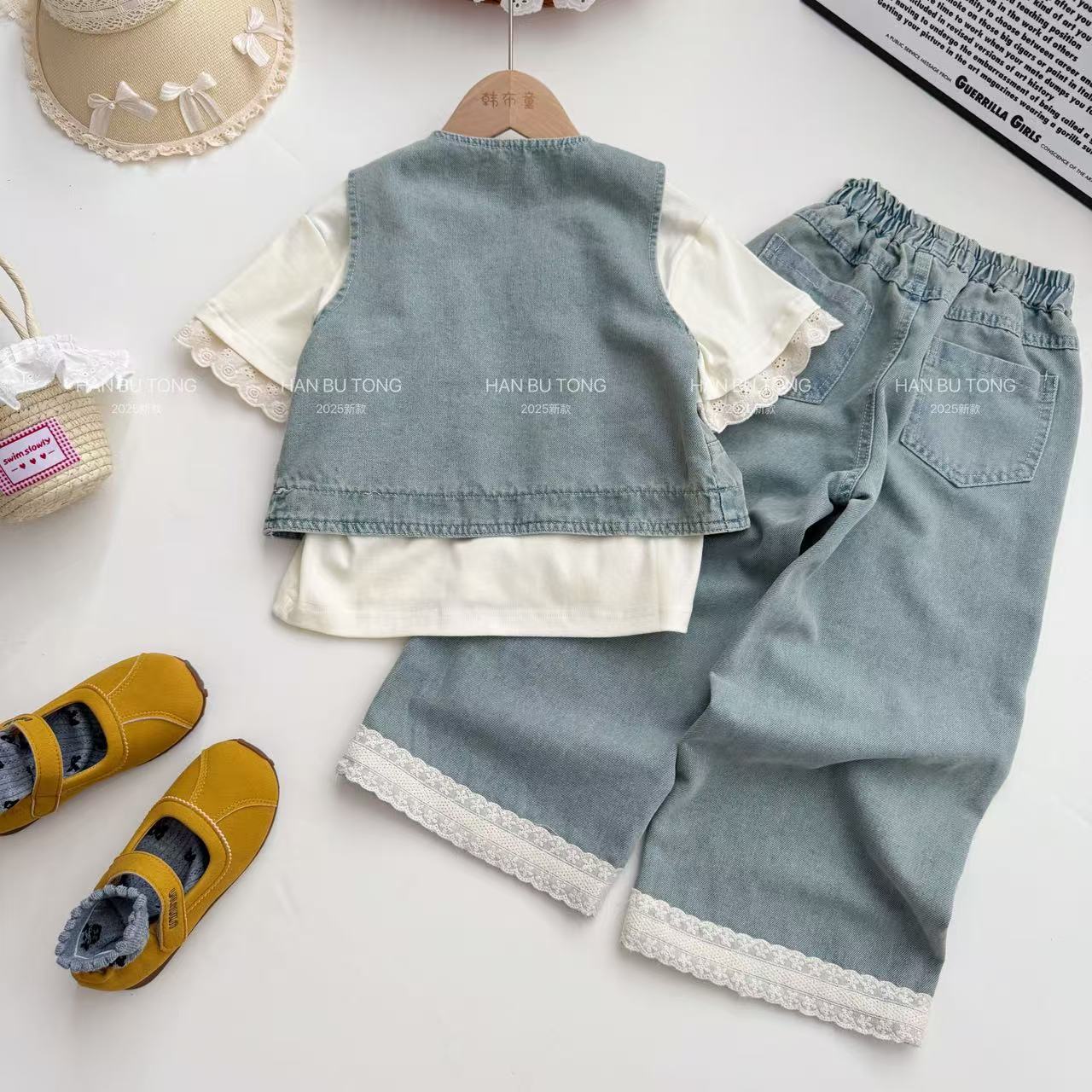 여자 여름 세트 2025 새로운 어린이 서양식 큰 어린이 여름 데님 조끼 반팔 티셔츠 3 피스 유행 세트