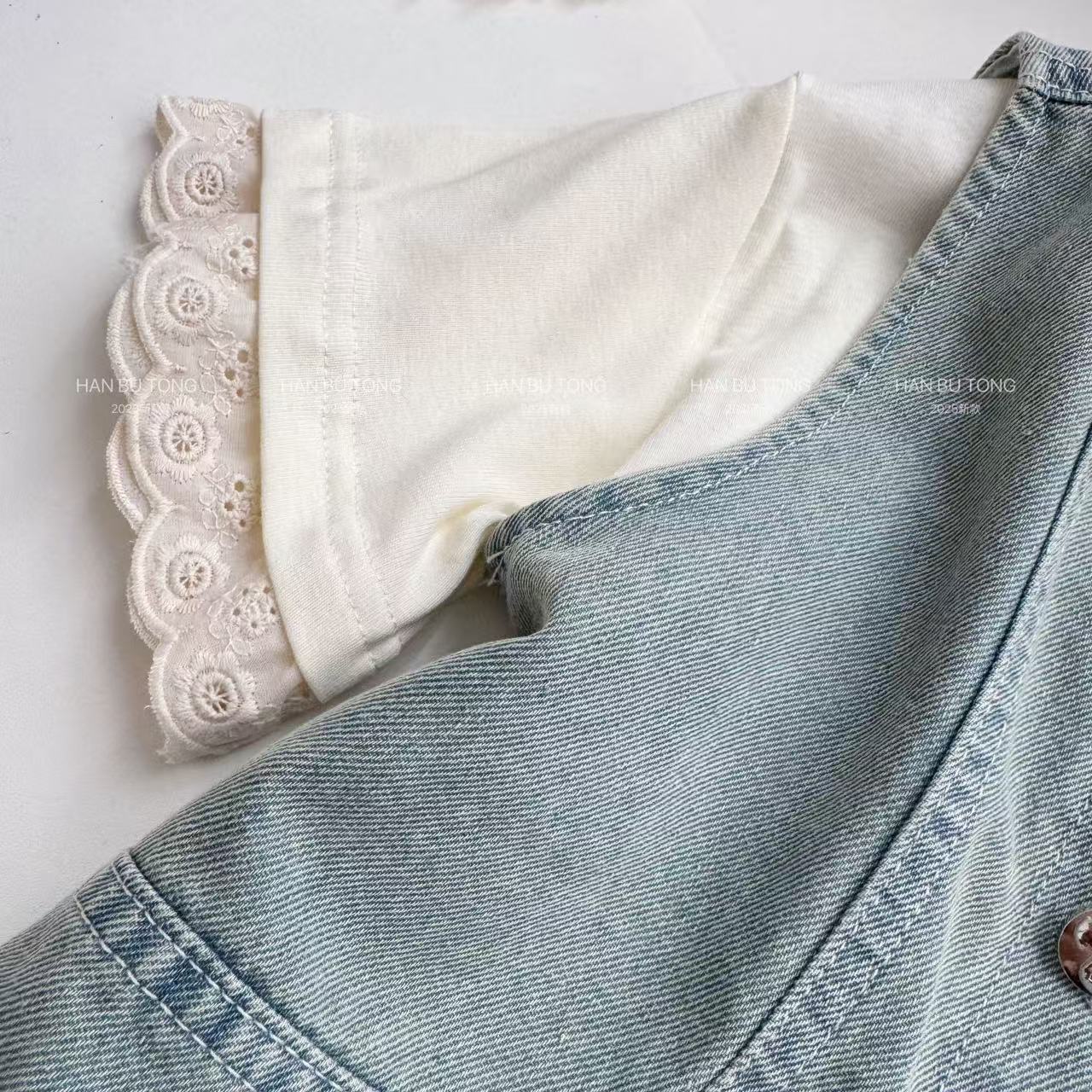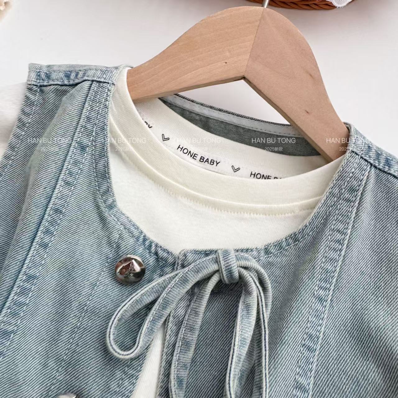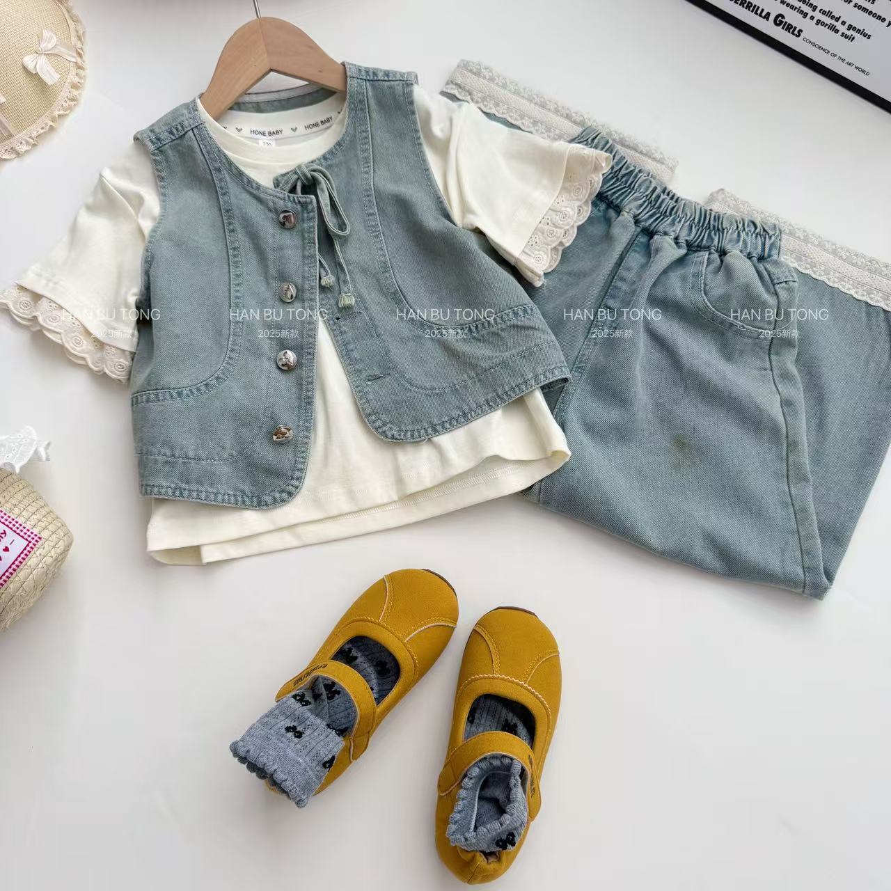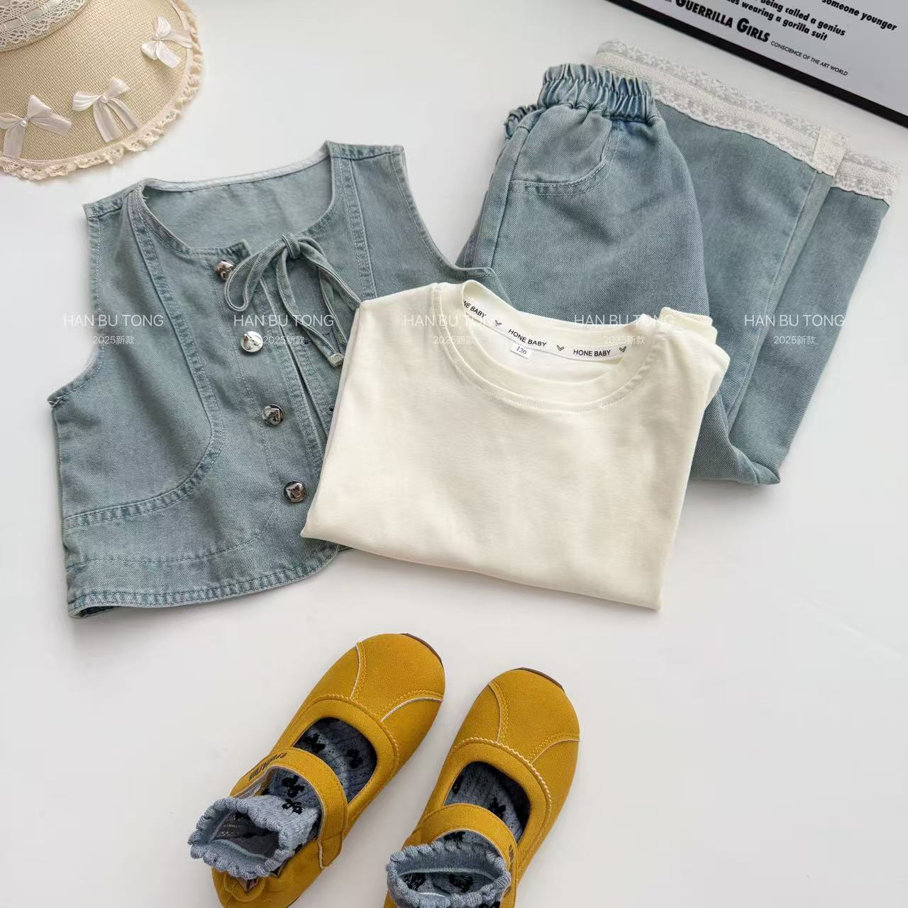 여자 여름 세트 2025 새로운 어린이 서양식 큰 어린이 여름 데님 조끼 반팔 티셔츠 3 피스 유행 세트