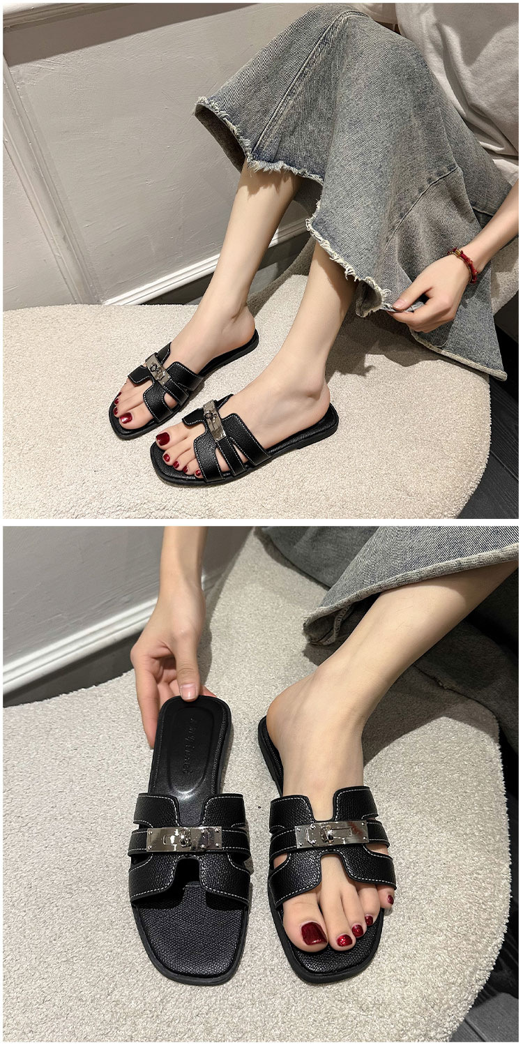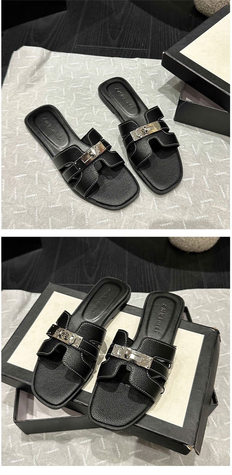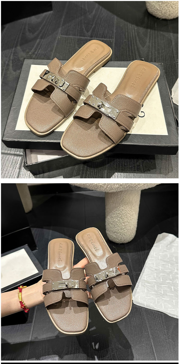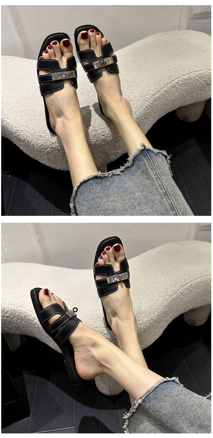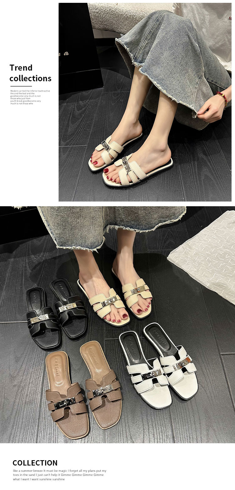 실버 작은 자물쇠 플랫 슬리퍼 여성 여름 2025 새로운 도착 슬라이드 슬리퍼 휴가 유행 의류 프렌치 샌들