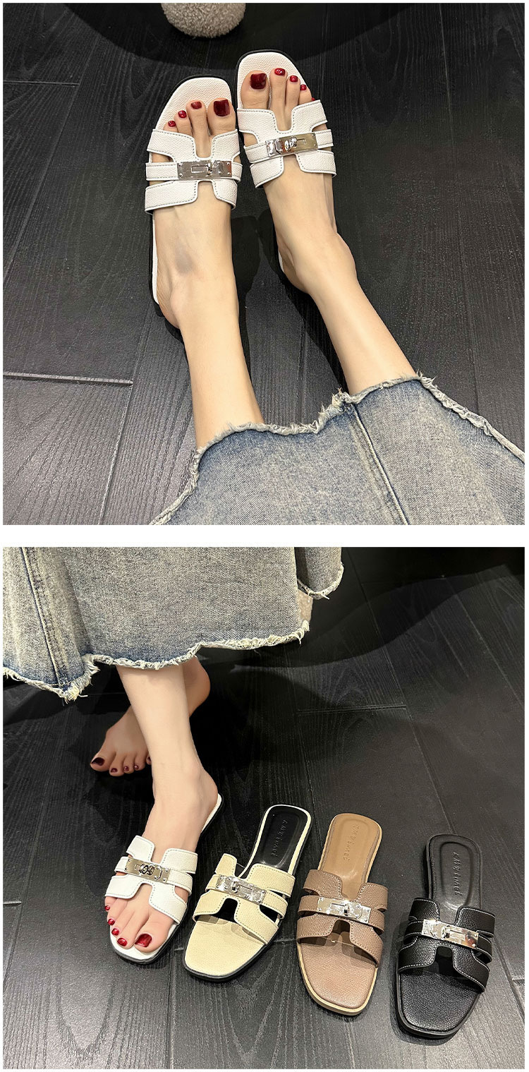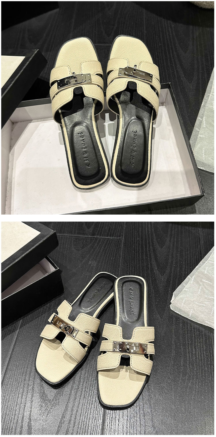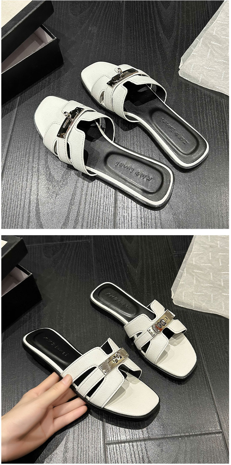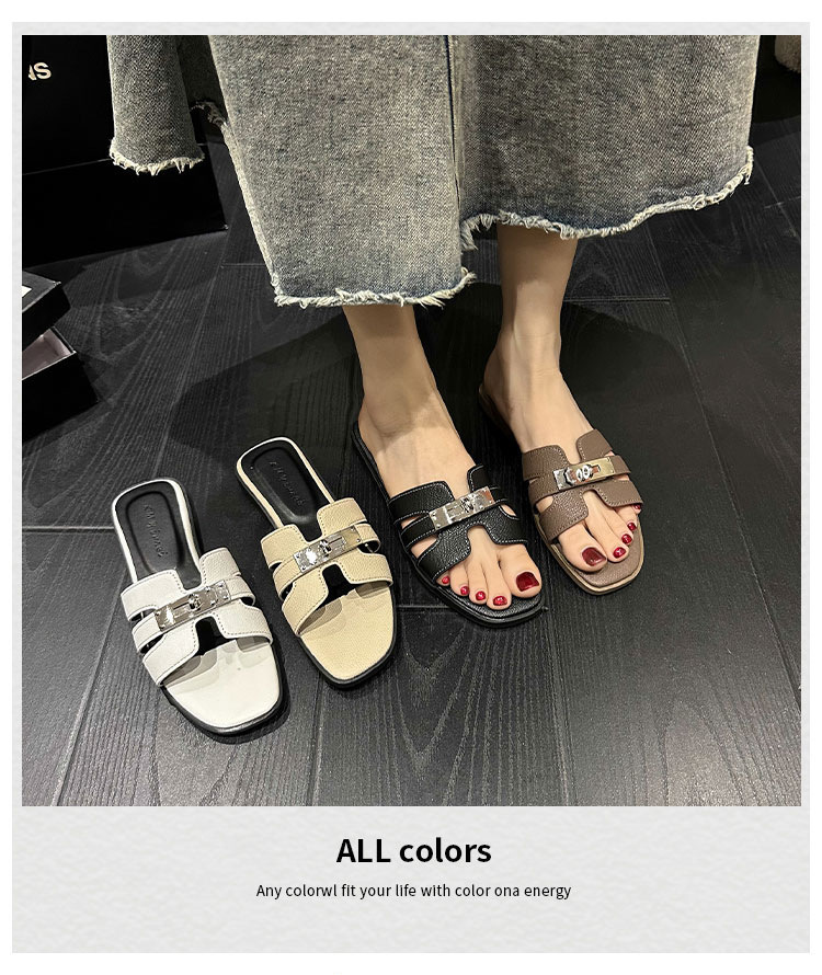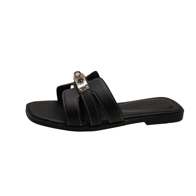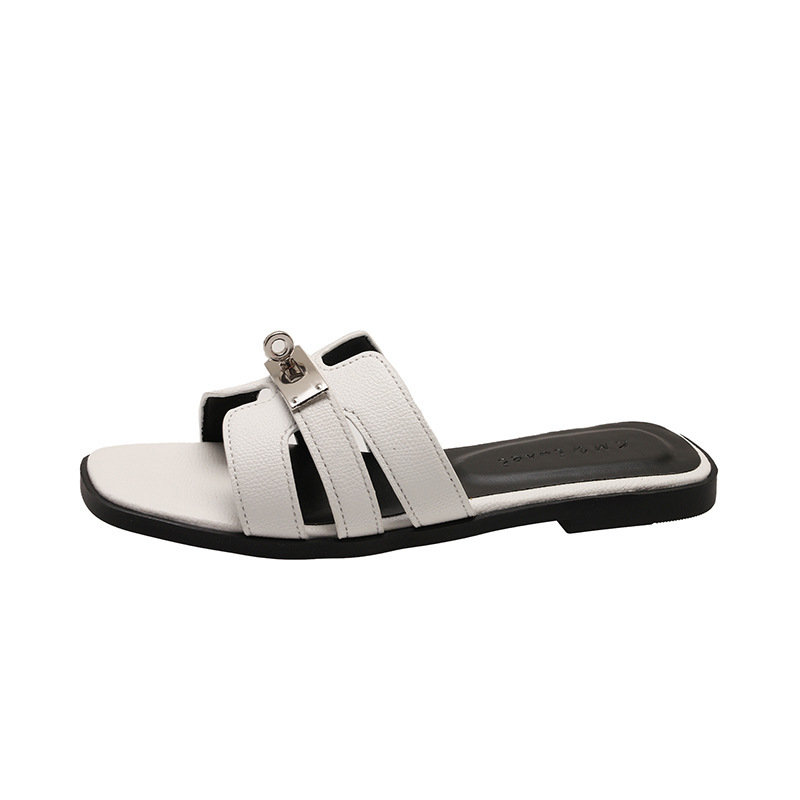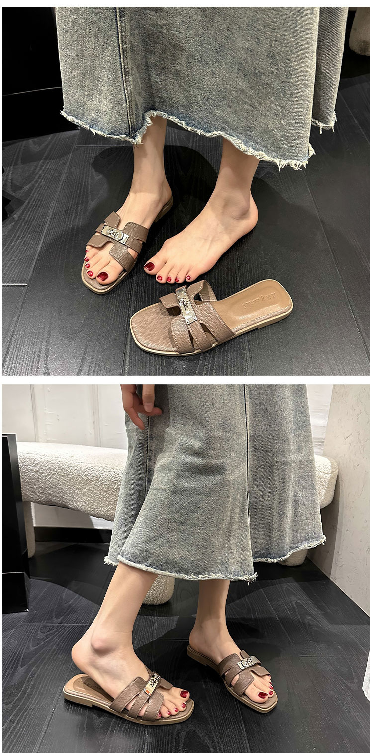 실버 작은 자물쇠 플랫 슬리퍼 여성 여름 2025 새로운 도착 슬라이드 슬리퍼 휴가 유행 의류 프렌치 샌들