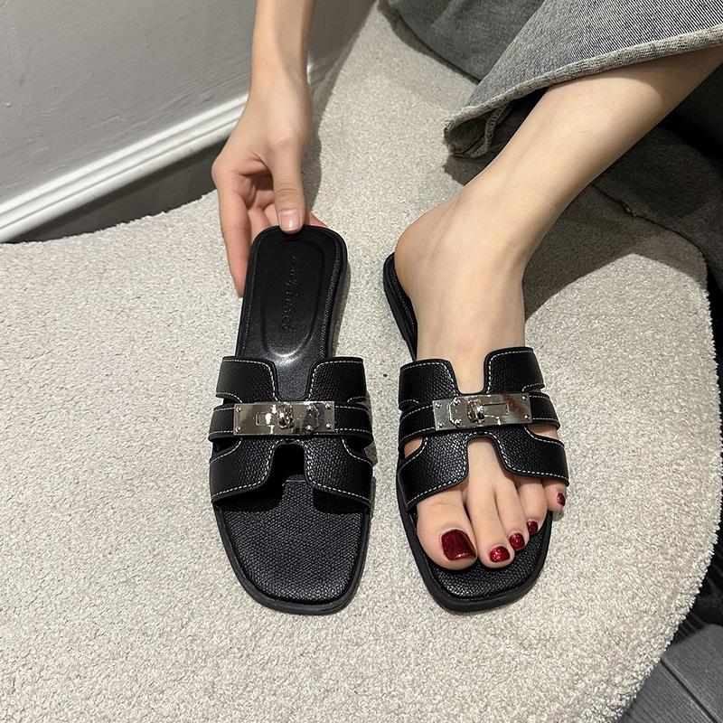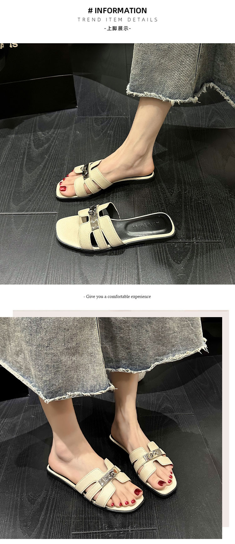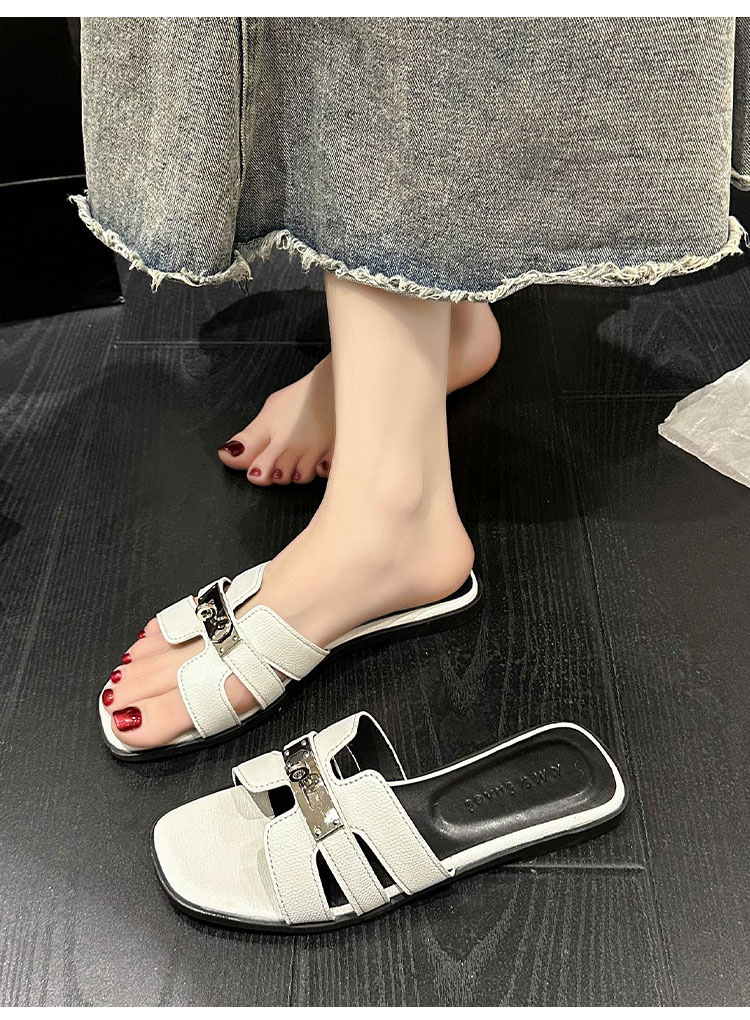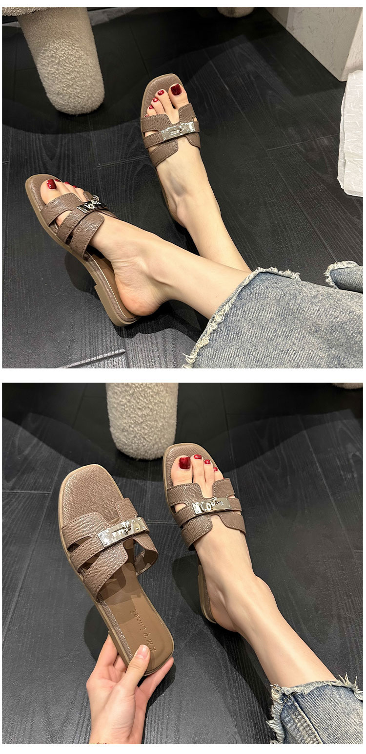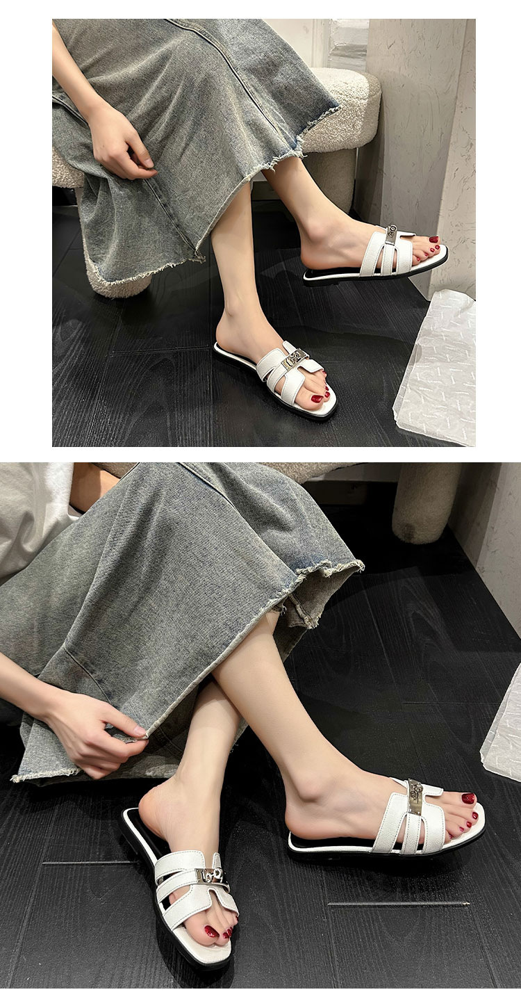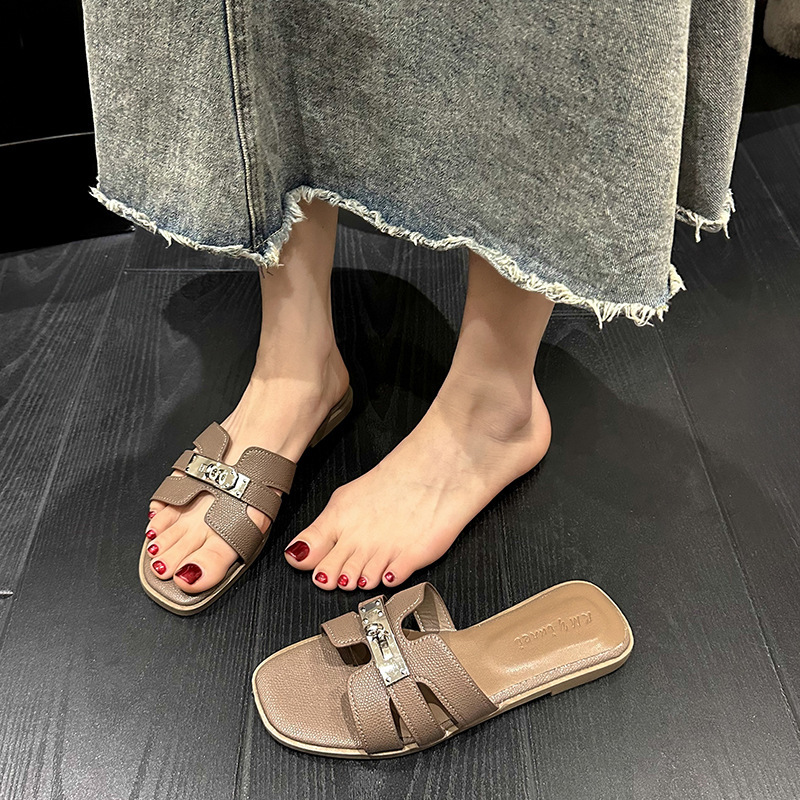 실버 작은 자물쇠 플랫 슬리퍼 여성 여름 2025 새로운 도착 슬라이드 슬리퍼 휴가 유행 의류 프렌치 샌들