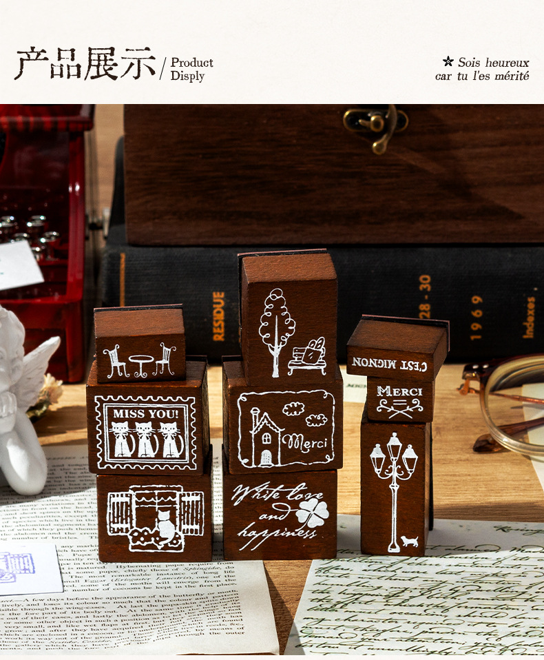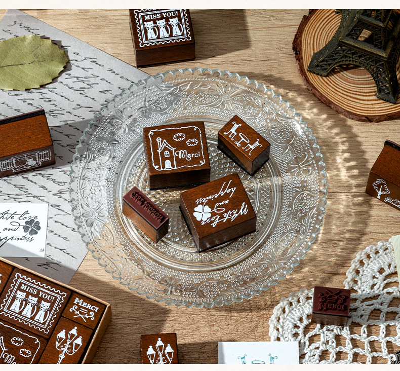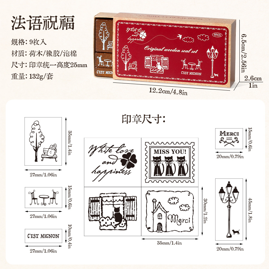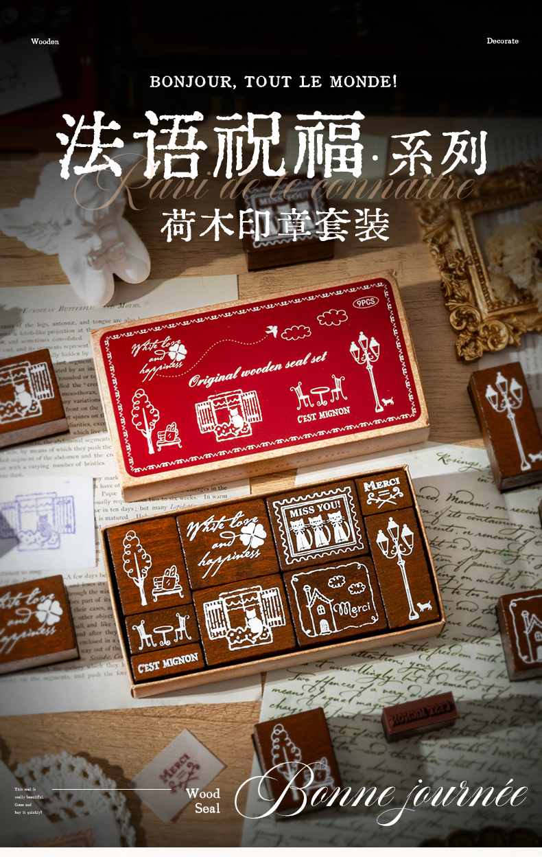 프랑스어 축복 문구 씰 세트, 크로스보더 복고풍 로터스 나무 핸드북 씰, 고급 핸드북 씰 9개