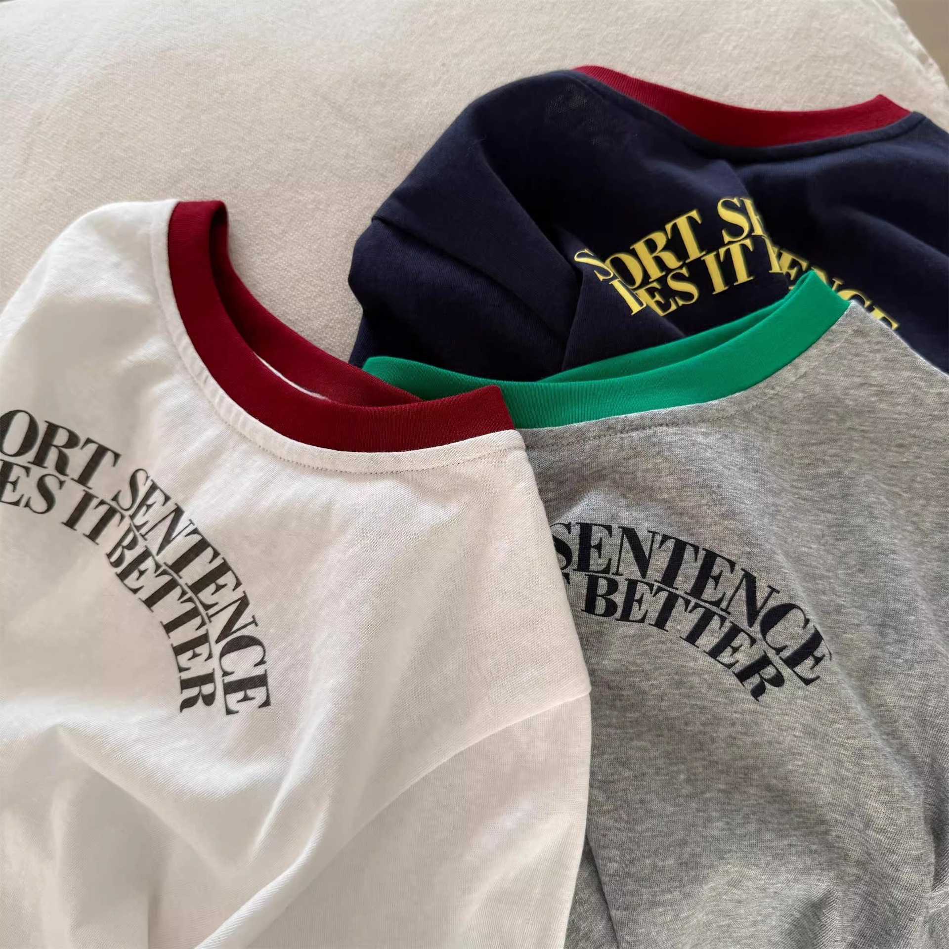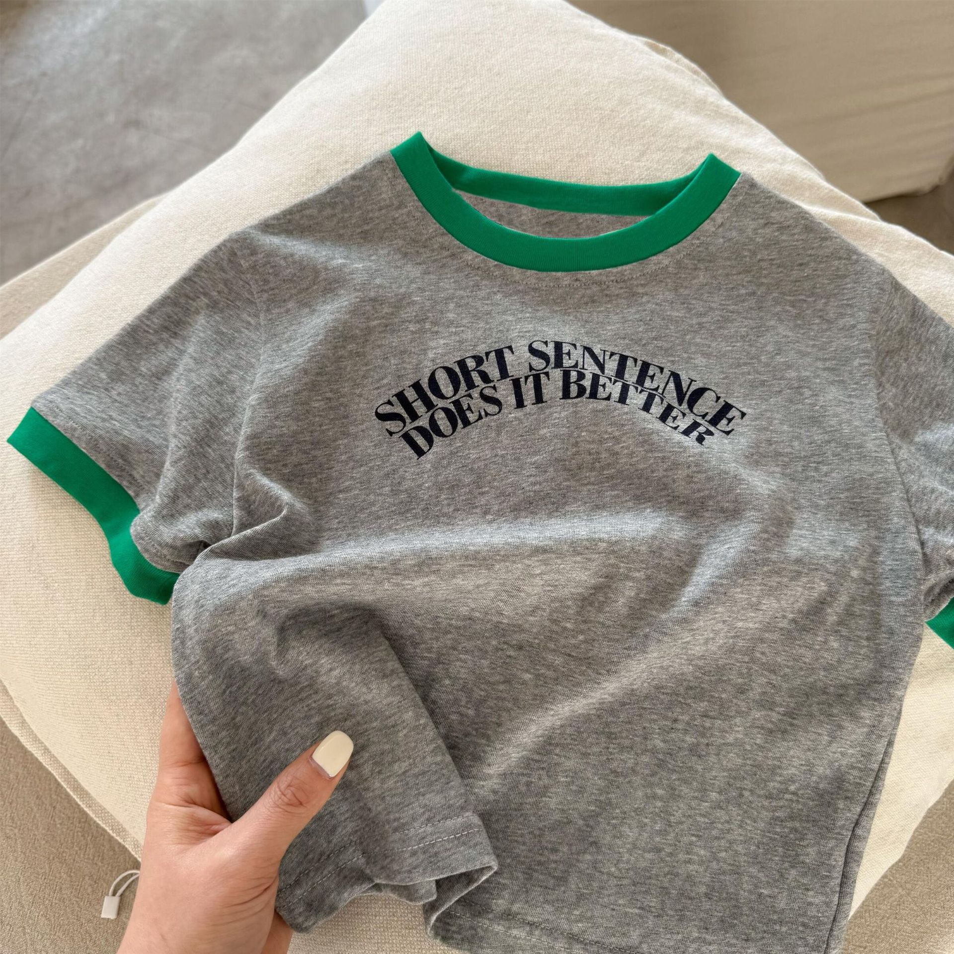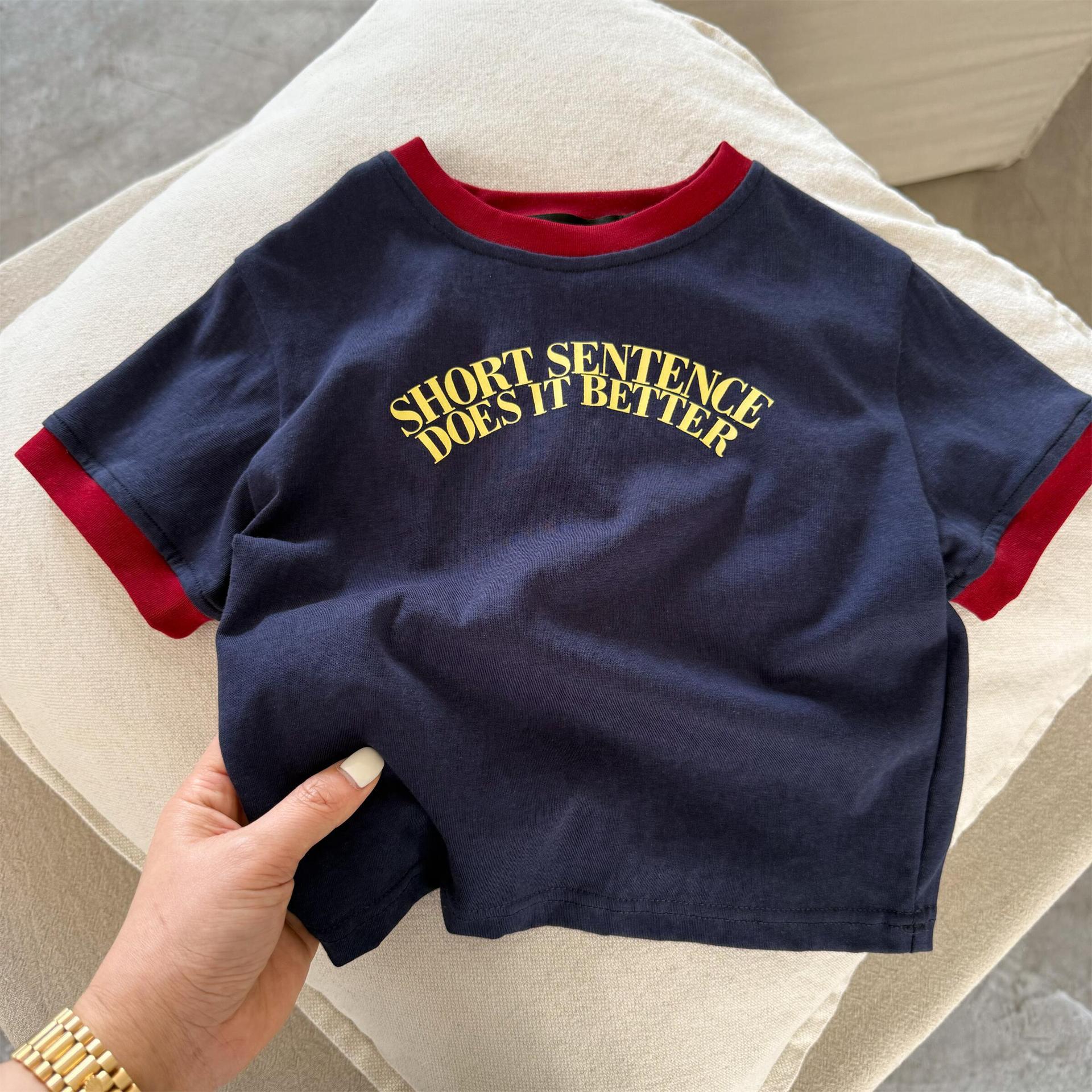 2025년 여름 신작 남학생과 여학생을 위한 아동용 반팔 티셔츠 한국식 문자 프린트 순면 대비 컬러 트렌디 탑
