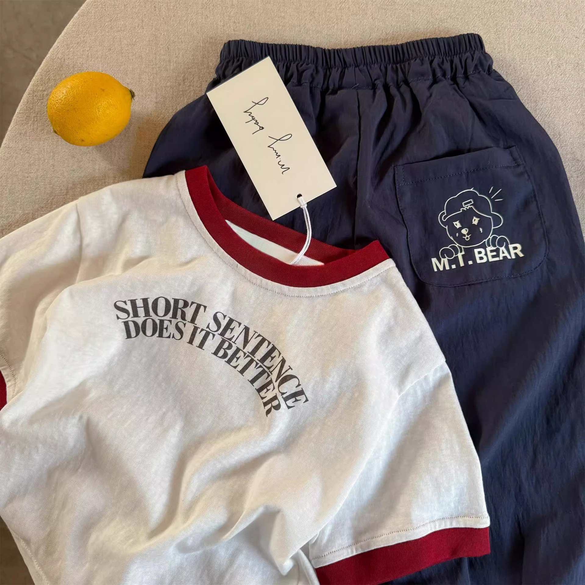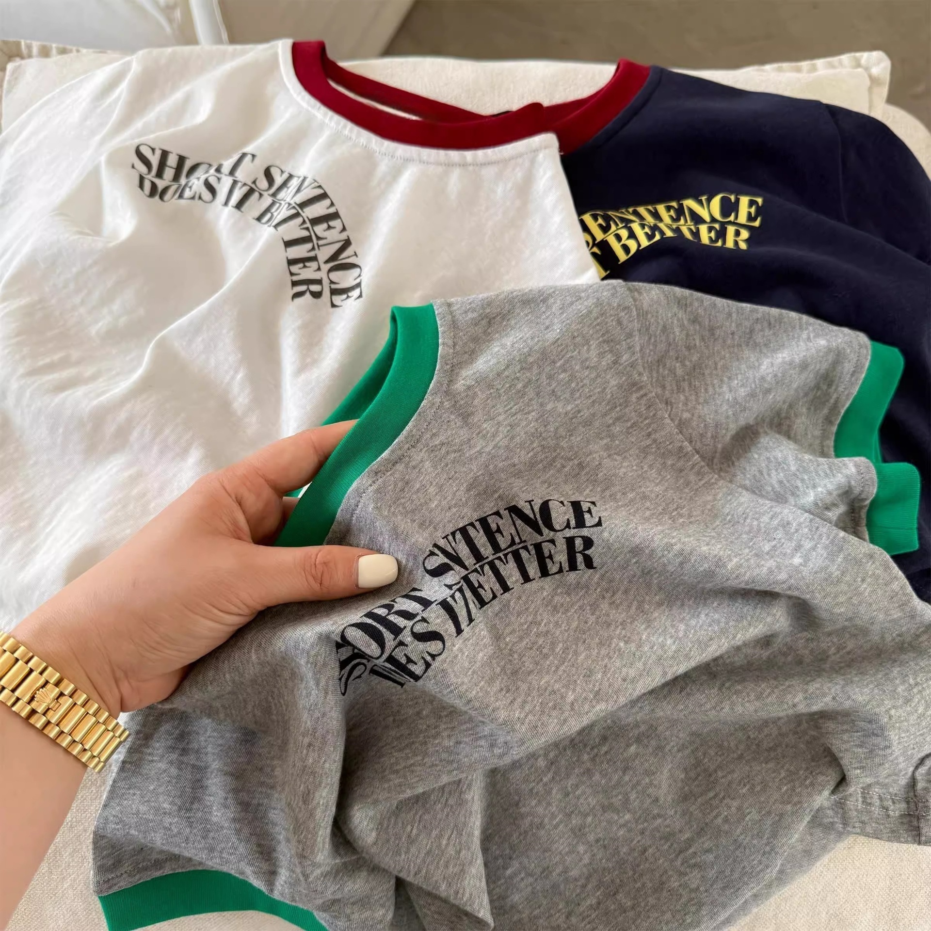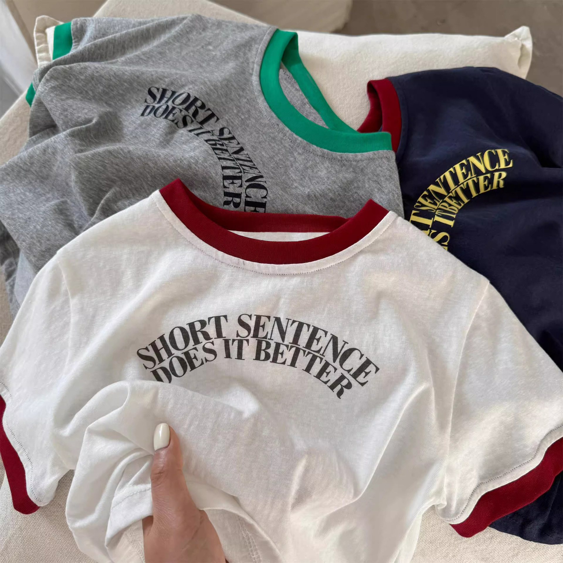 2025년 여름 신작 남학생과 여학생을 위한 아동용 반팔 티셔츠 한국식 문자 프린트 순면 대비 컬러 트렌디 탑