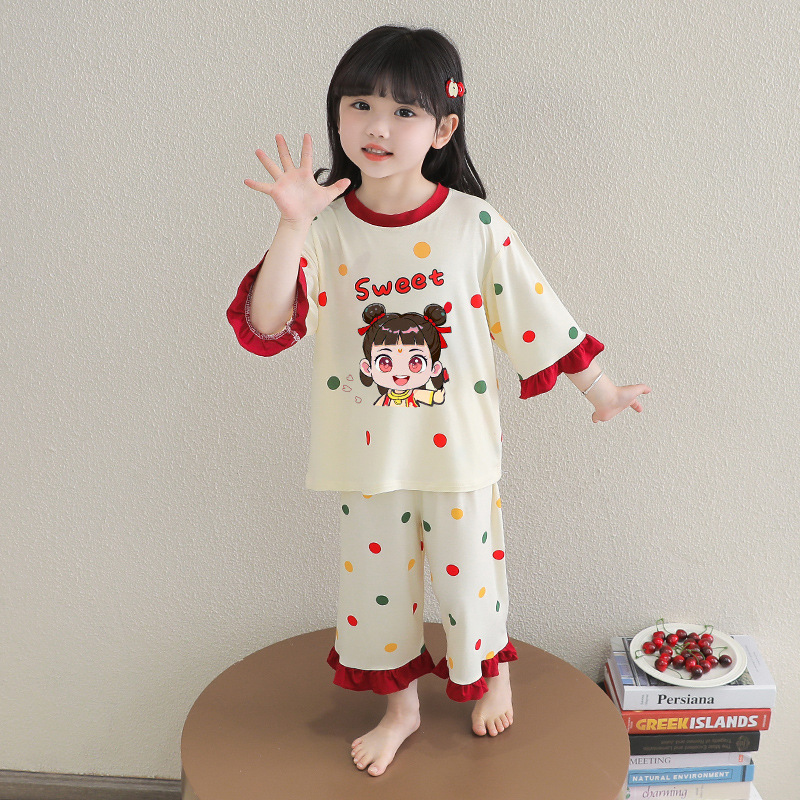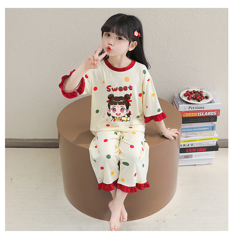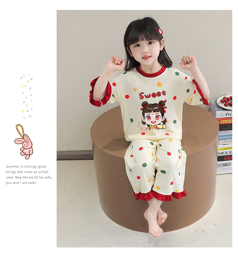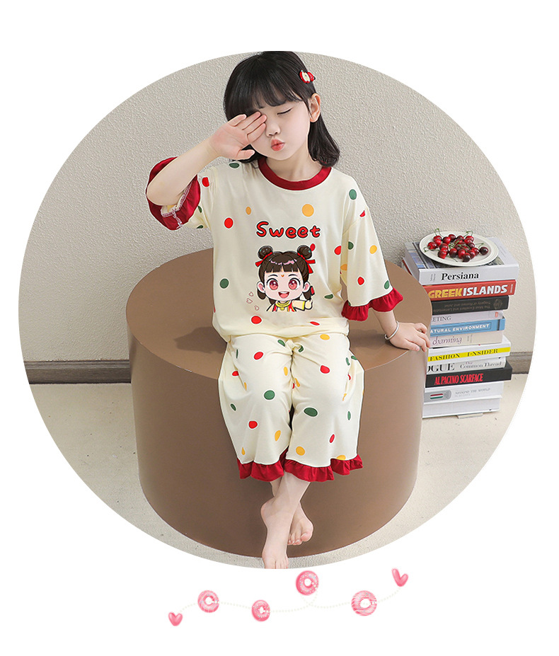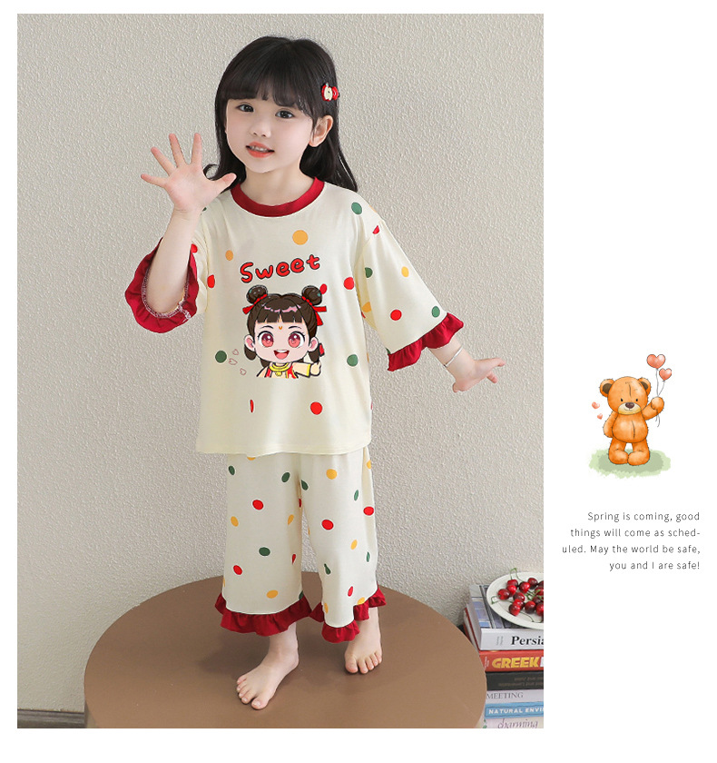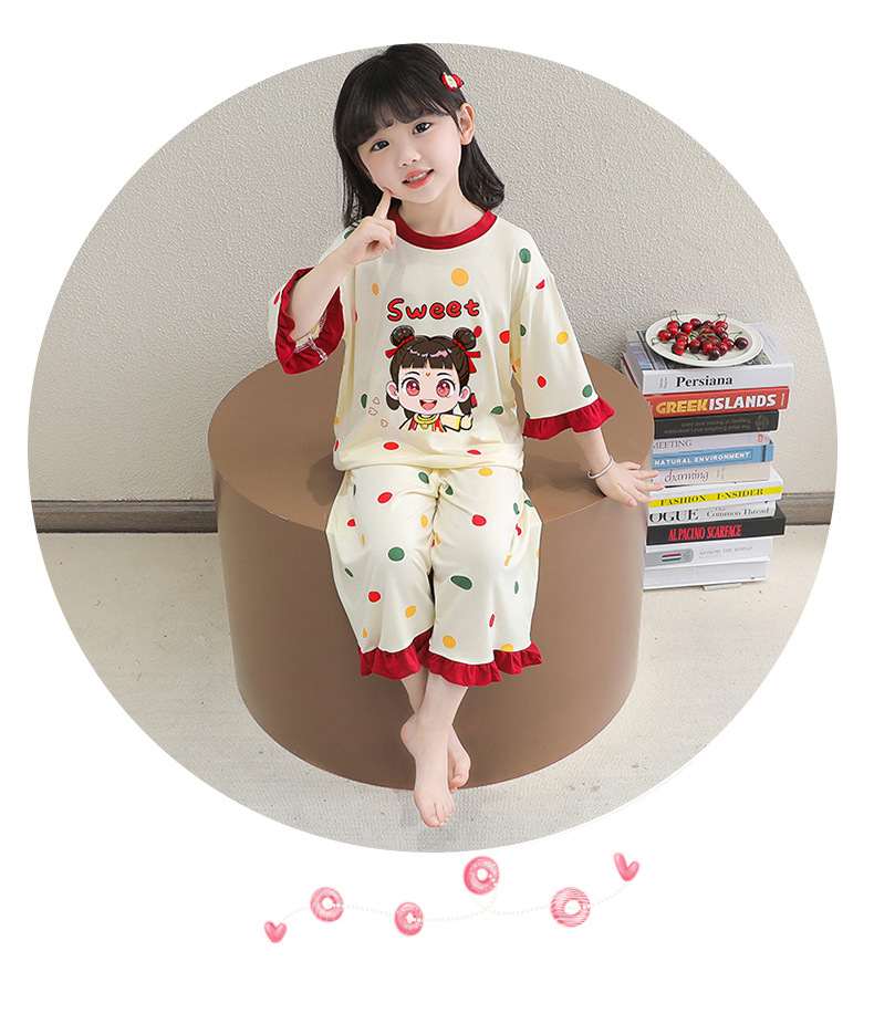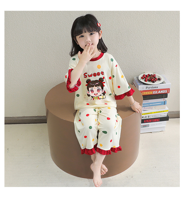 소녀 잠옷 2025 새로운 어린이 여름 7 점 소매 세트 만화 귀여운 레이스 홈 의류 세트