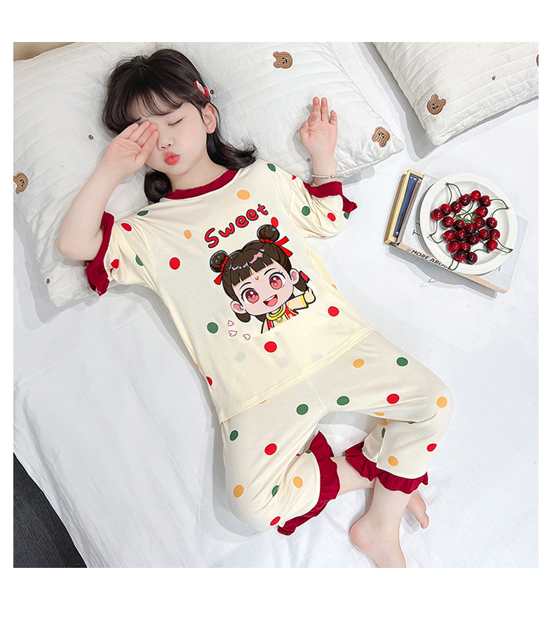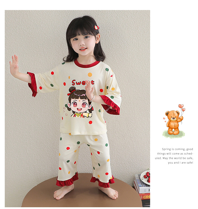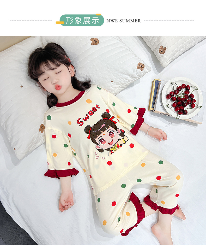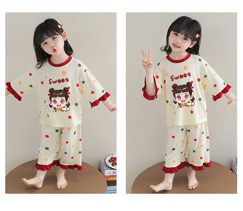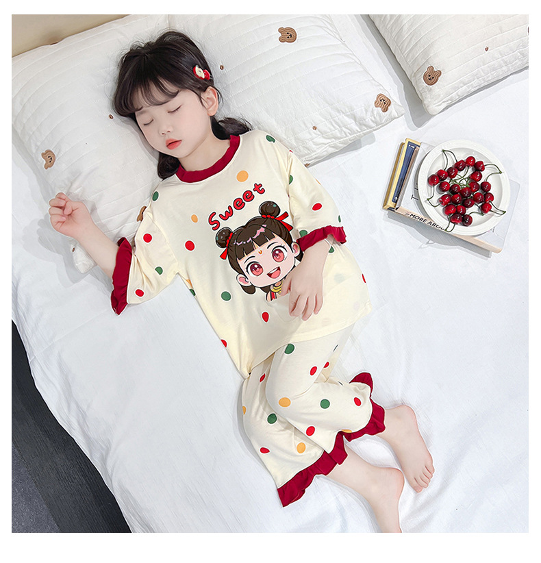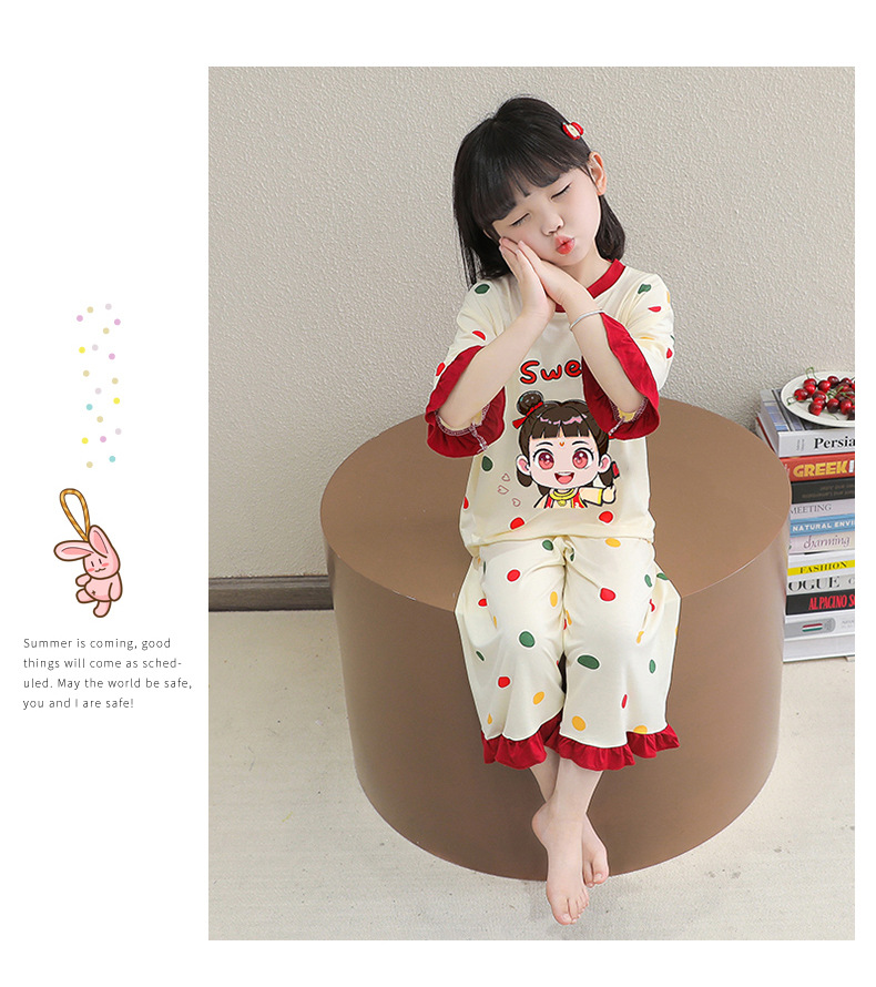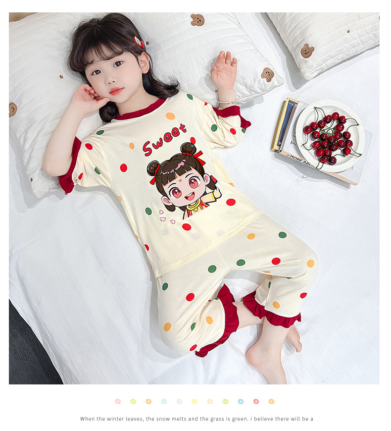 소녀 잠옷 2025 새로운 어린이 여름 7 점 소매 세트 만화 귀여운 레이스 홈 의류 세트