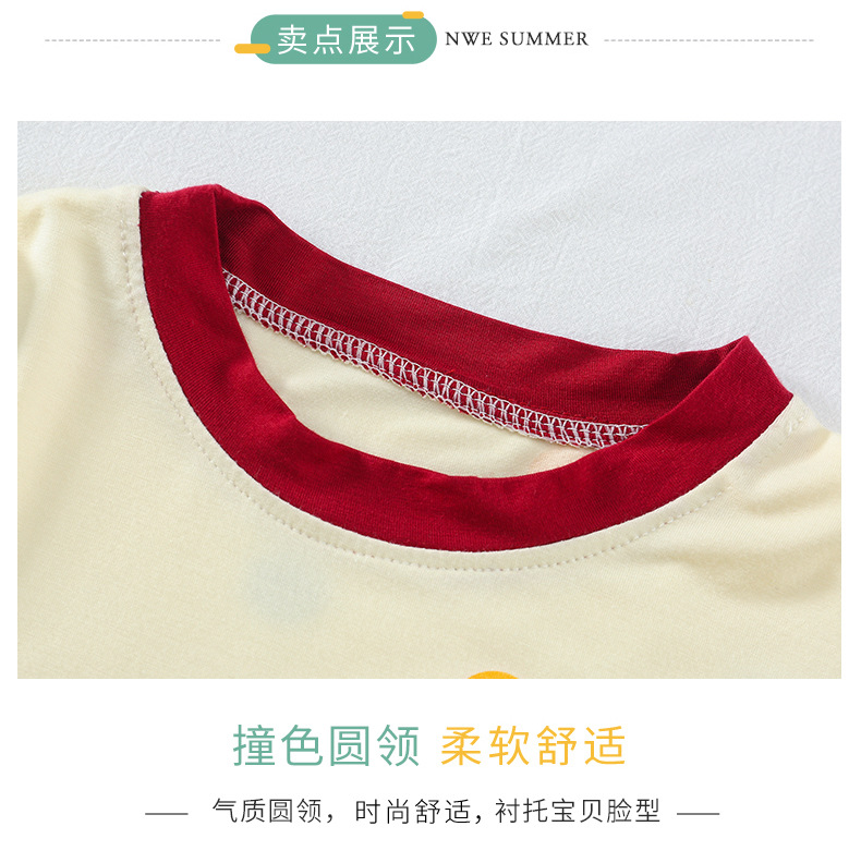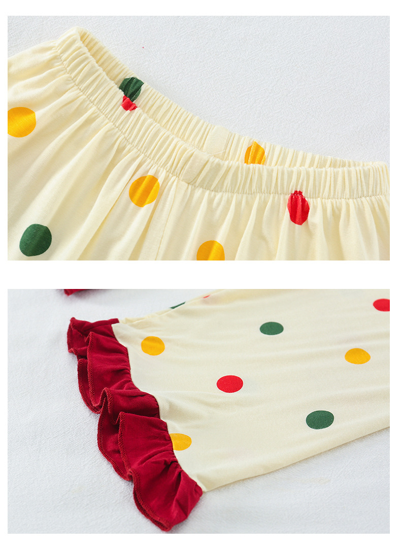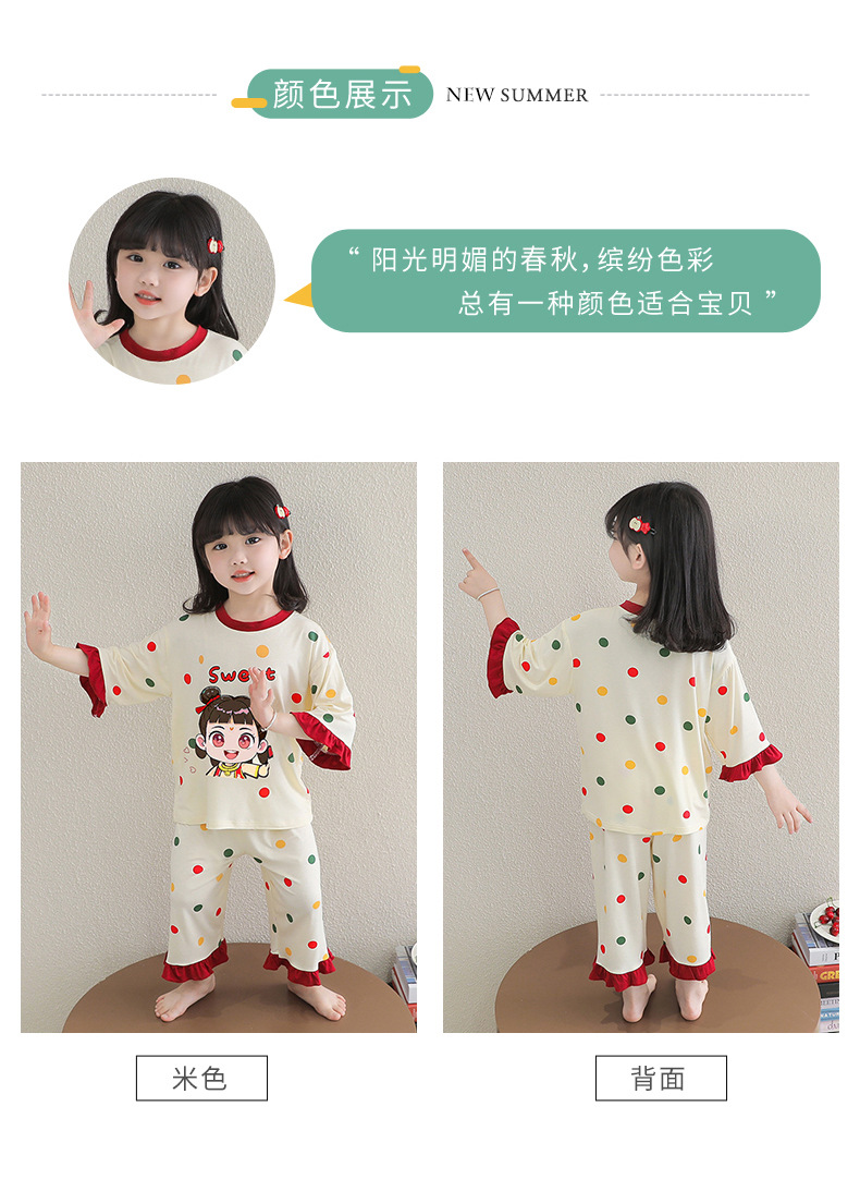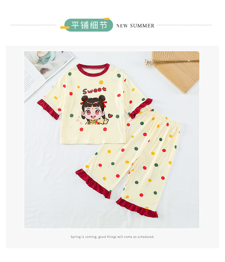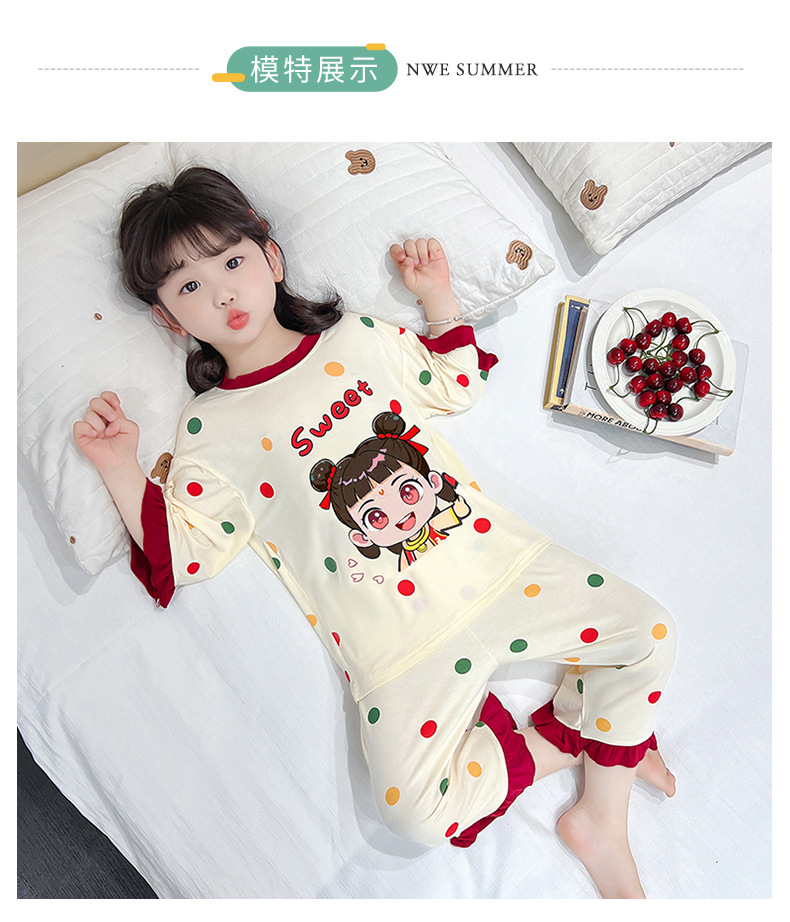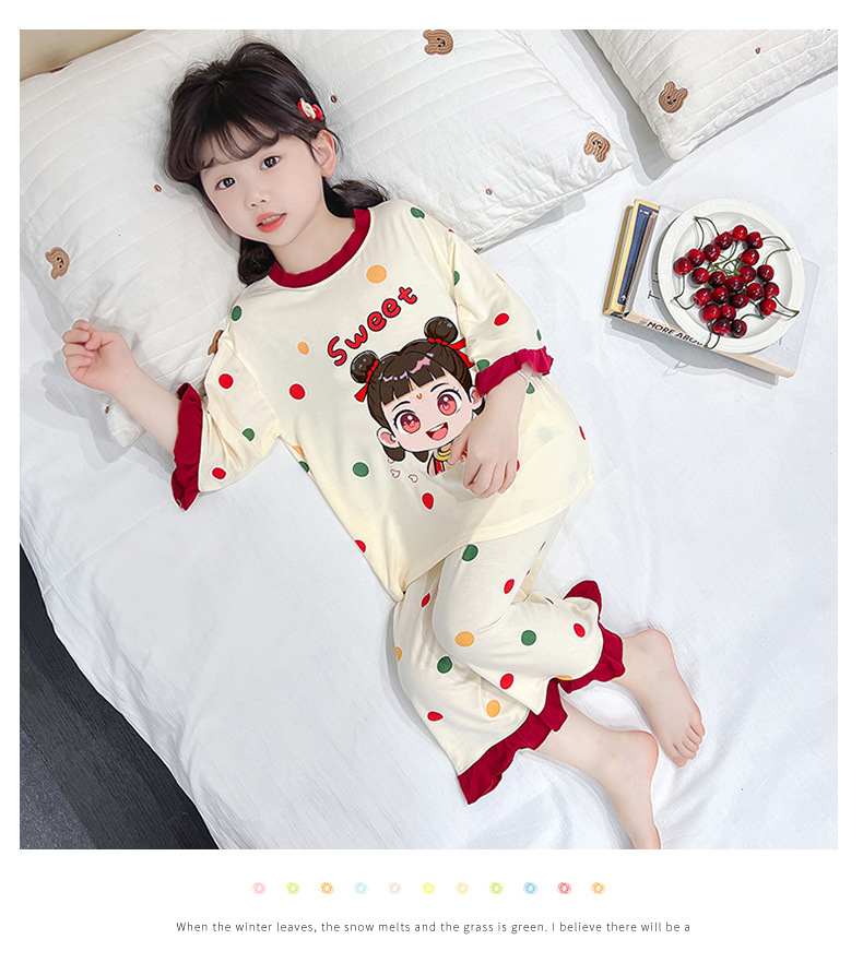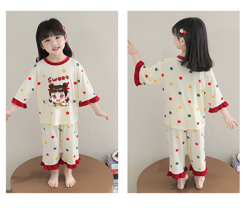 소녀 잠옷 2025 새로운 어린이 여름 7 점 소매 세트 만화 귀여운 레이스 홈 의류 세트
