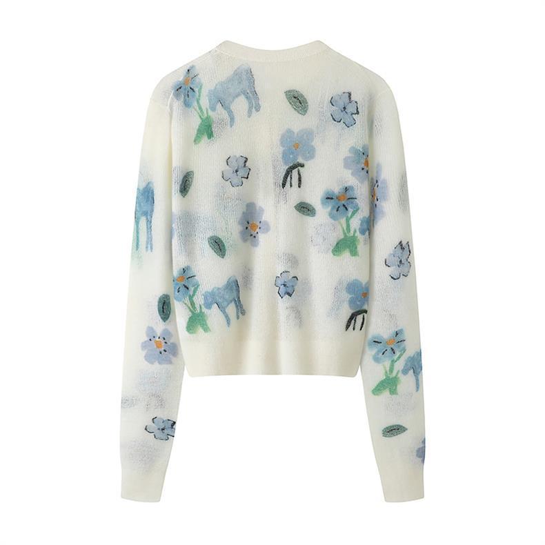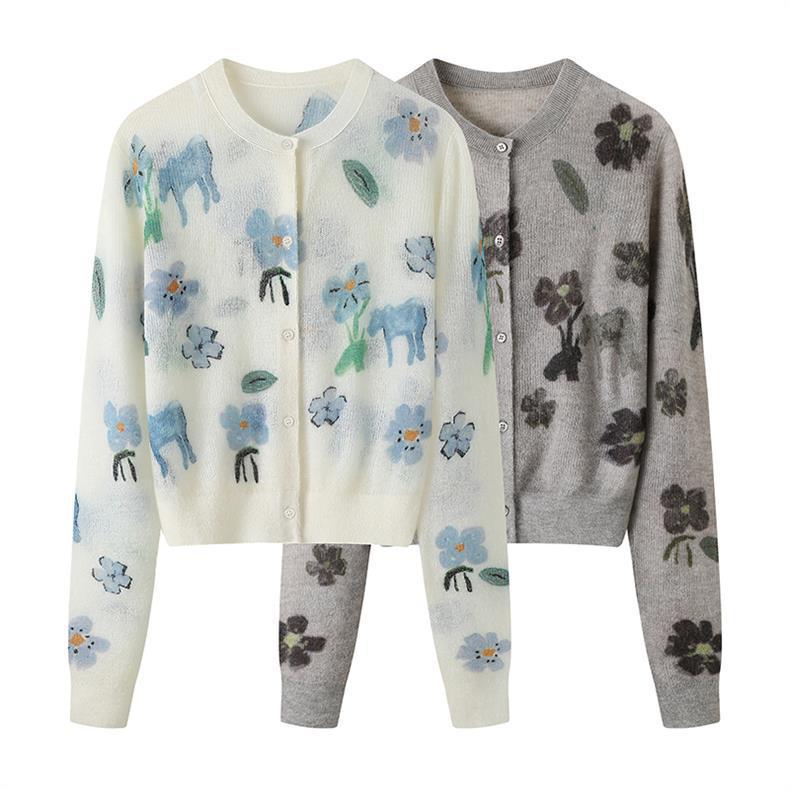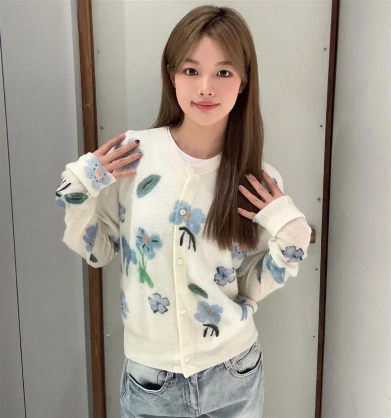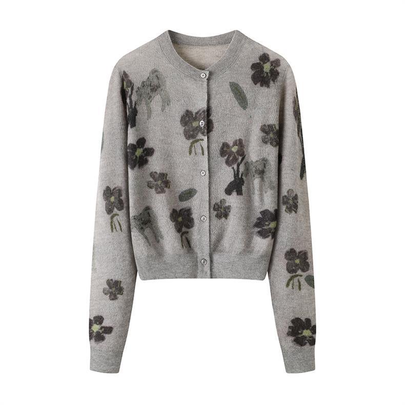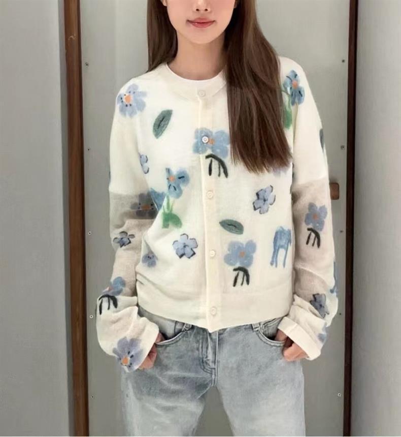 24 새로운 가을 스타일 부드럽고 왁시한 하이 엔드 꽃무늬 얇은 라운드 넥 긴팔 스웨터 여성 트렌드를 위한 틈새 게으른 스타일 카디건