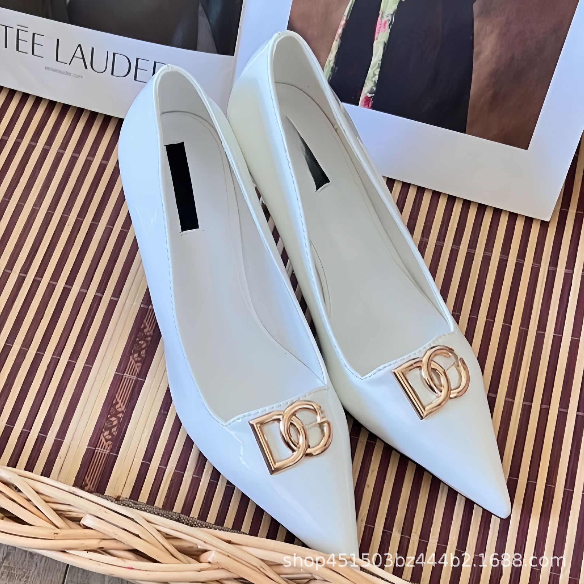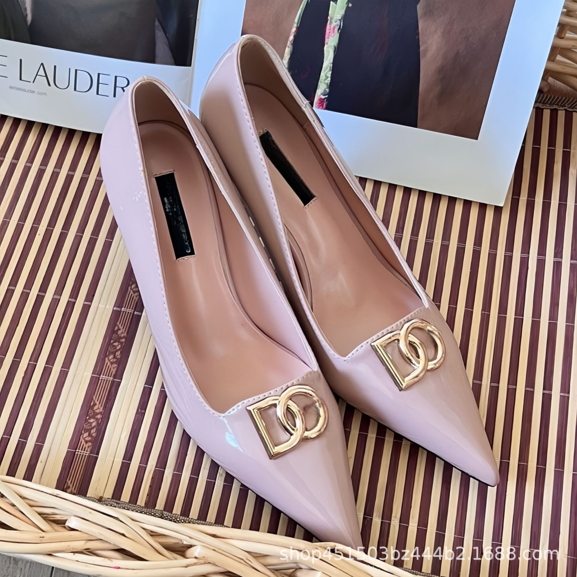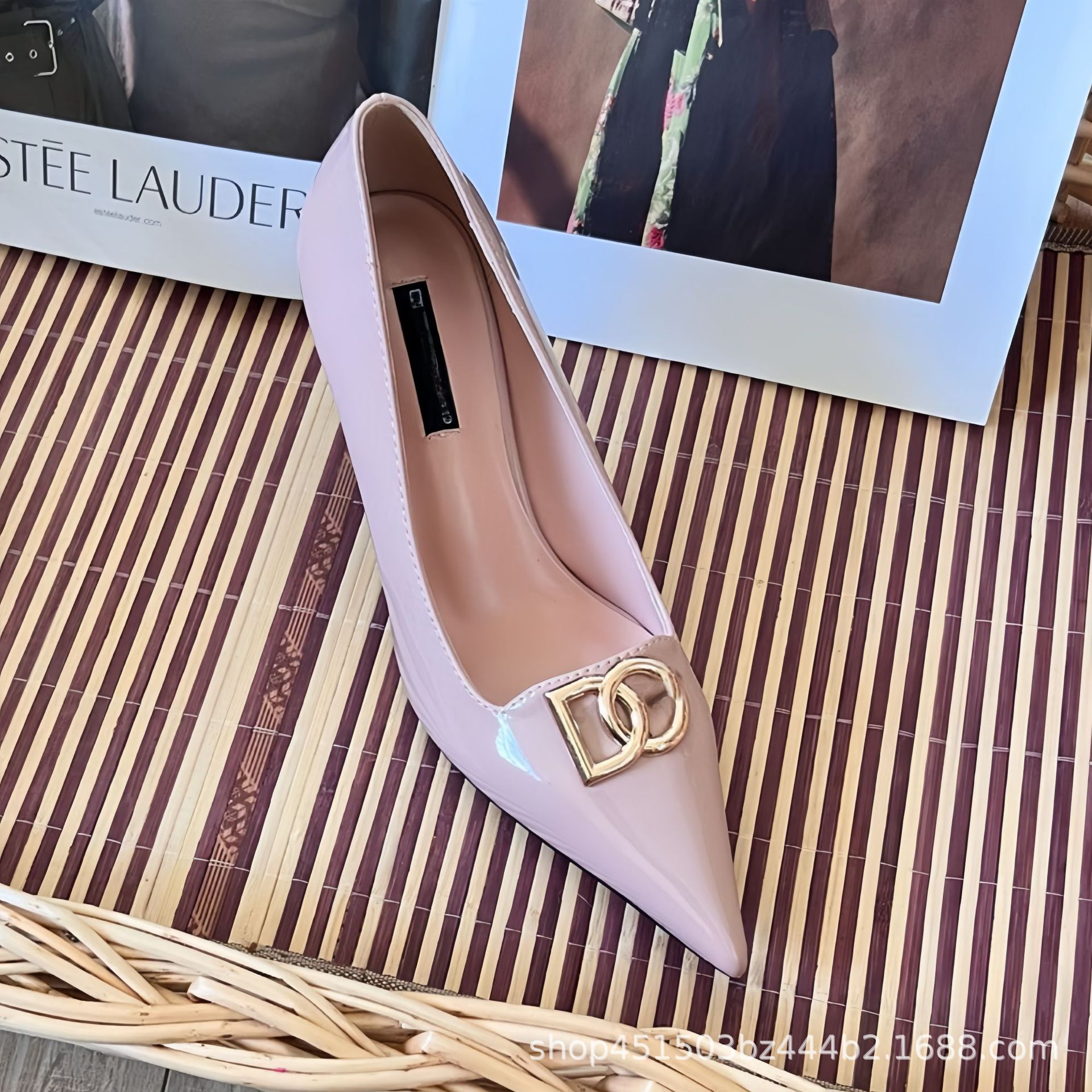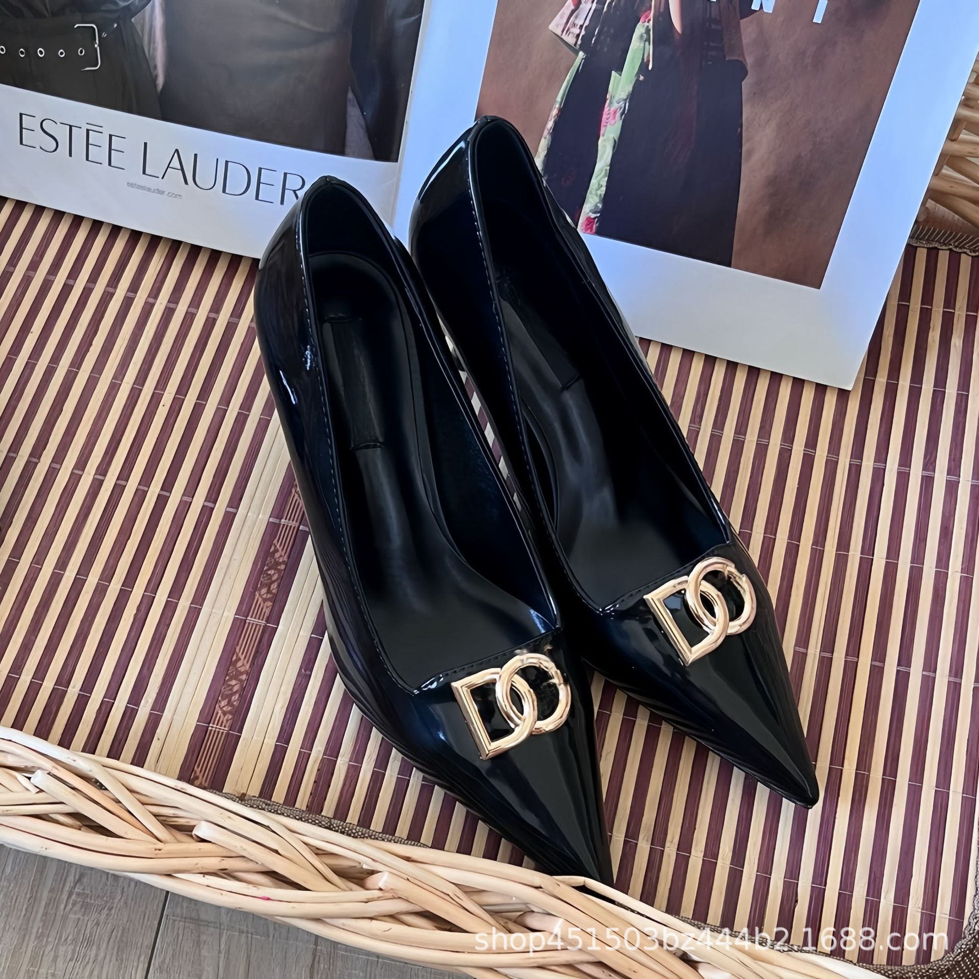2025 봄과 가을 새로운 캐주얼 패션 스틸레토 여성 신발 문자 버클 뾰족한 발가락 하이힐 대형 특허 가죽스토어 가기