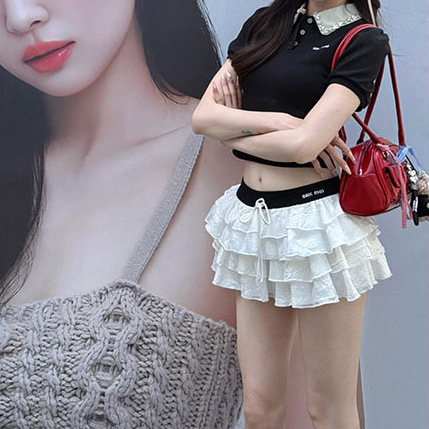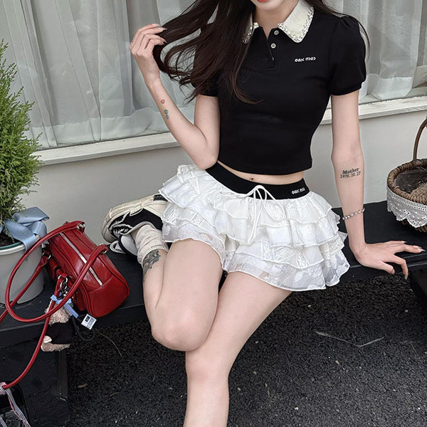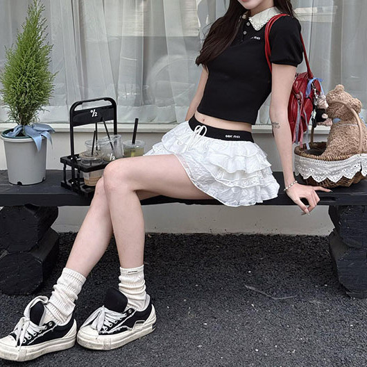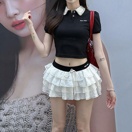 프랑스 스타일의 딸 센스 미우 스타일 세트 블랙 퍼프 소매 반팔 티셔츠 여성의 여름 높은 허리 슬리밍 케이크 스커트