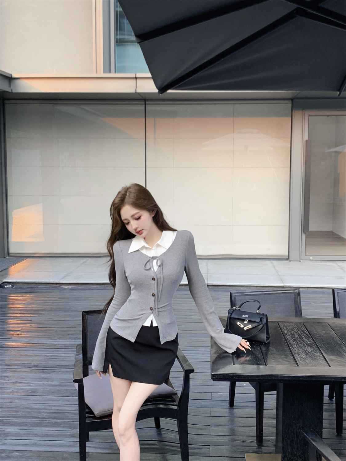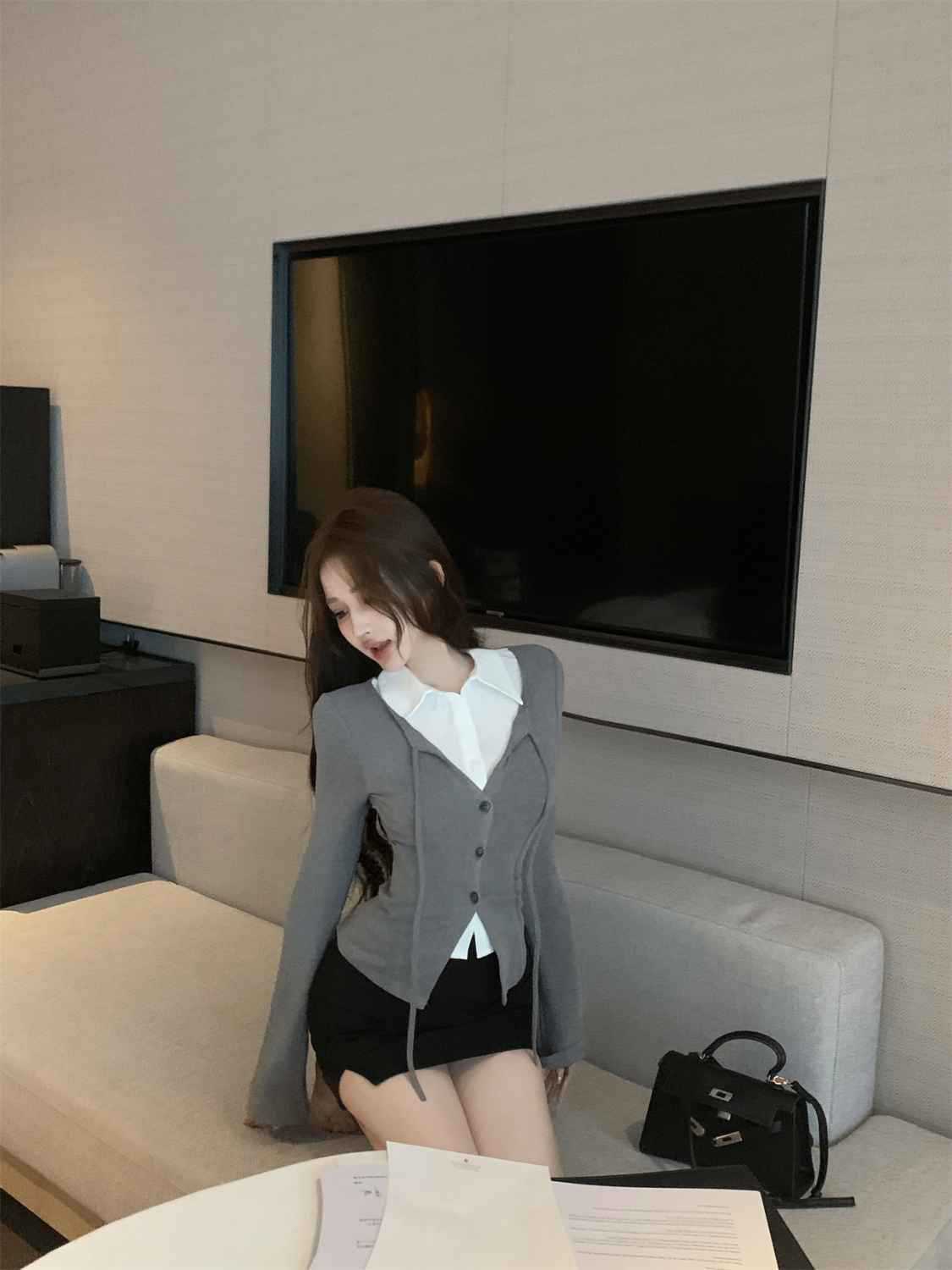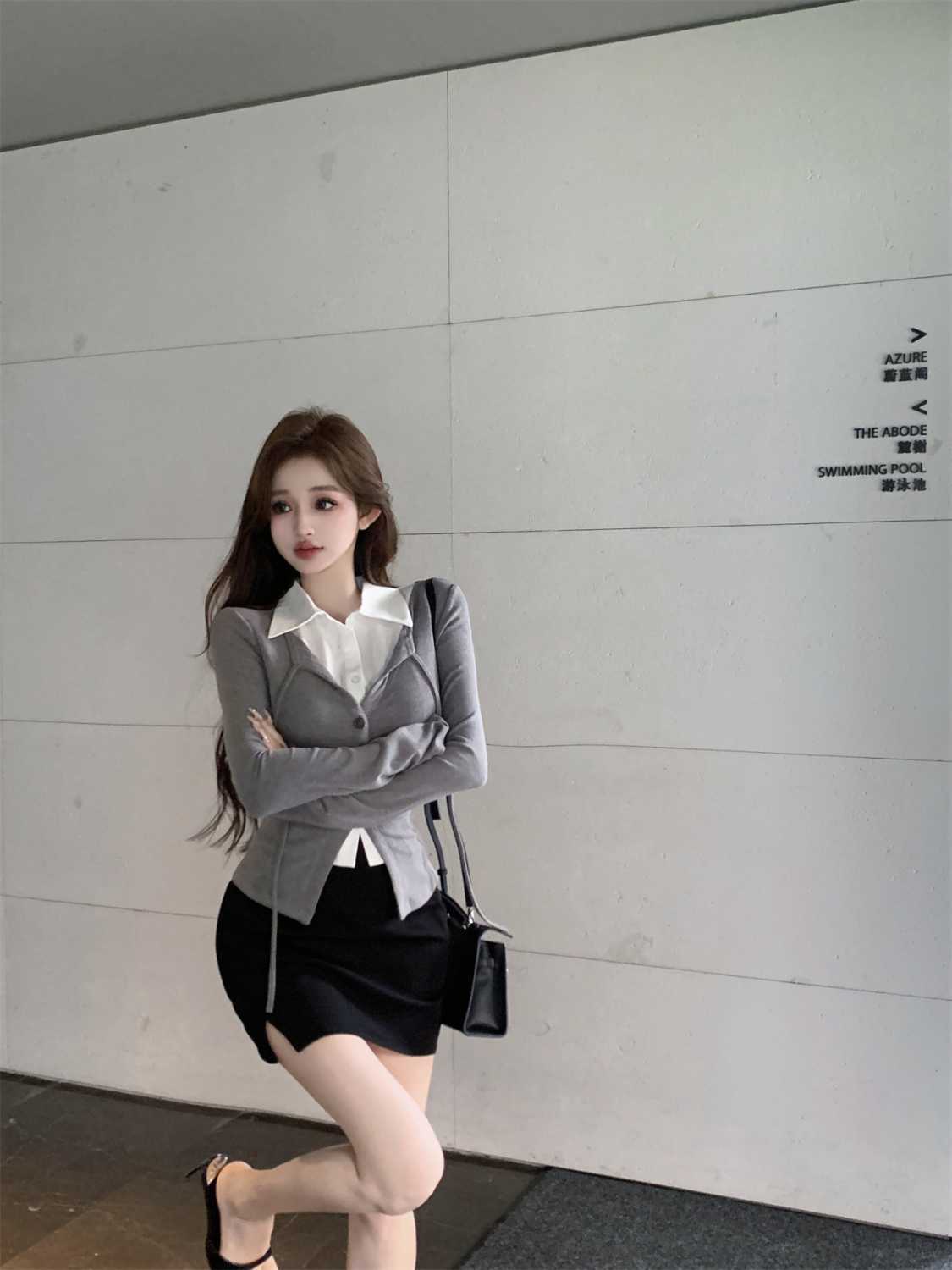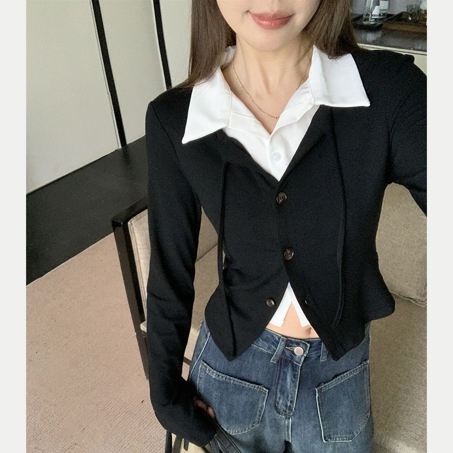 [국경 간 도매] 여성용 가짜 투피스 셔츠 여름 순수한 욕망 달콤한 핫 소녀 폴로 칼라 카디건 탑 베이스 레이어