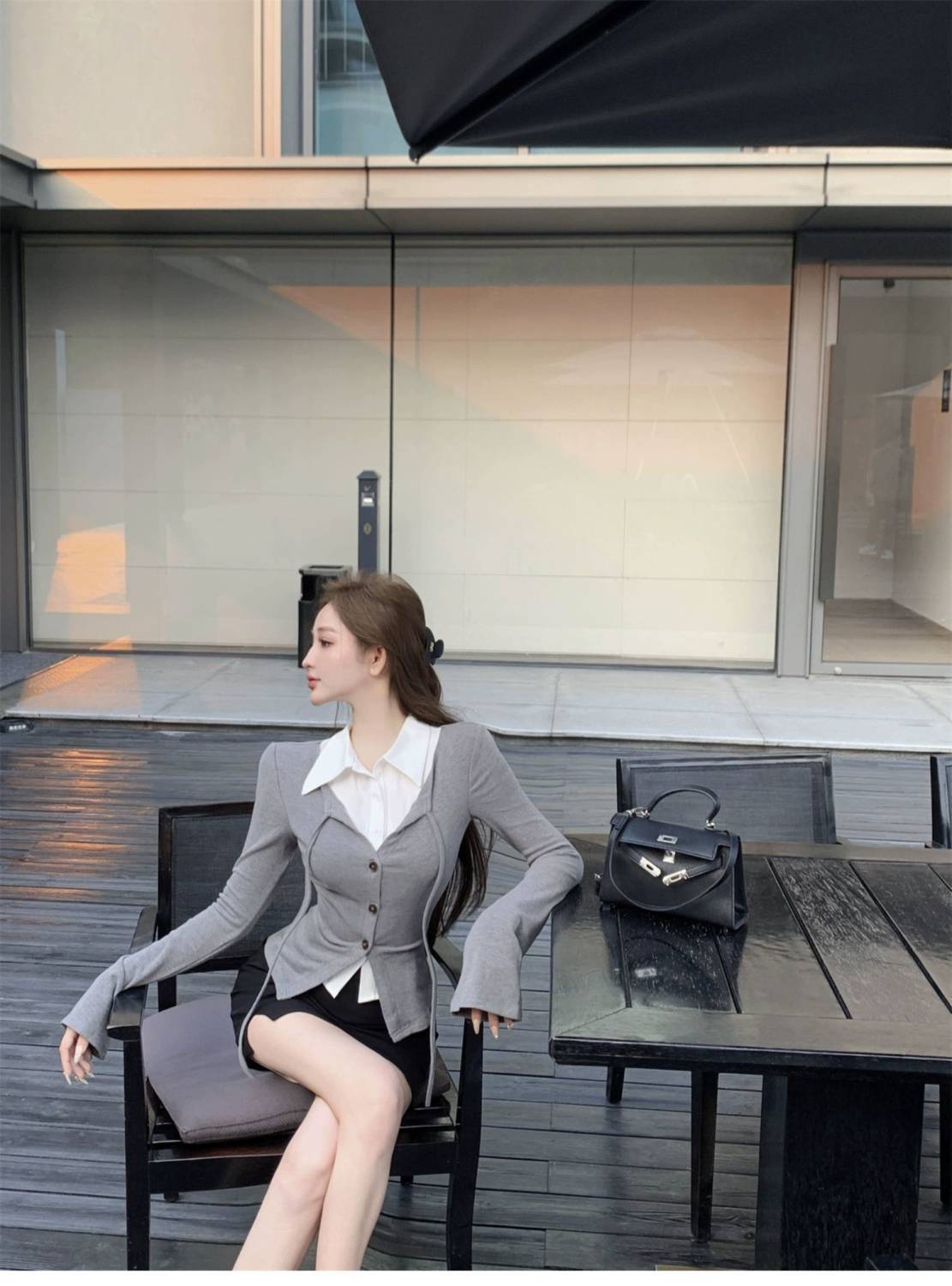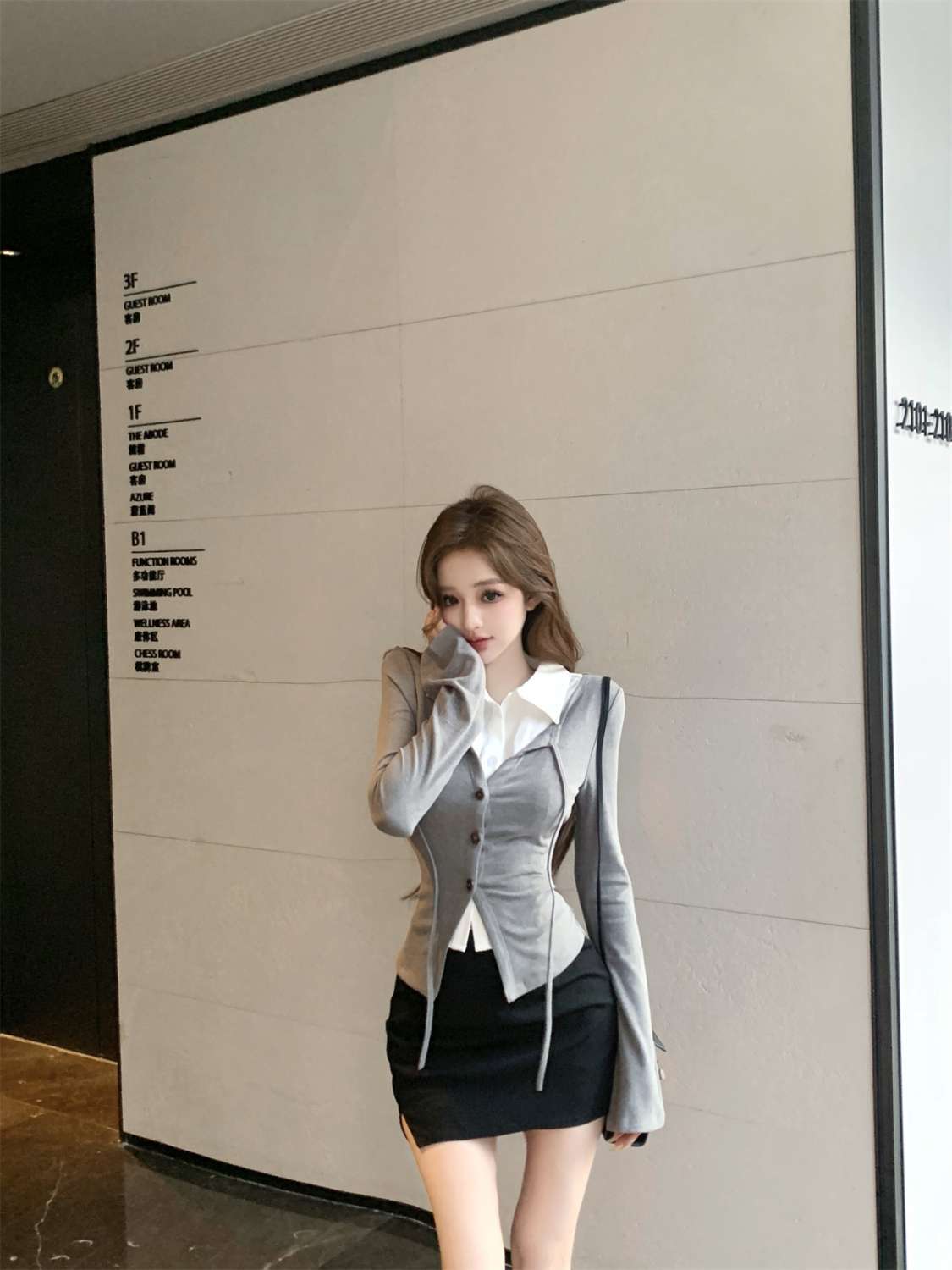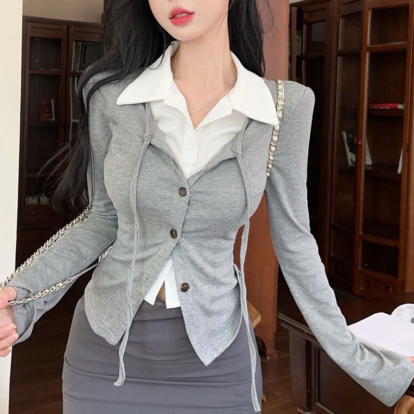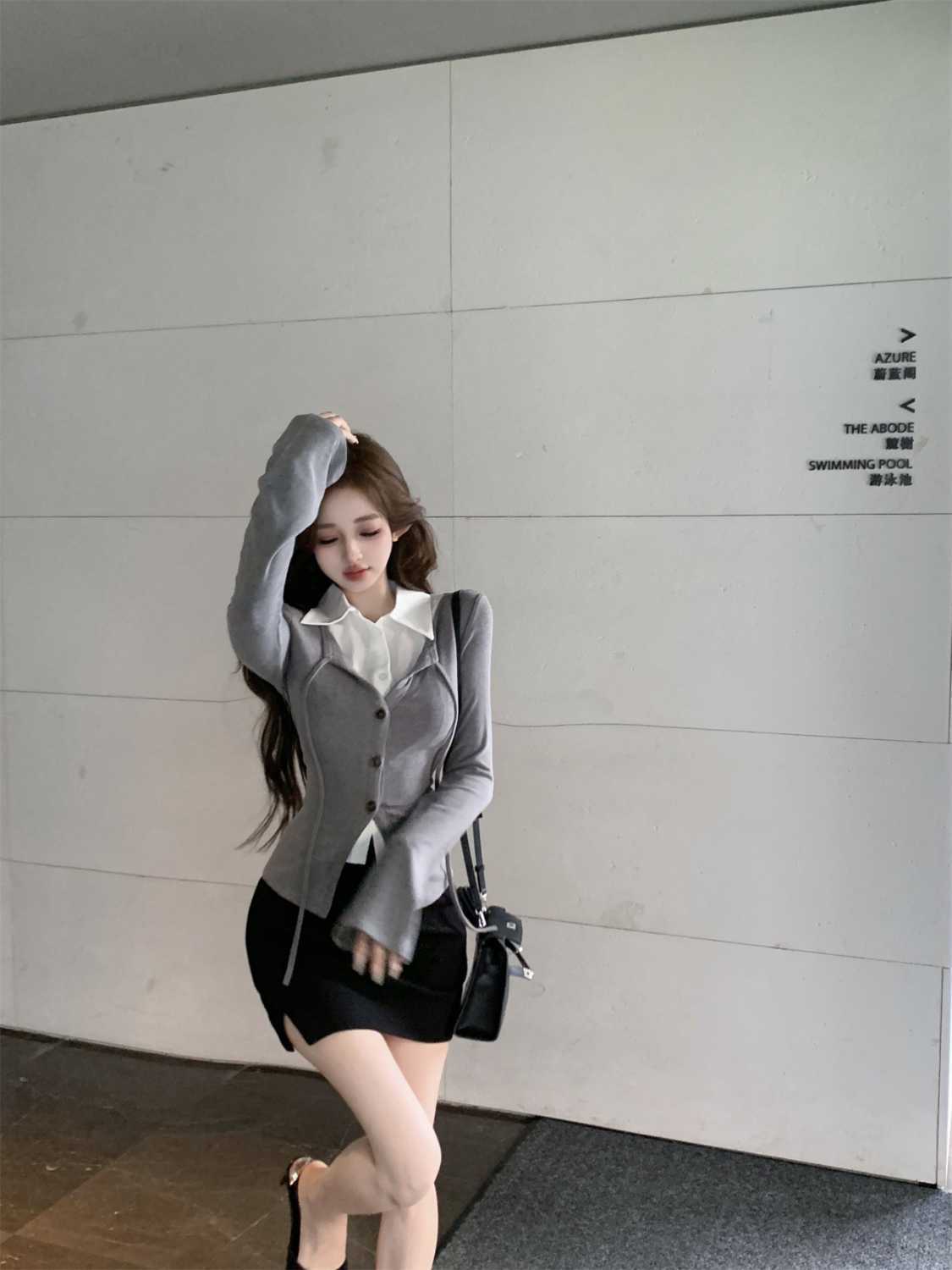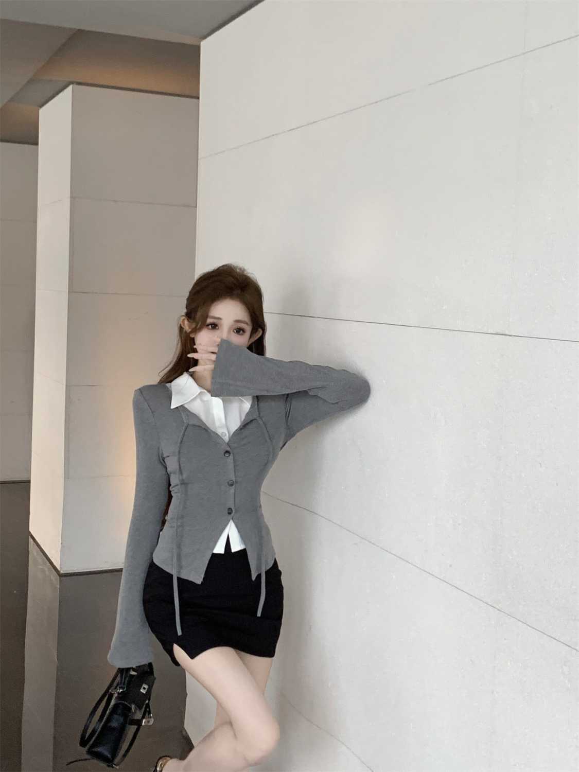 [국경 간 도매] 여성용 가짜 투피스 셔츠 여름 순수한 욕망 달콤한 핫 소녀 폴로 칼라 카디건 탑 베이스 레이어