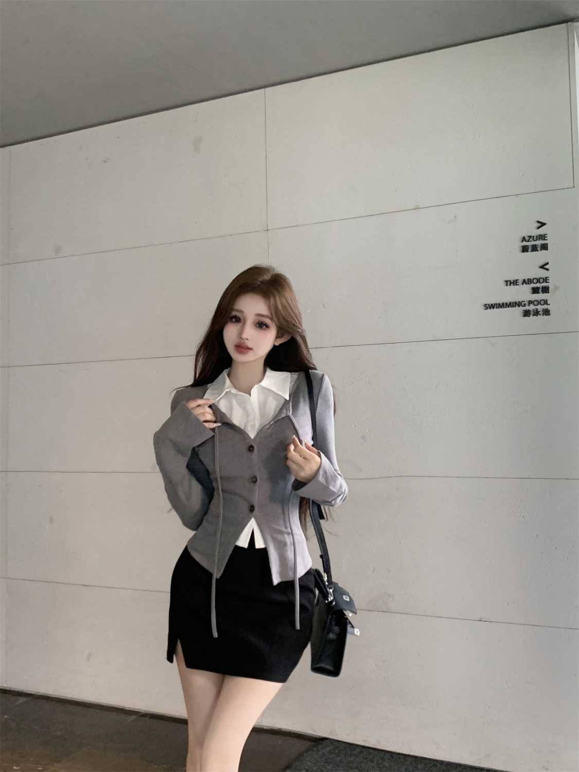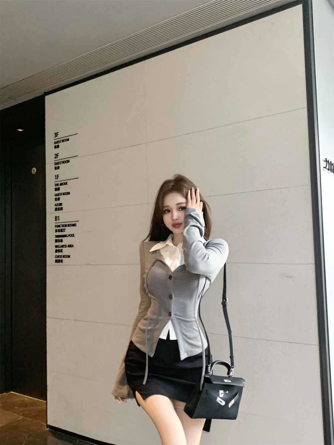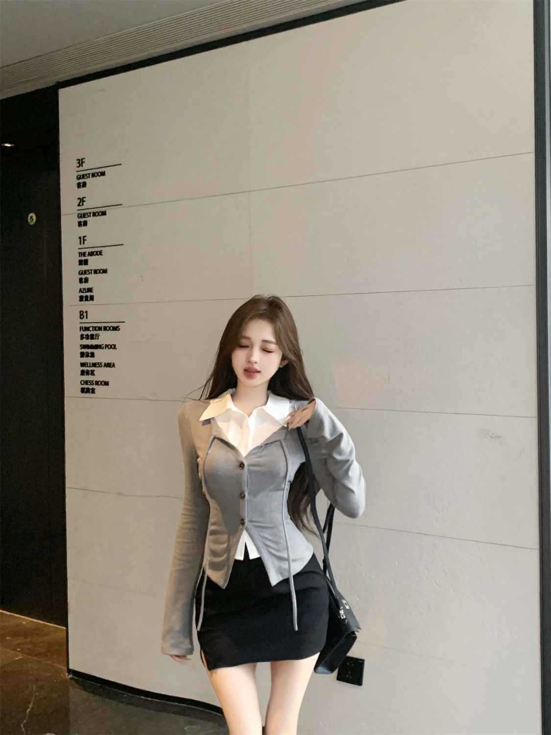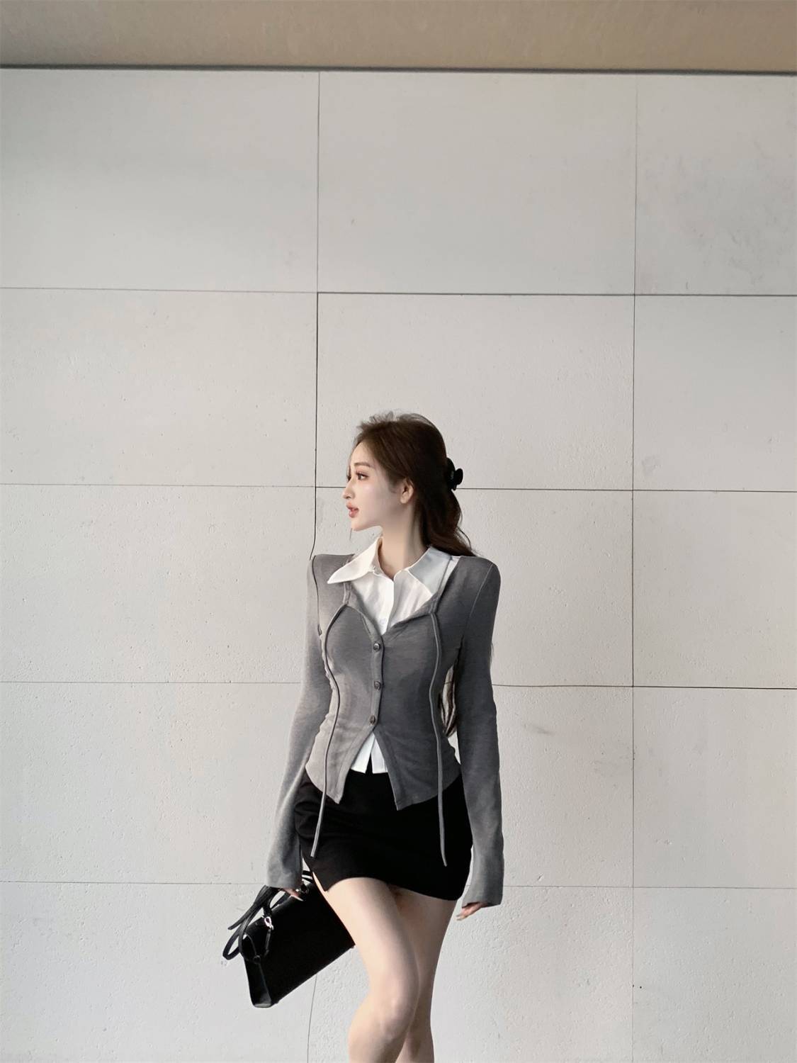 [국경 간 도매] 여성용 가짜 투피스 셔츠 여름 순수한 욕망 달콤한 핫 소녀 폴로 칼라 카디건 탑 베이스 레이어