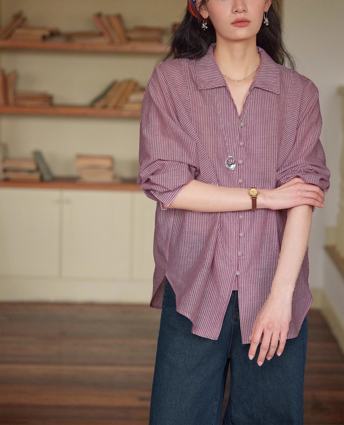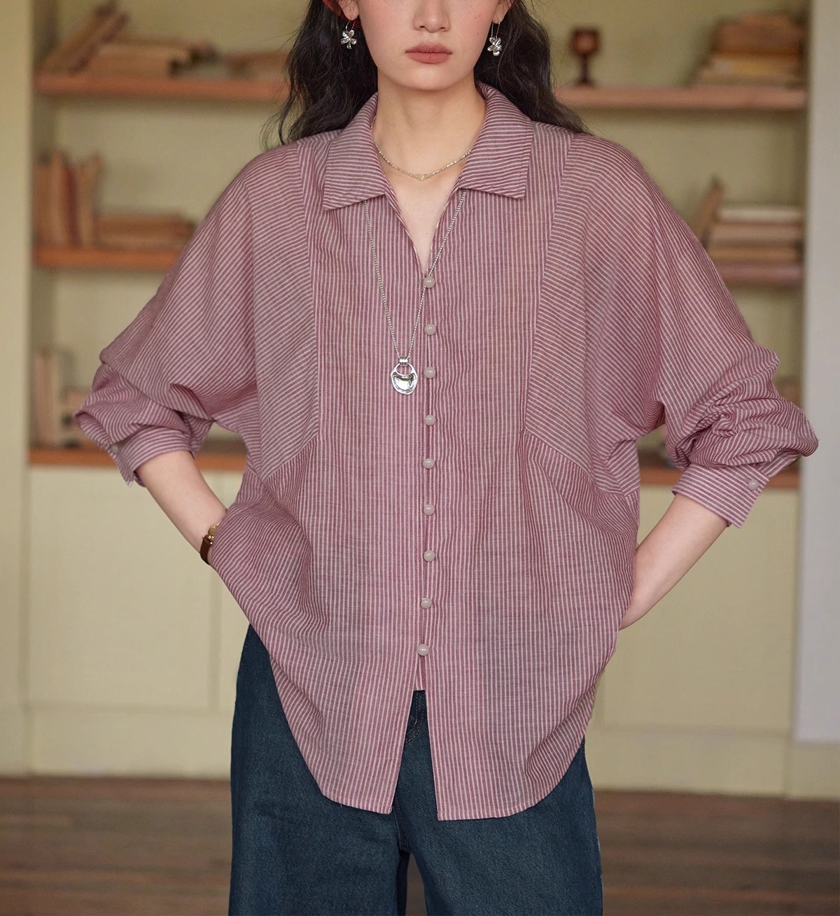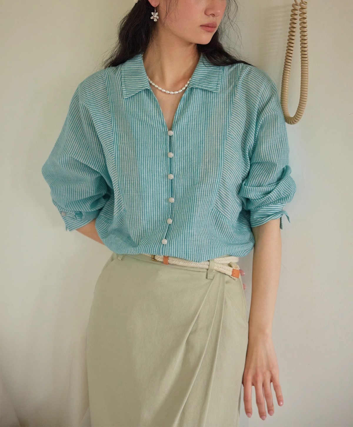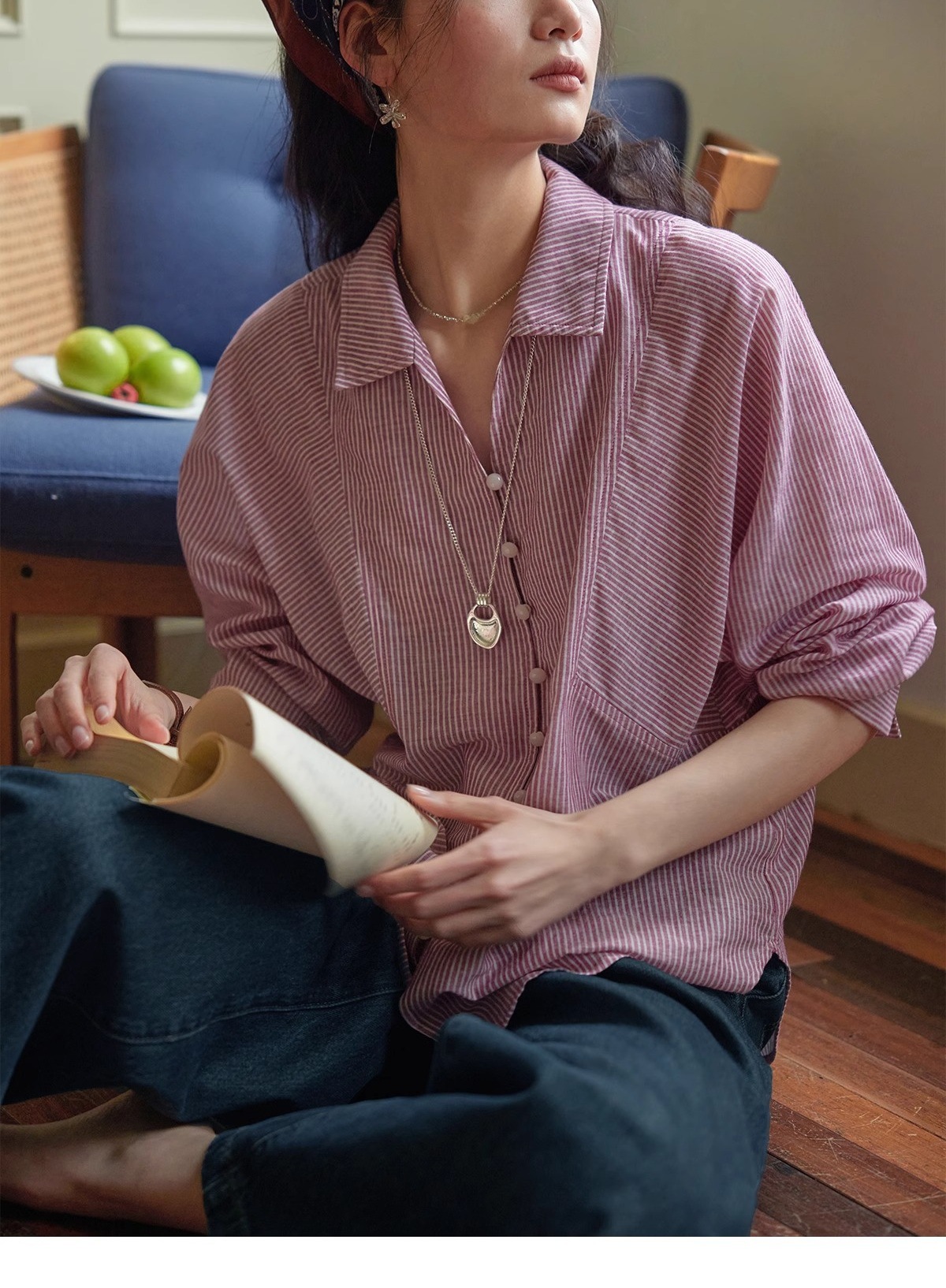 솔리거 프렌치 스트라이프 얇은 자외선 차단 셔츠 여성용 슬림핏 루즈핏 100% 순면 상의스토어 가기