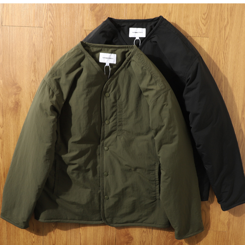 일본 레트로 스타일 무칼라 누빔 재킷 남성용, 격자무늬 방풍 작업복 레이어드 브이넥 버튼 누빔 코트 남성용스토어 가기