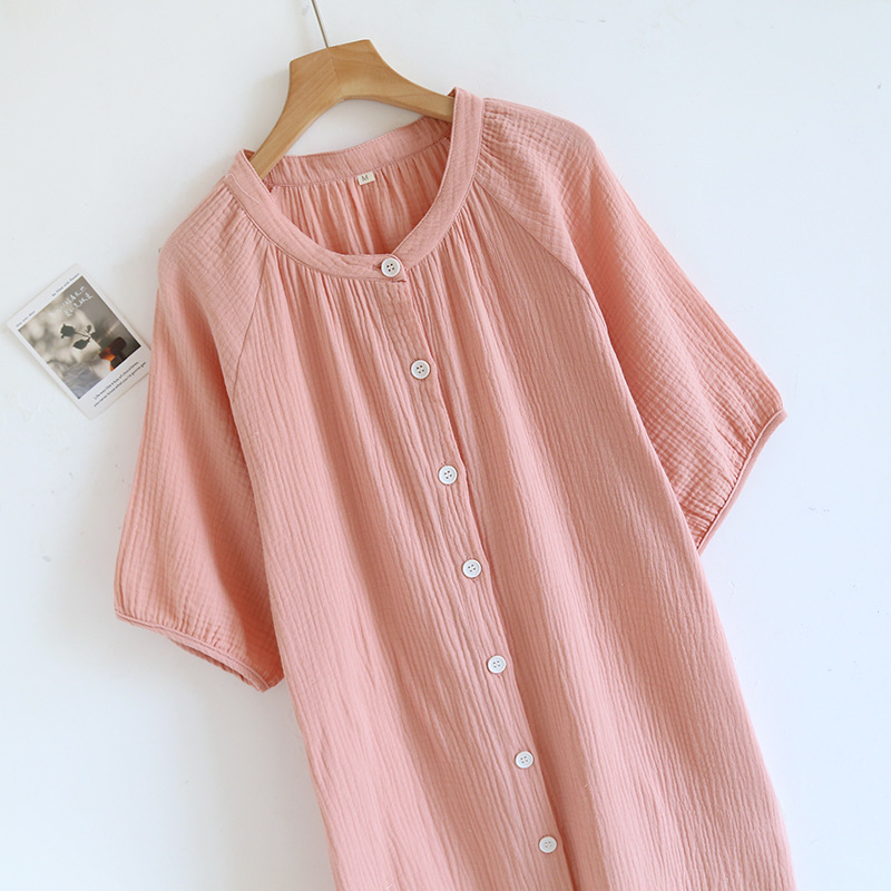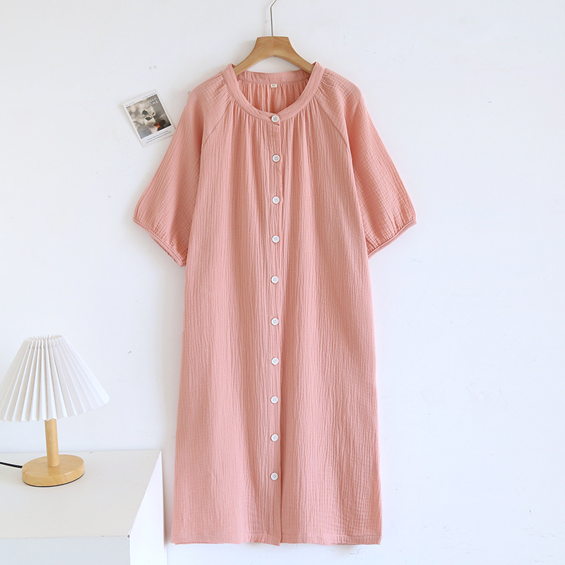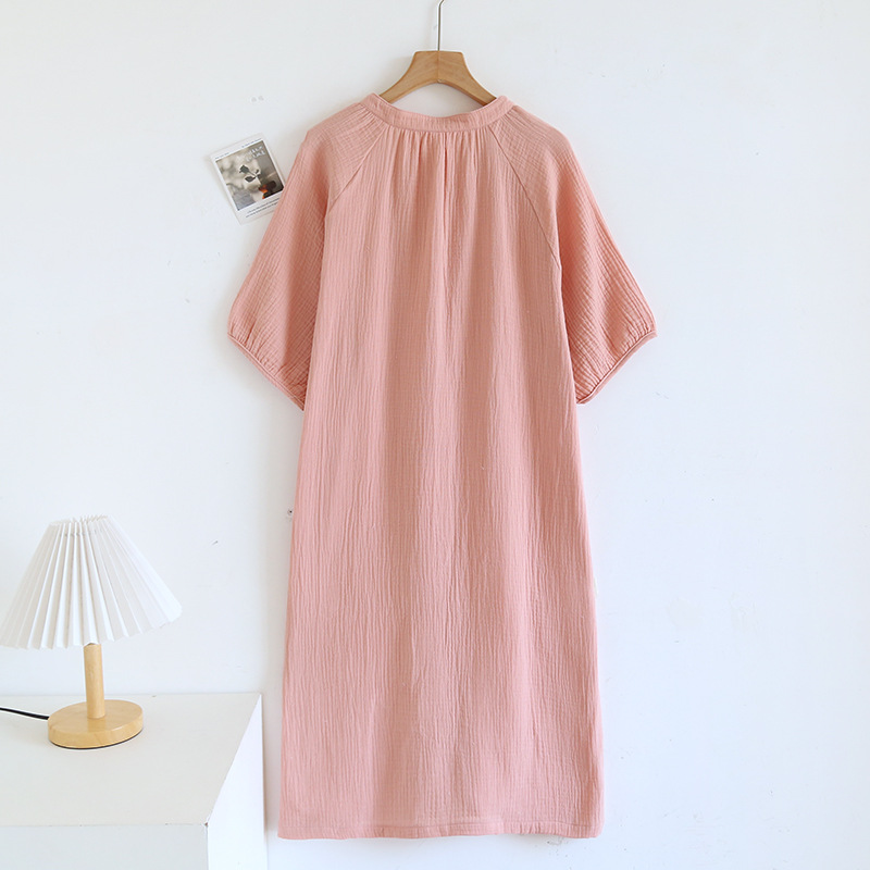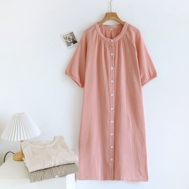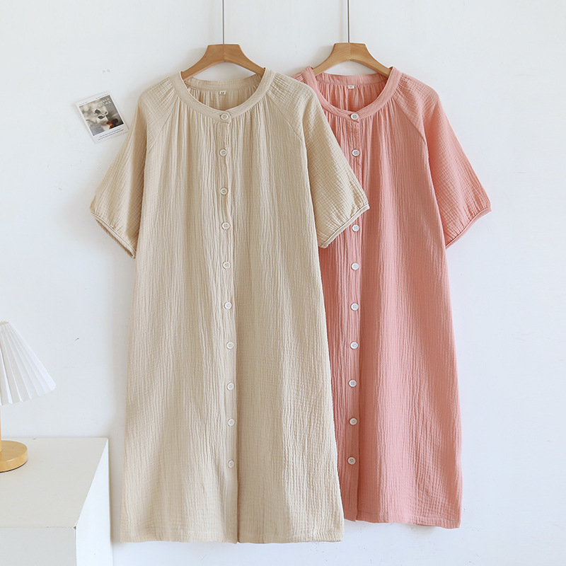 日系绉布纯棉睡裙女宽松家居服夏季薄款双层纱布家居裙开衫长裙
