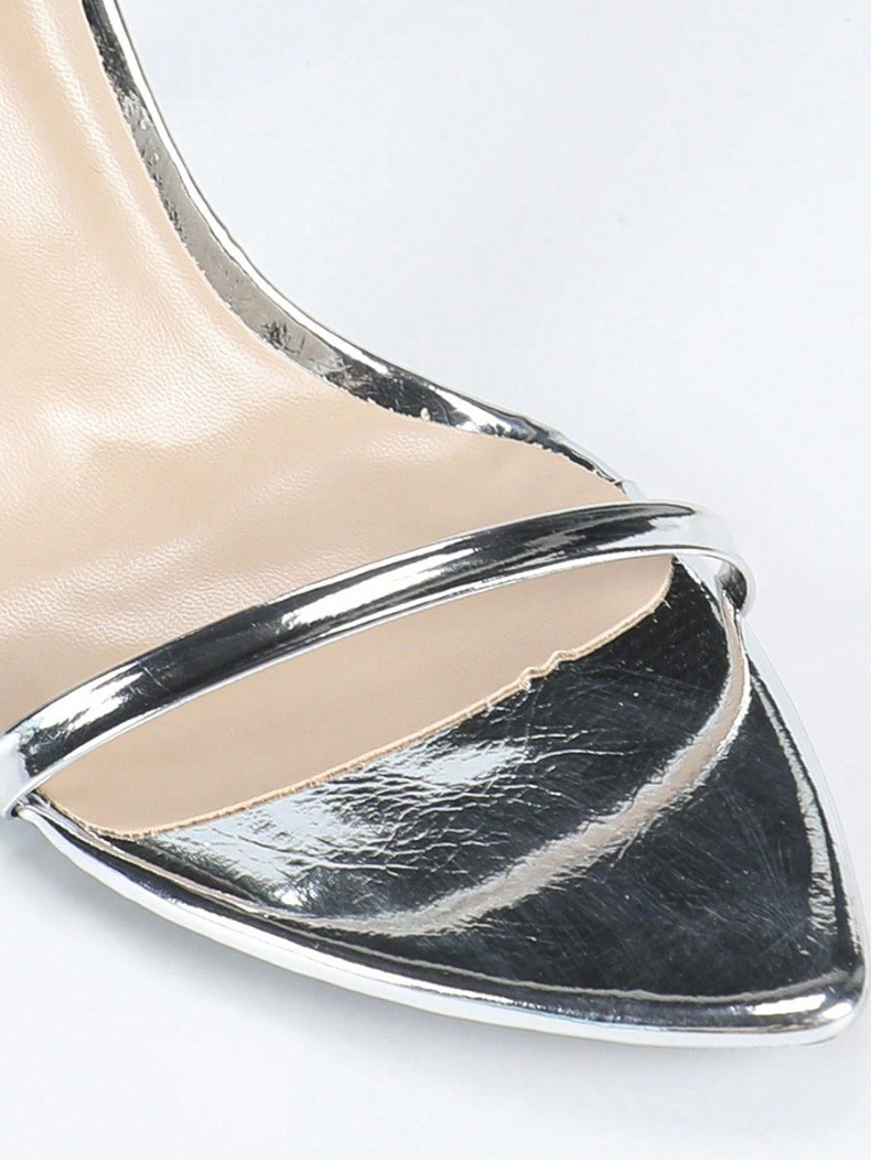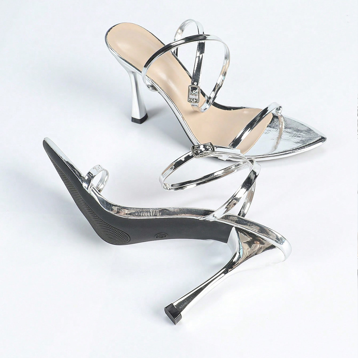 공장 직판 수출용 메탈릭 스타일 얇은 스트랩 PU 가죽 실버 여성 하이힐 샌들 초하이힐 샌들