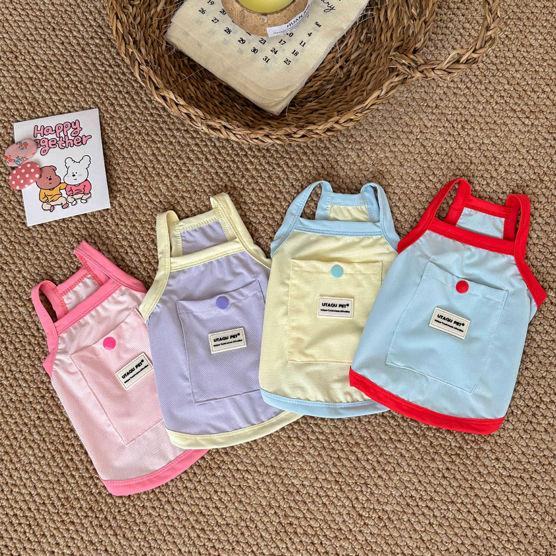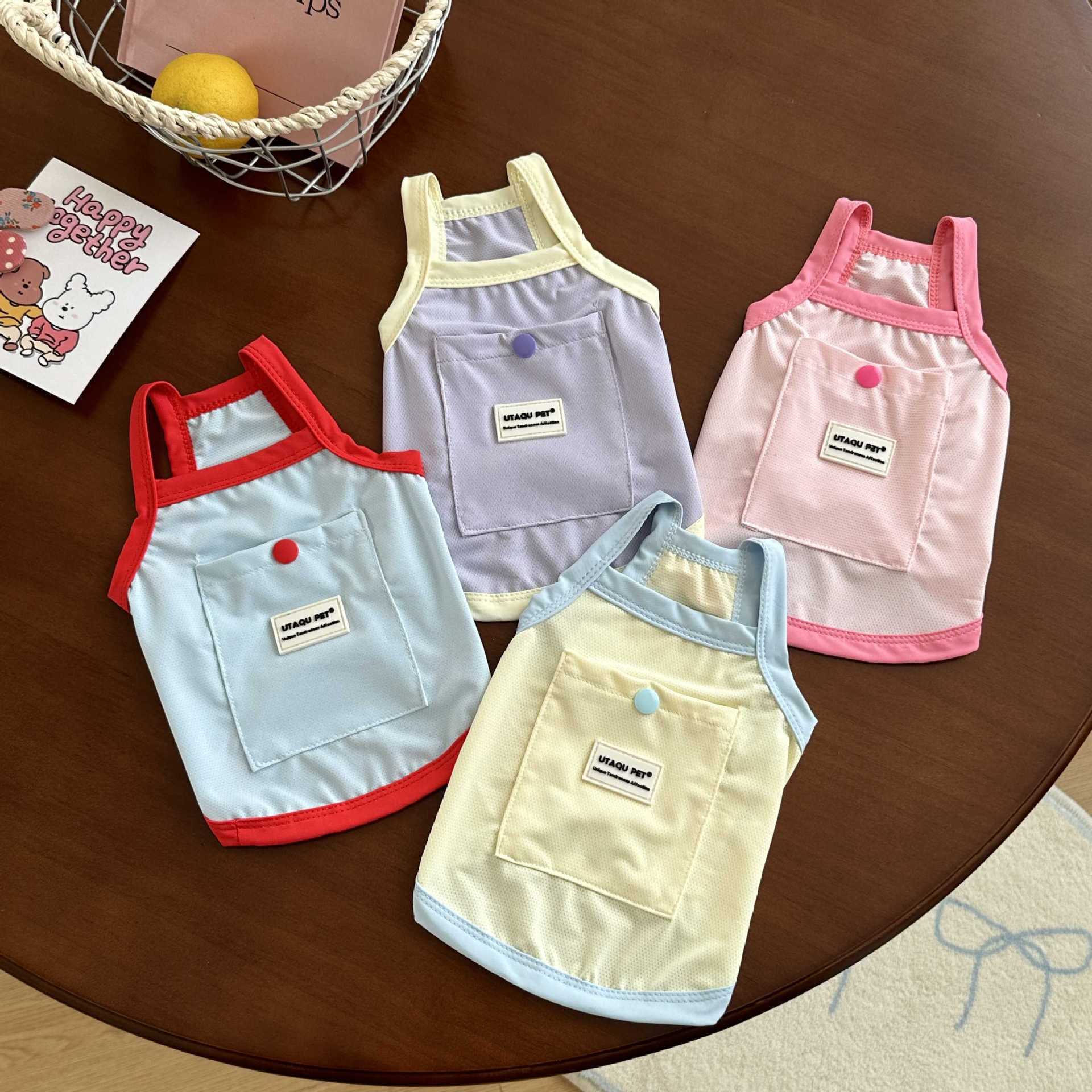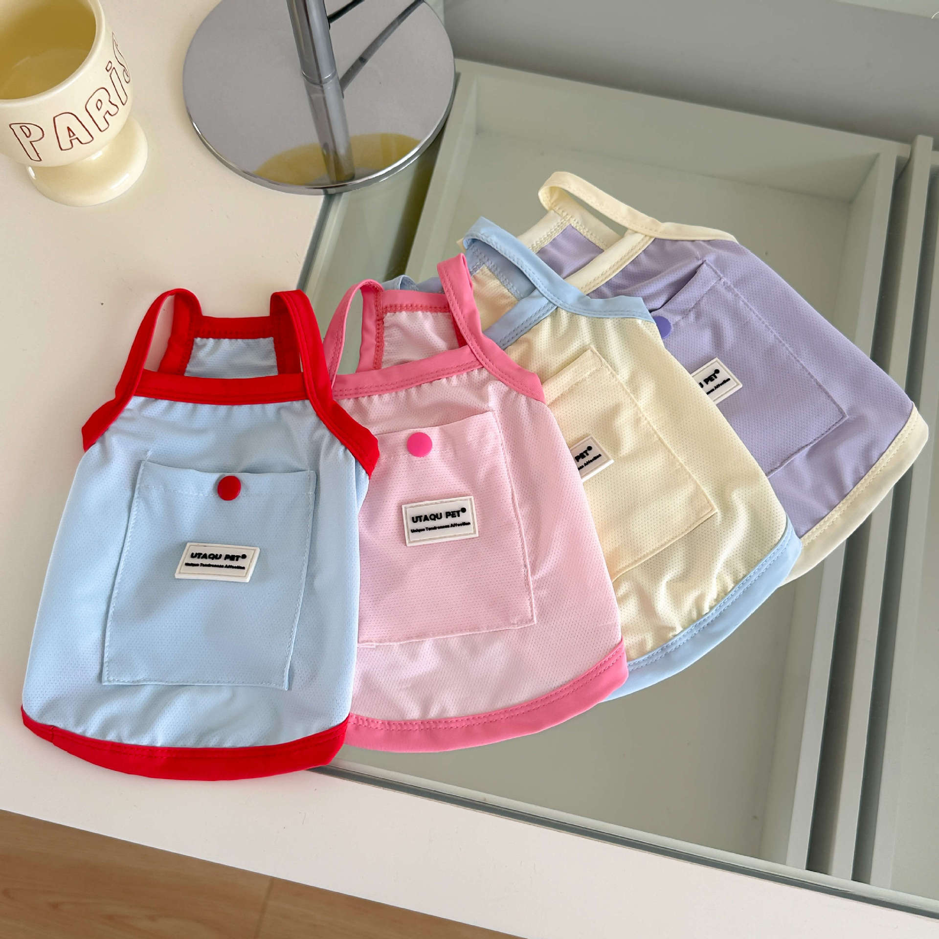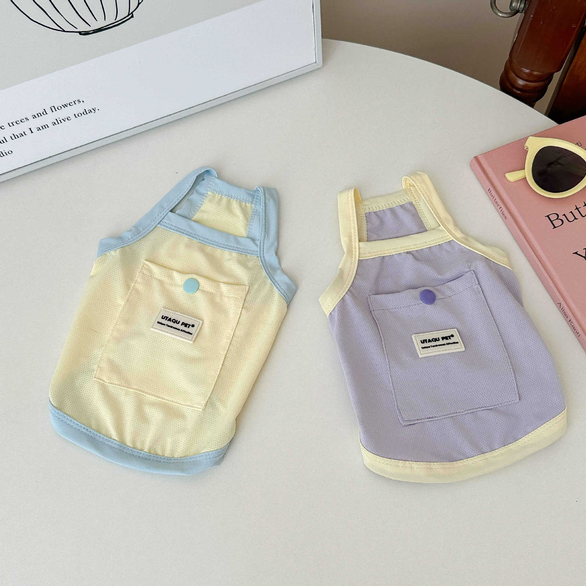 선 스크린 냉각 블루 컬러 블록 네 다리 외출 옷 작은 개와 고양이 여름 얇은 통기성 애완견 옷스토어 가기