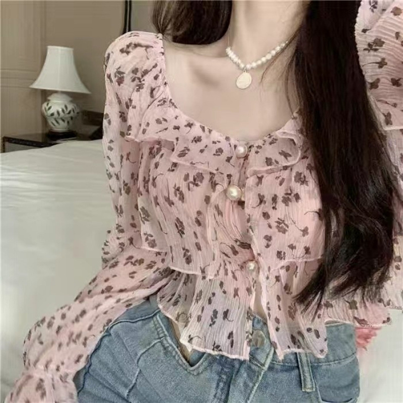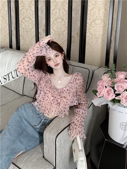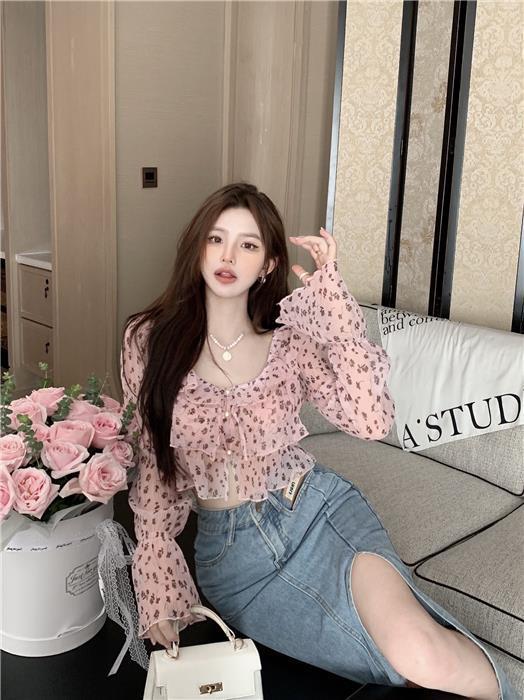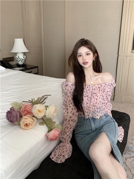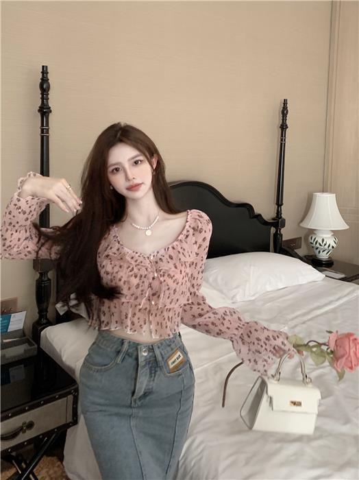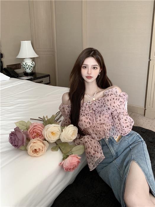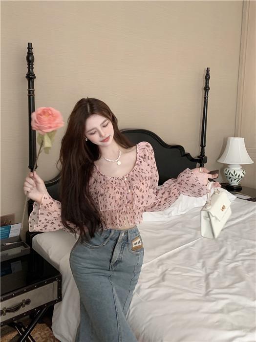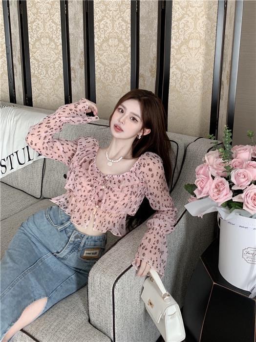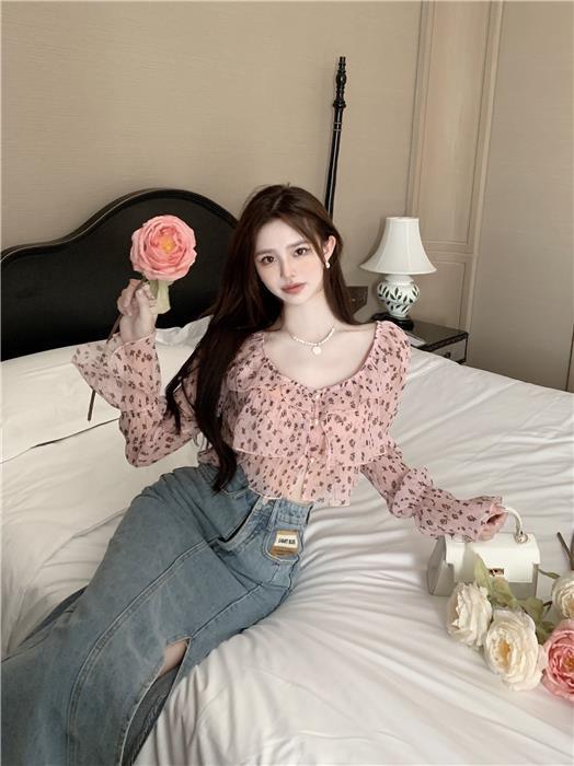 달콤한 꽃 무늬 복고풍 긴팔 셔츠 여성 봄 원 숄더 짧은 디자인 틈새 바닥 셔츠 탑스토어 가기