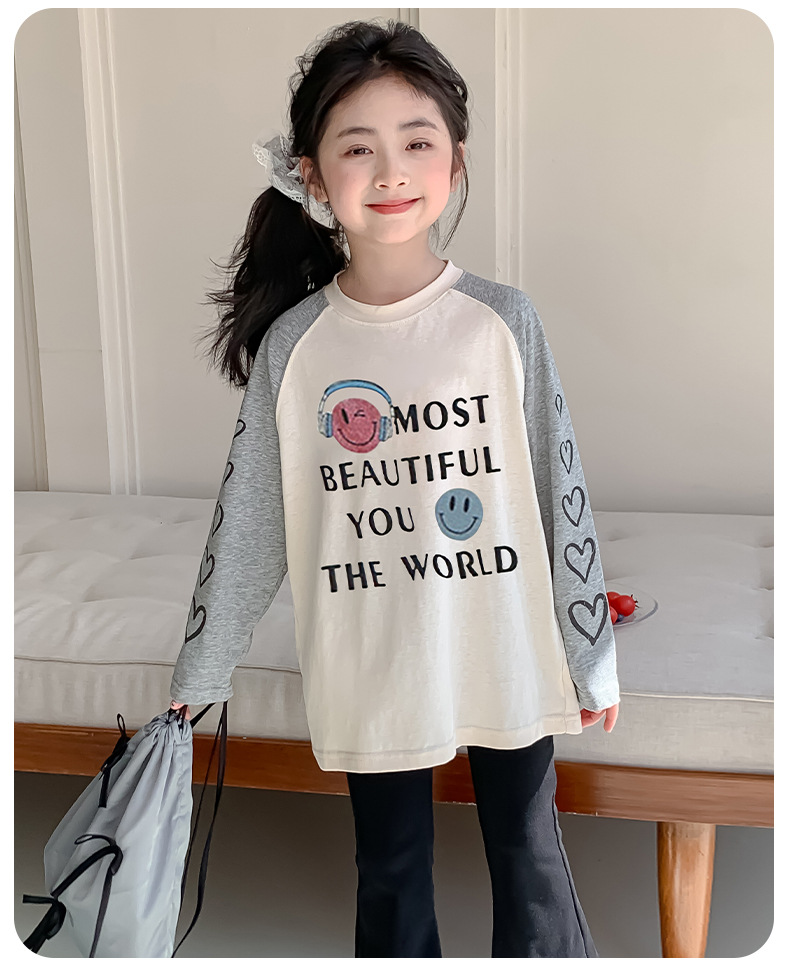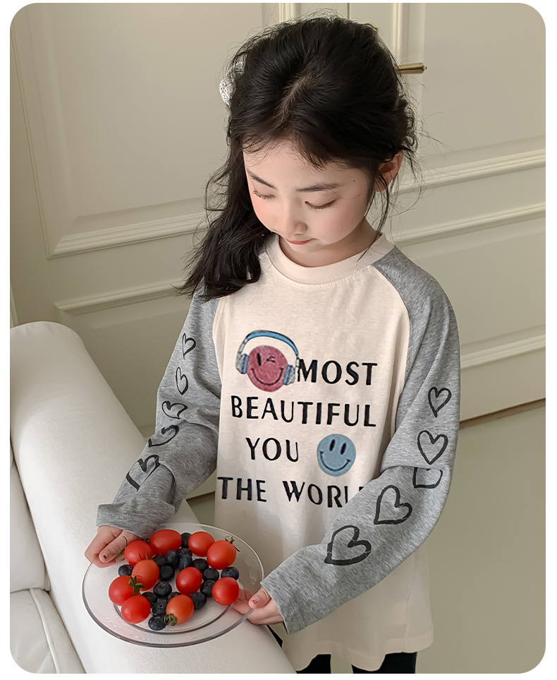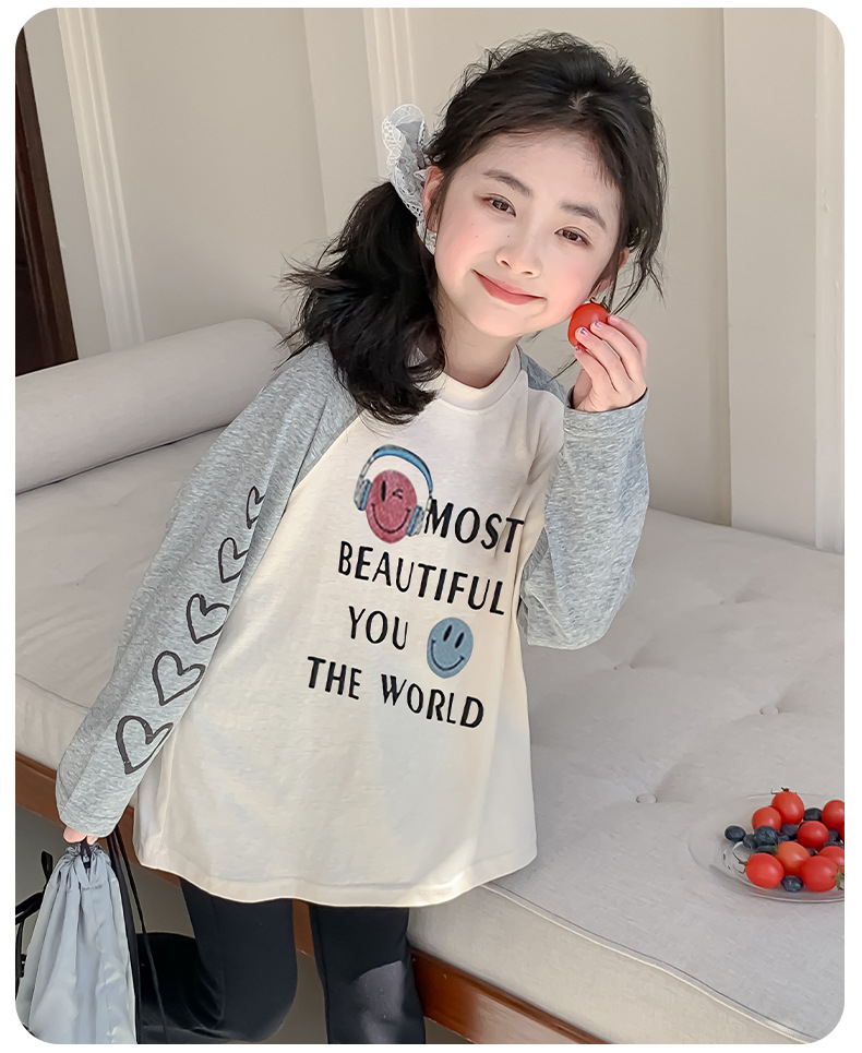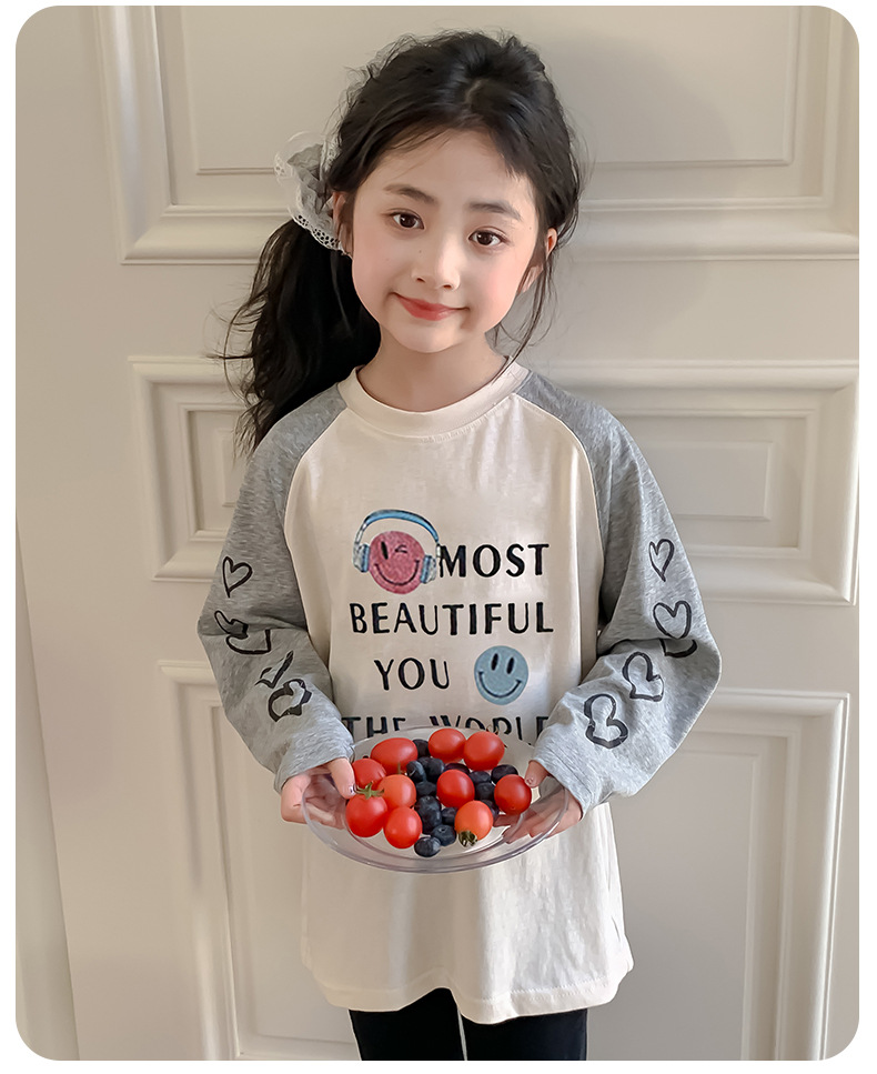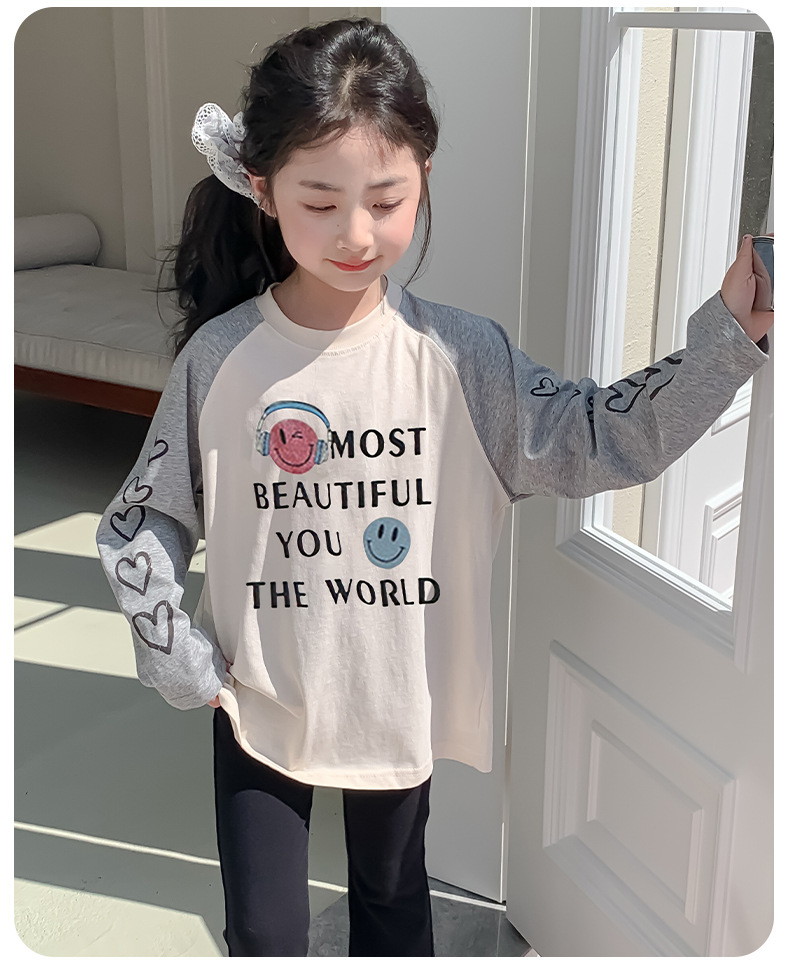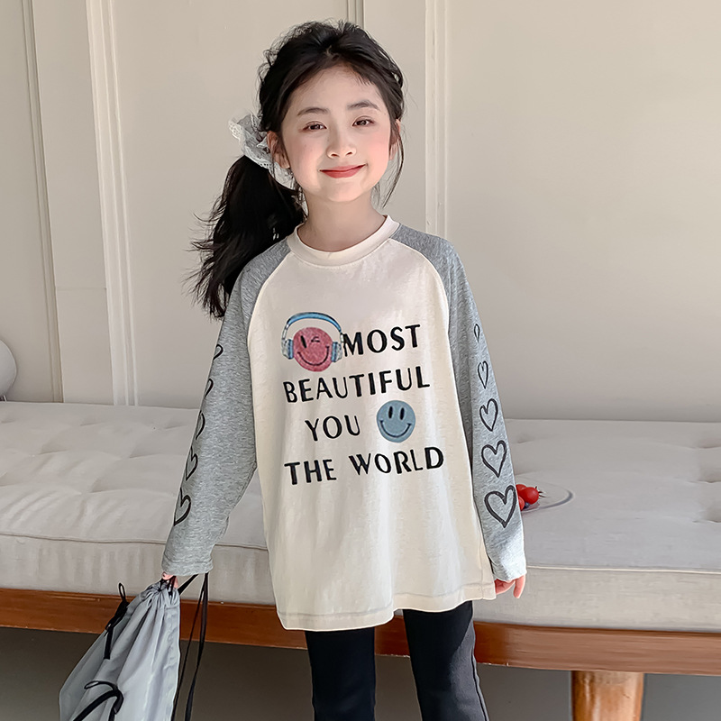 소녀 봄 긴팔 티셔츠 2025 큰 어린이 새 한국 편지 인쇄 느슨한 아동면 티셔츠 도매스토어 가기