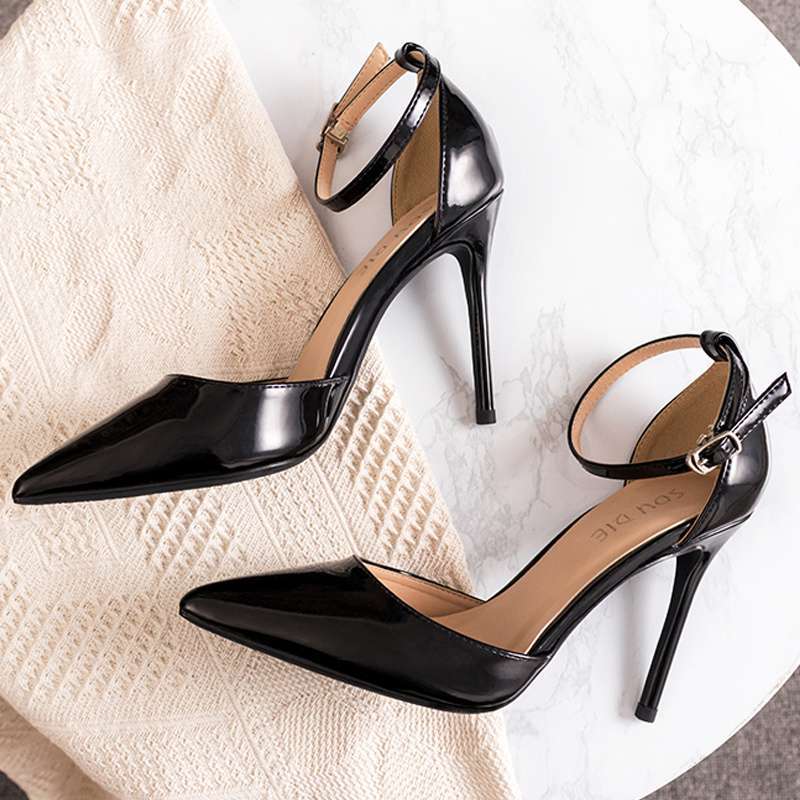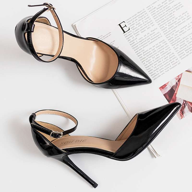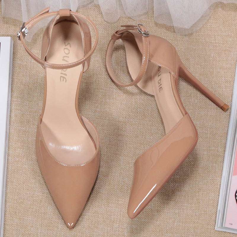 2025년 신형 스틸레토 페이턴트 가죽 뾰족한 앞코 얇은 하이힐, 우아한 다크 누드 컬러 원라인 버클 스트랩 중공 샌들 여성용스토어 가기