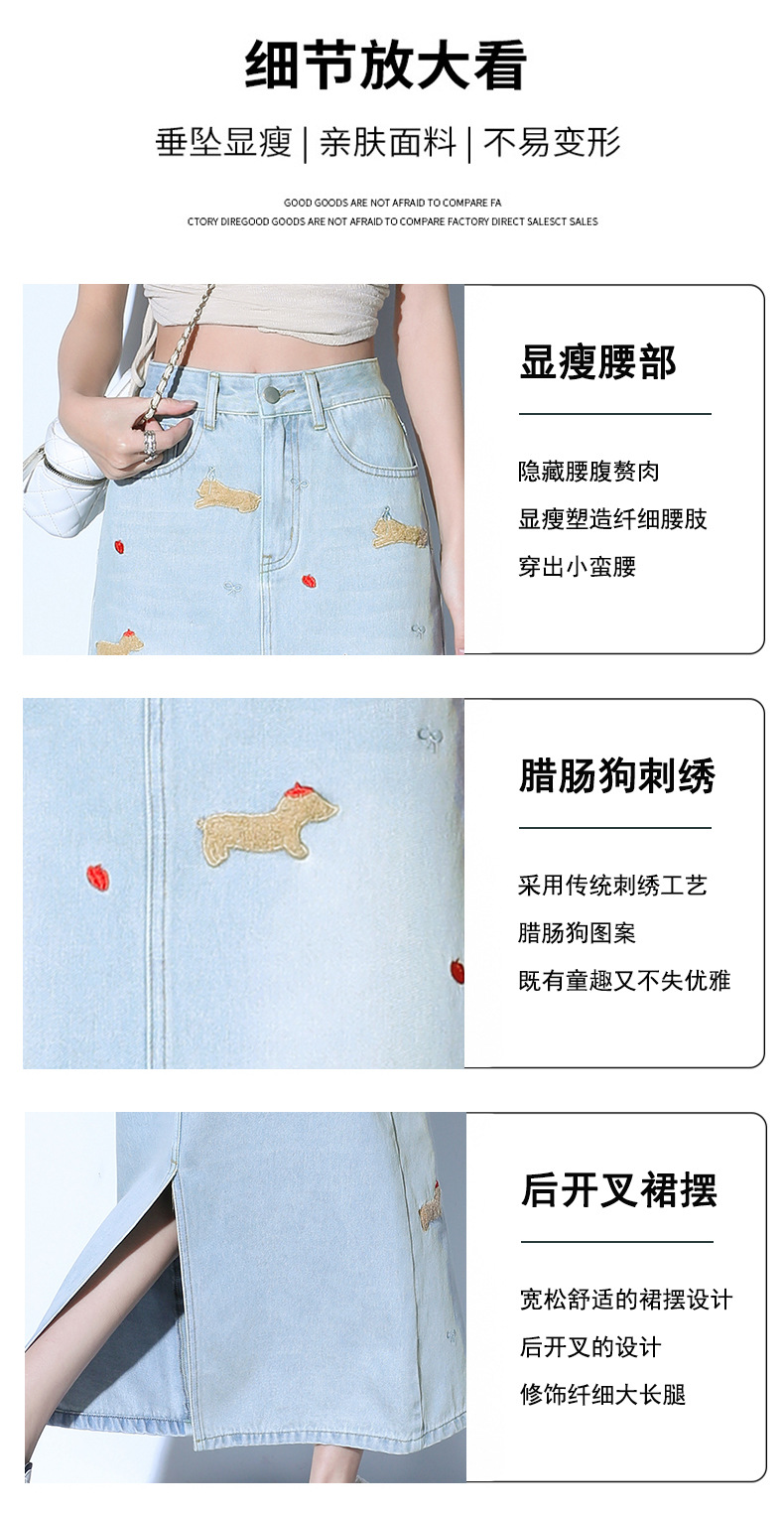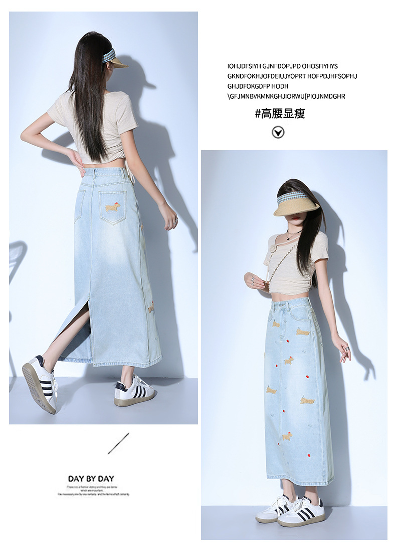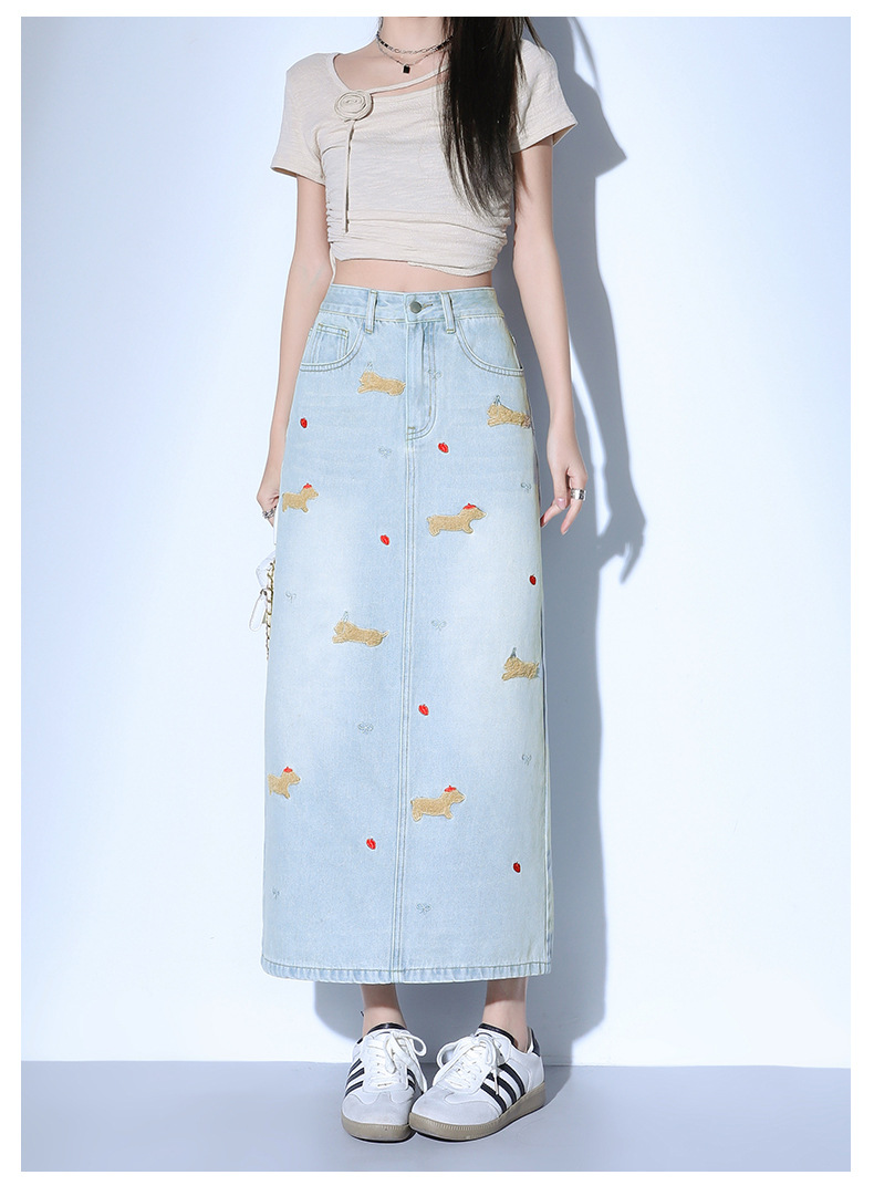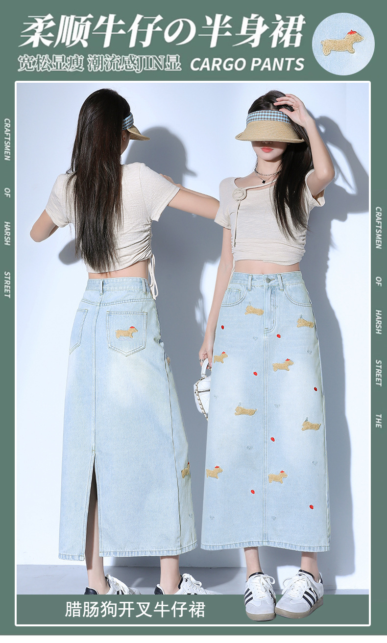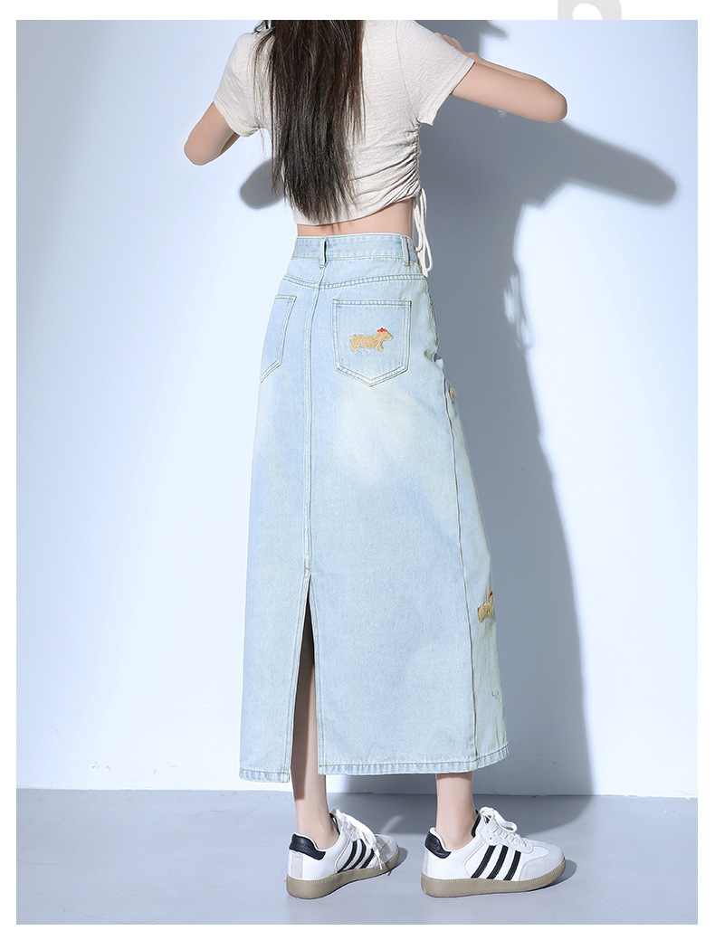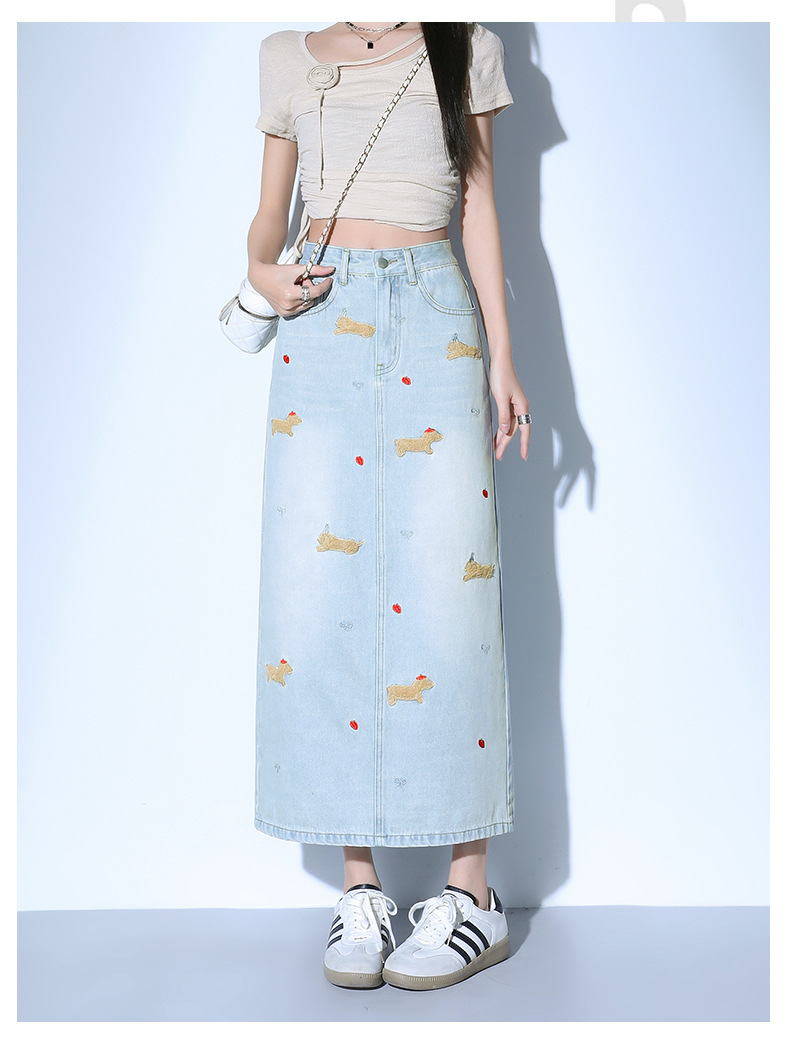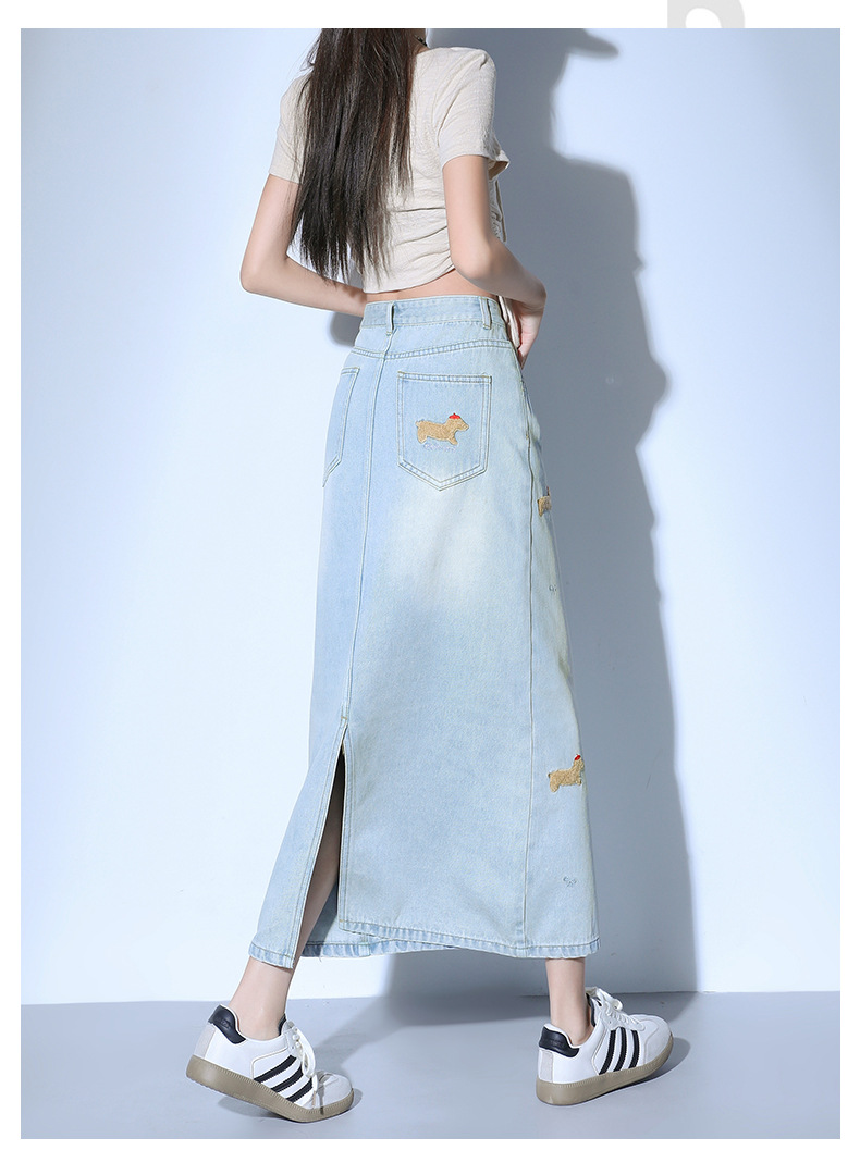 닥스 훈트 만화 자수 높은 허리 데님 스커트 여성의 2025 새로운 중간 길이 슬림 쉬스 스플릿 스커트스토어 가기