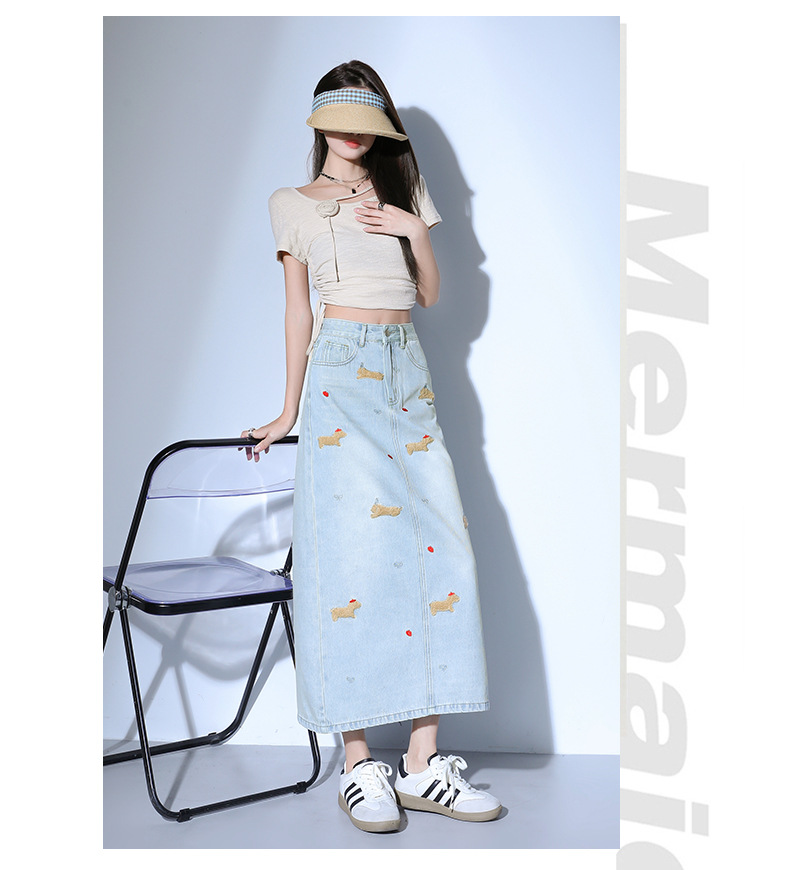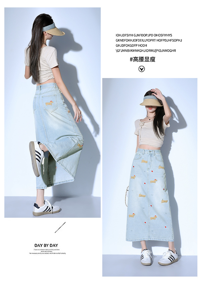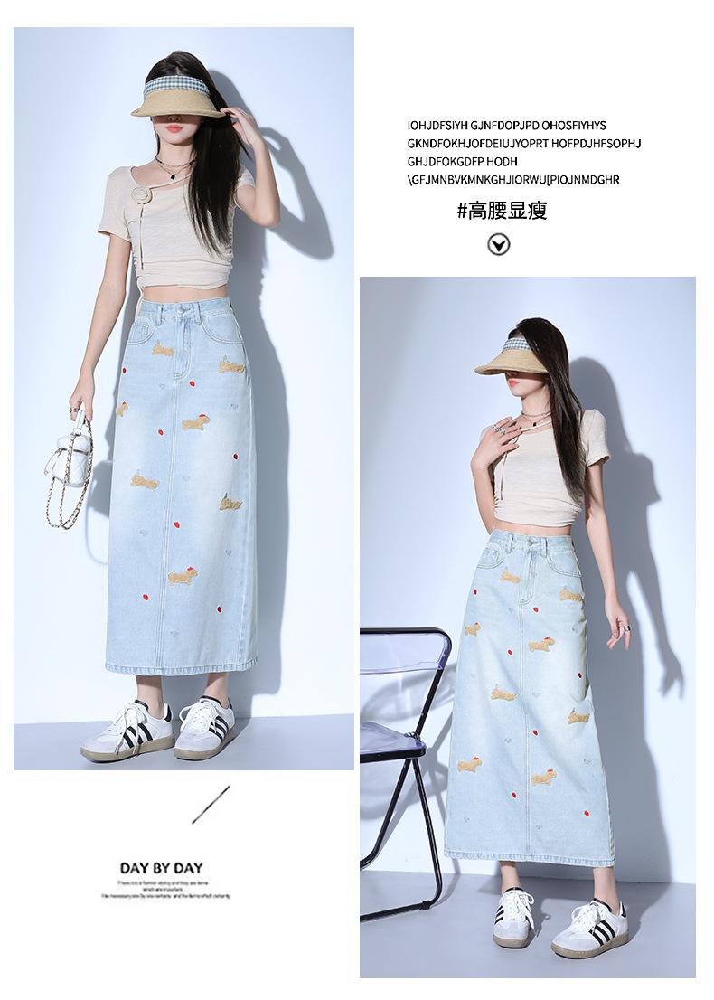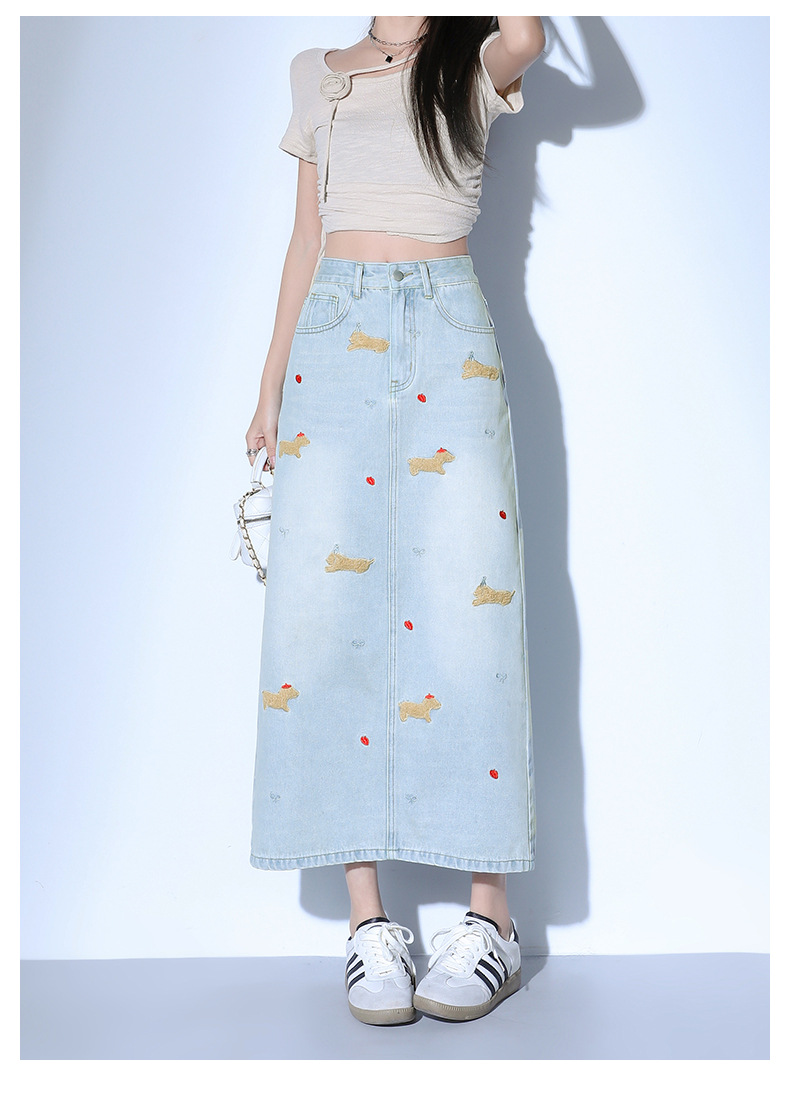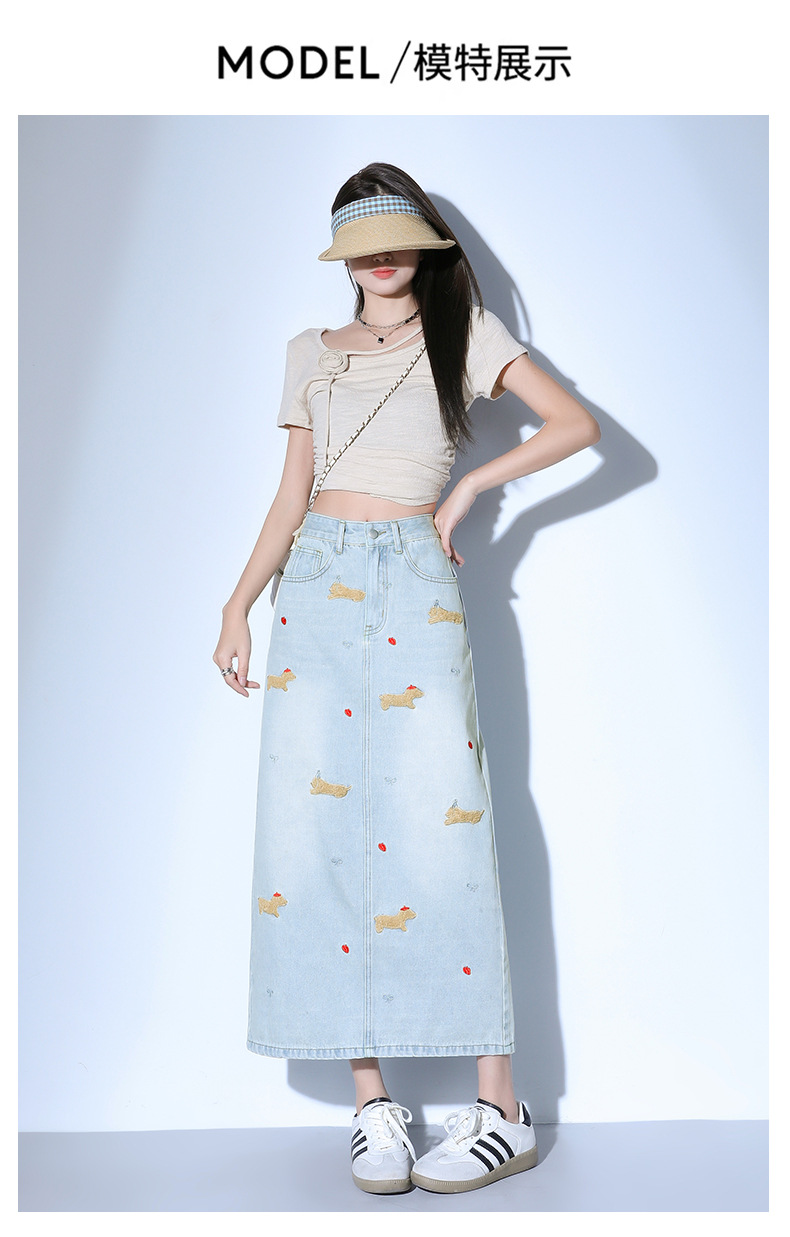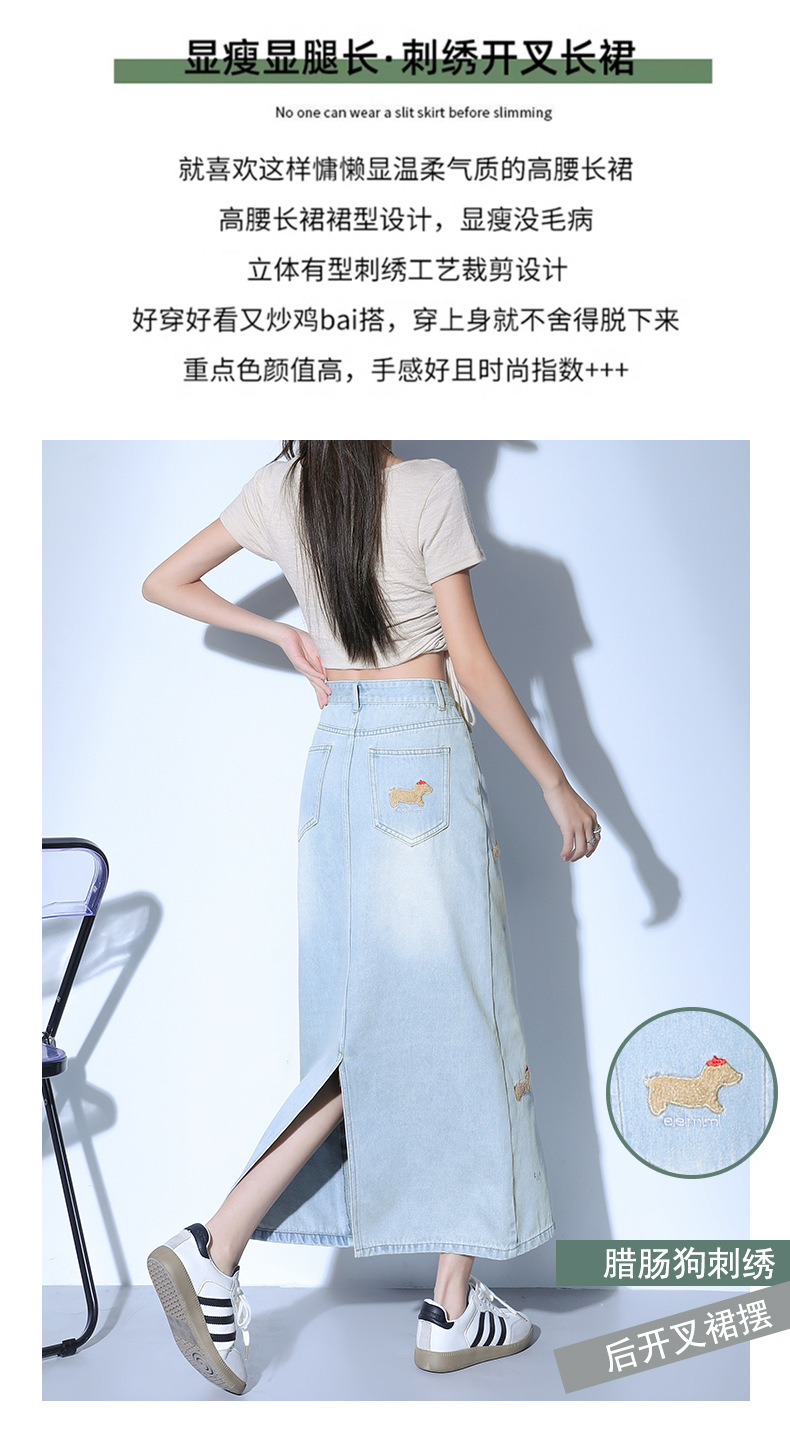 닥스 훈트 만화 자수 높은 허리 데님 스커트 여성의 2025 새로운 중간 길이 슬림 쉬스 스플릿 스커트스토어 가기