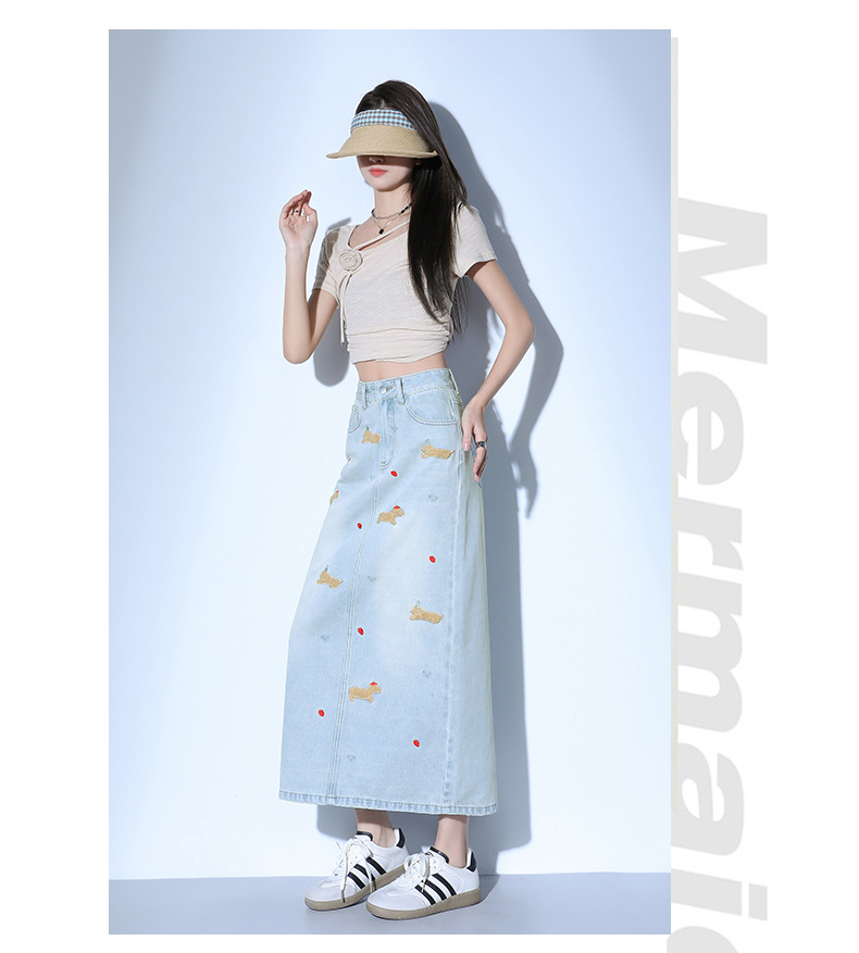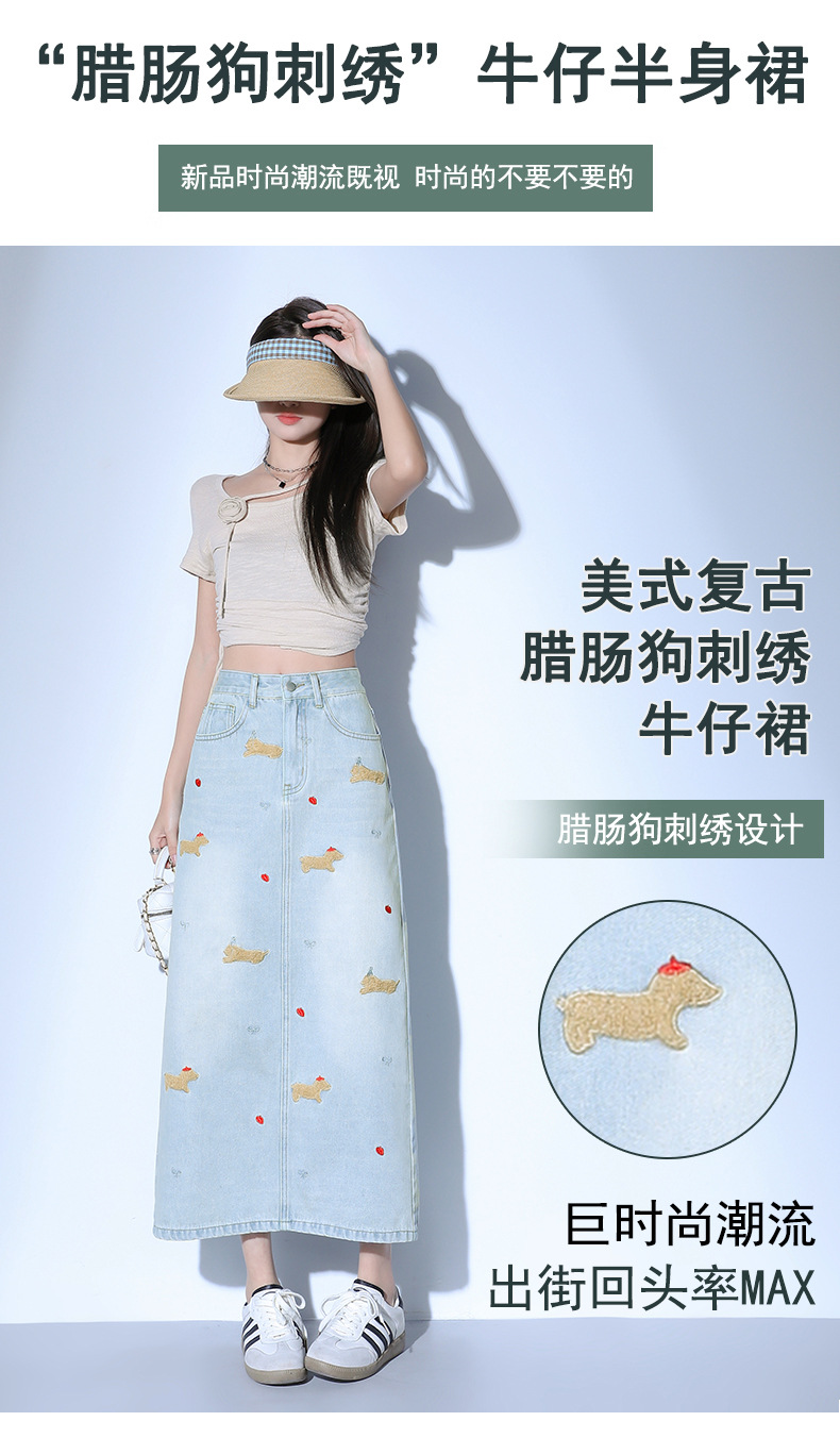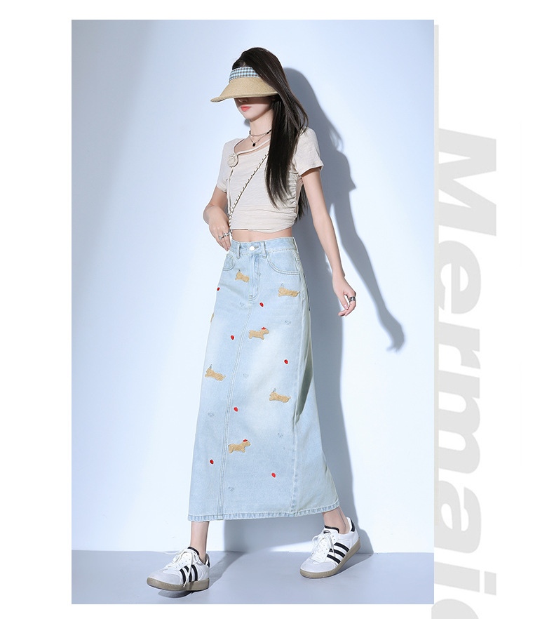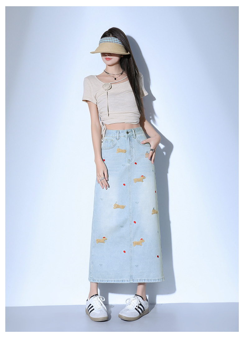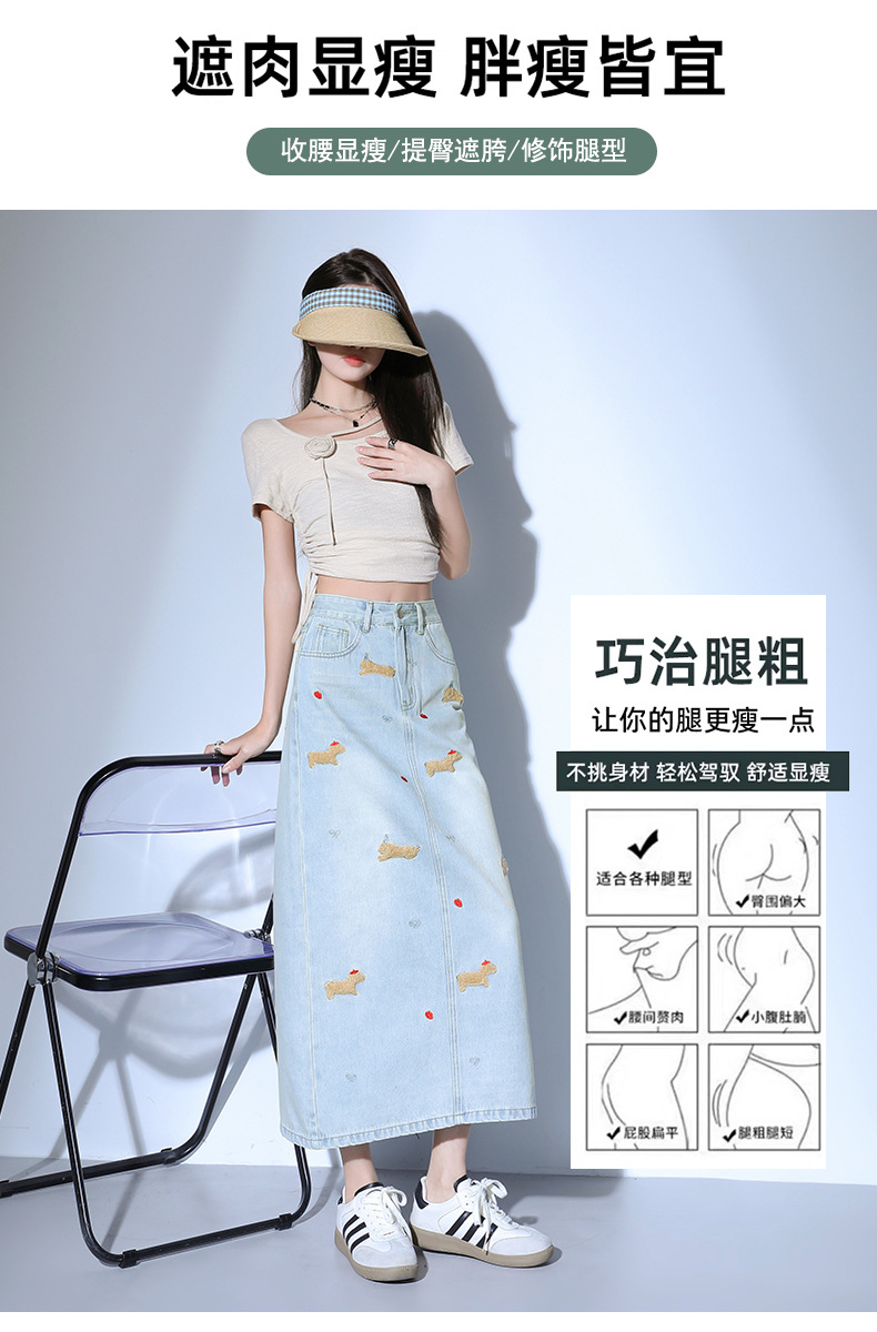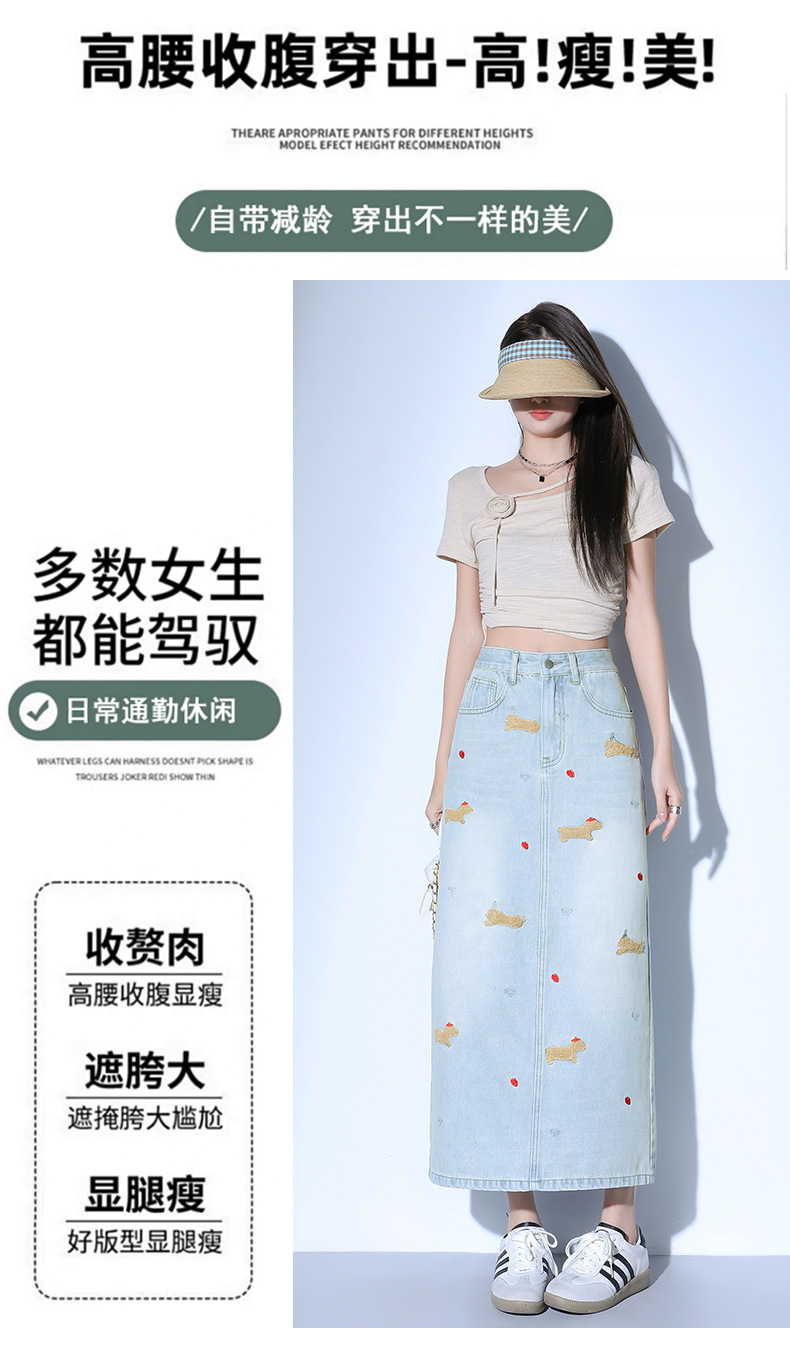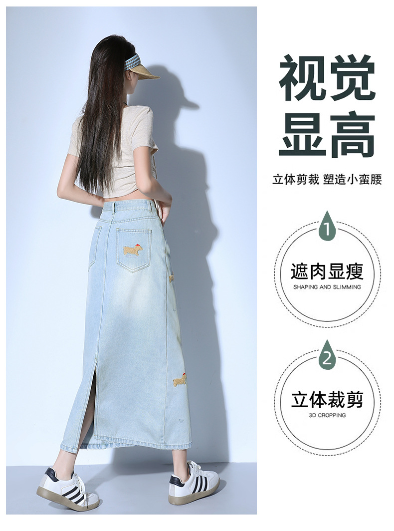 닥스 훈트 만화 자수 높은 허리 데님 스커트 여성의 2025 새로운 중간 길이 슬림 쉬스 스플릿 스커트스토어 가기