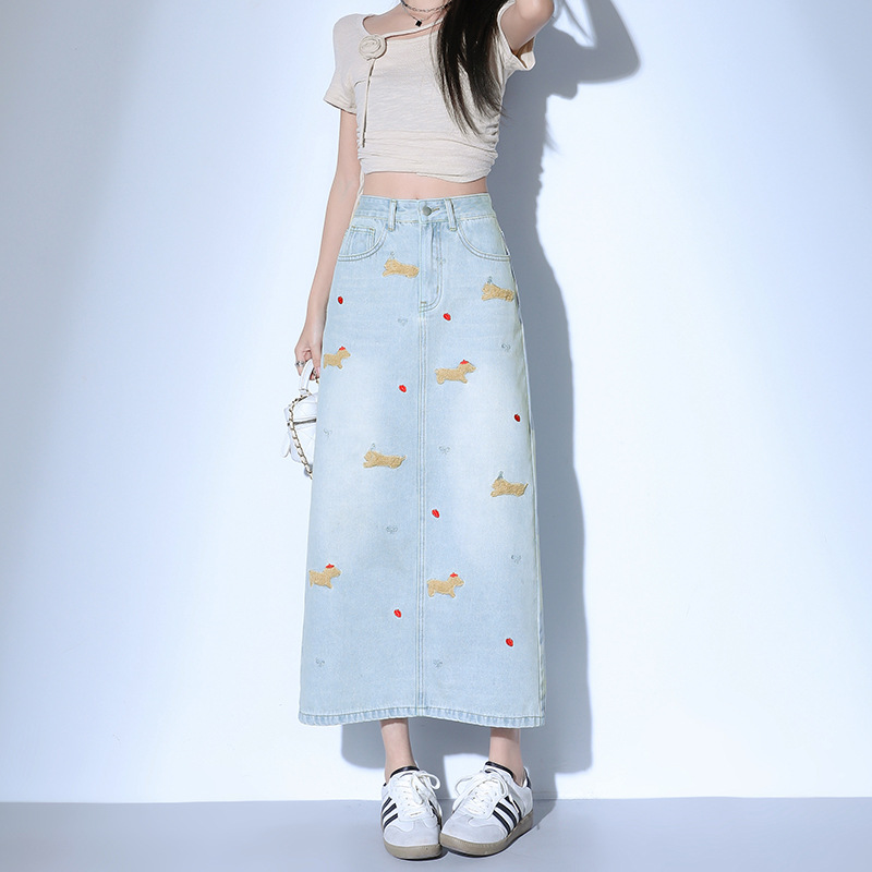 닥스 훈트 만화 자수 높은 허리 데님 스커트 여성의 2025 새로운 중간 길이 슬림 쉬스 스플릿 스커트