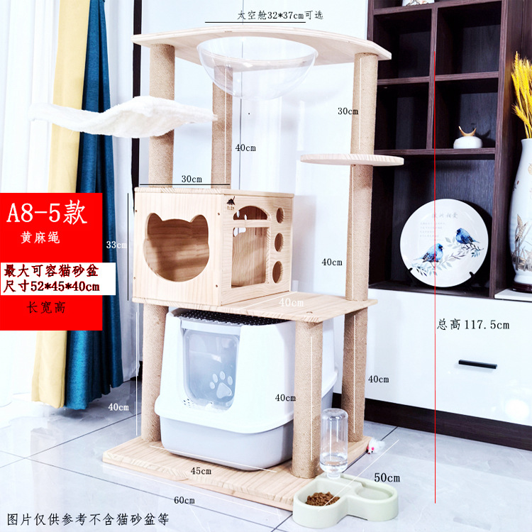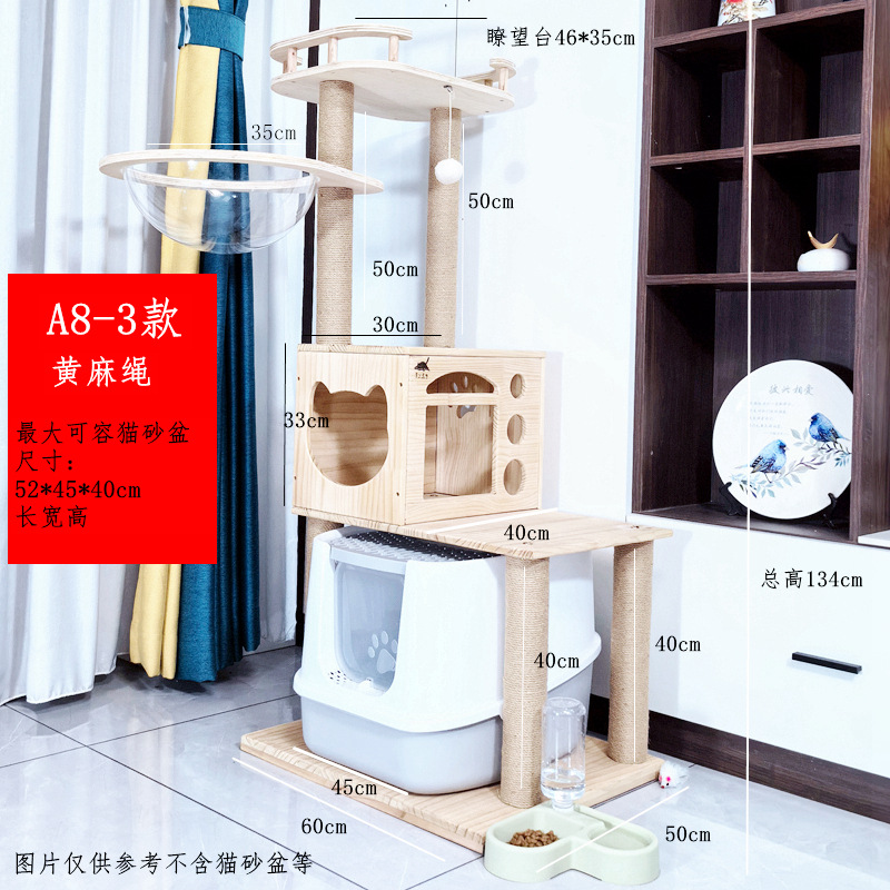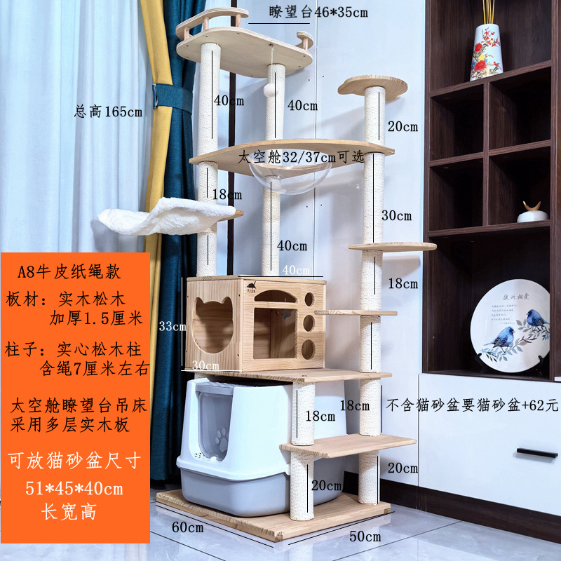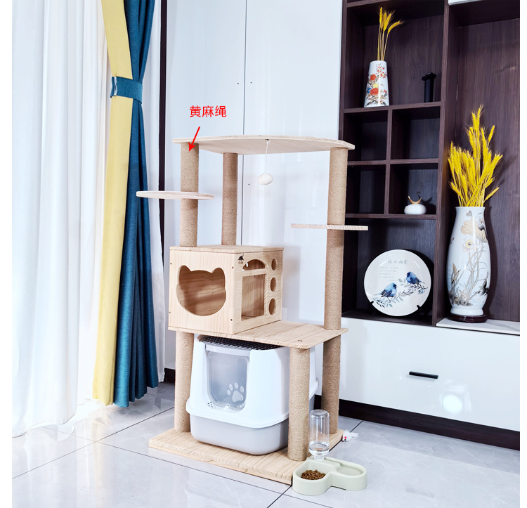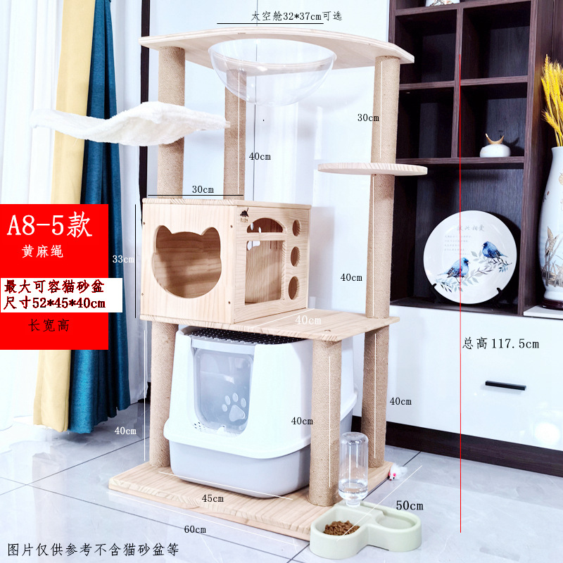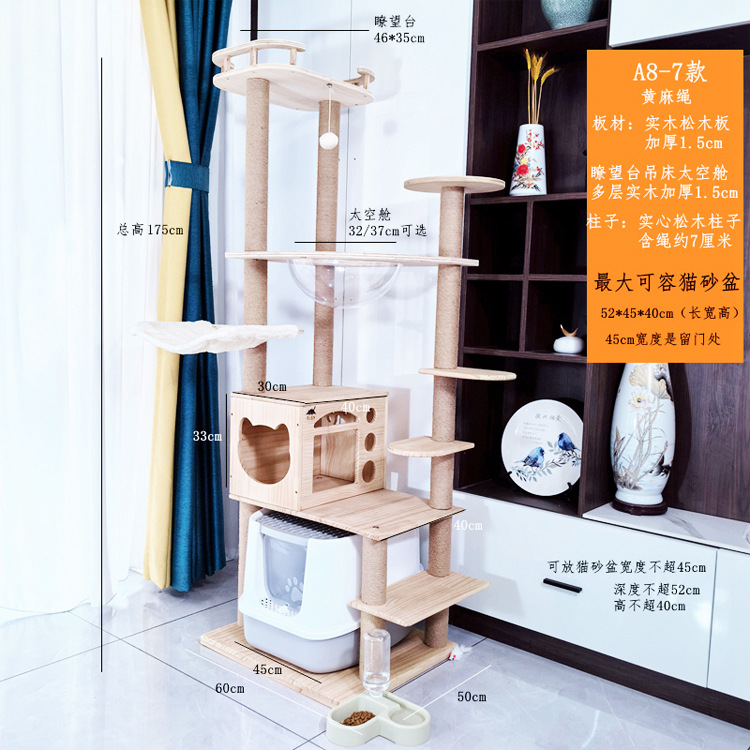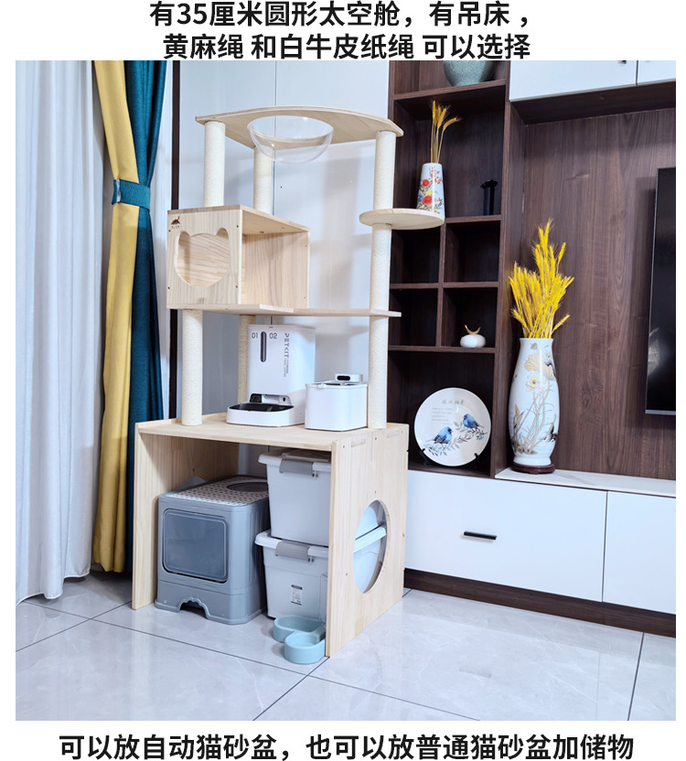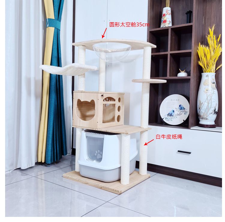 소나무 원목 대형 고양이 클라이밍 프레임 및 둥지 일체형 빌라 노란색 삼나무 기둥 우주 캡슐 다층 고양이 쓰레기통 캐비닛
