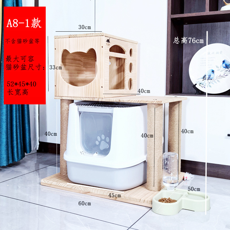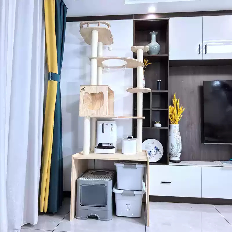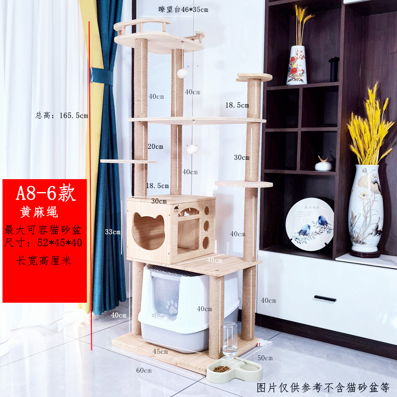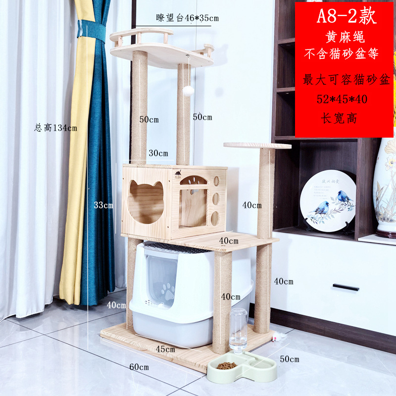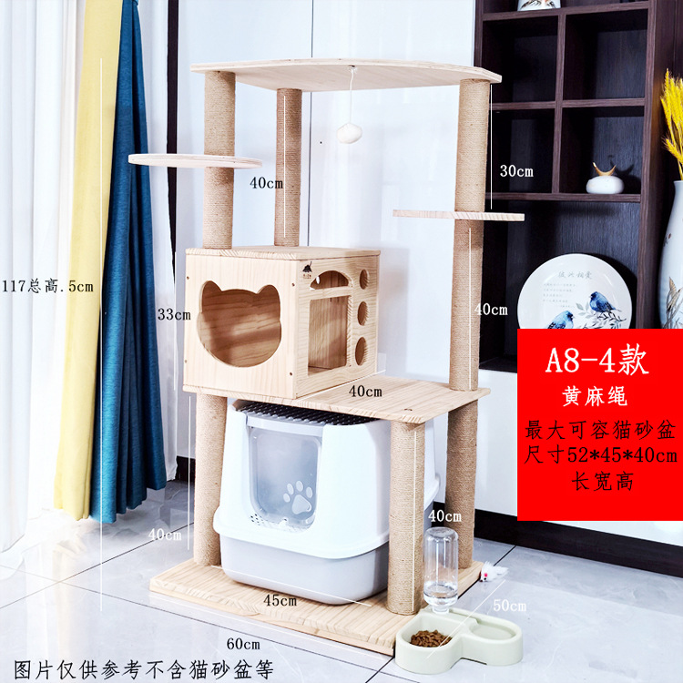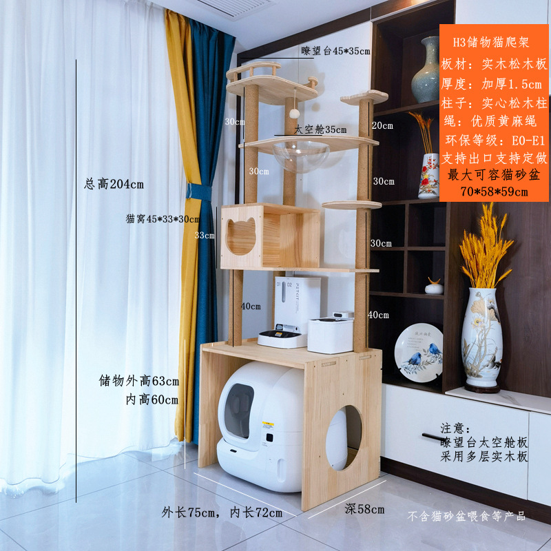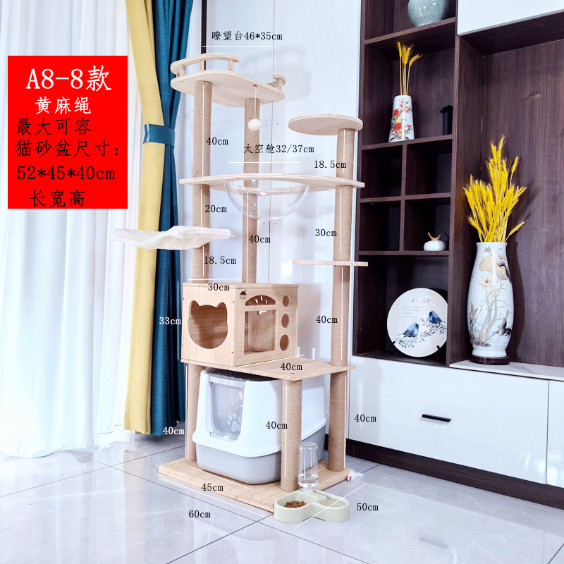소나무 원목 대형 고양이 클라이밍 프레임 및 둥지 일체형 빌라 노란색 삼나무 기둥 우주 캡슐 다층 고양이 쓰레기통 캐비닛