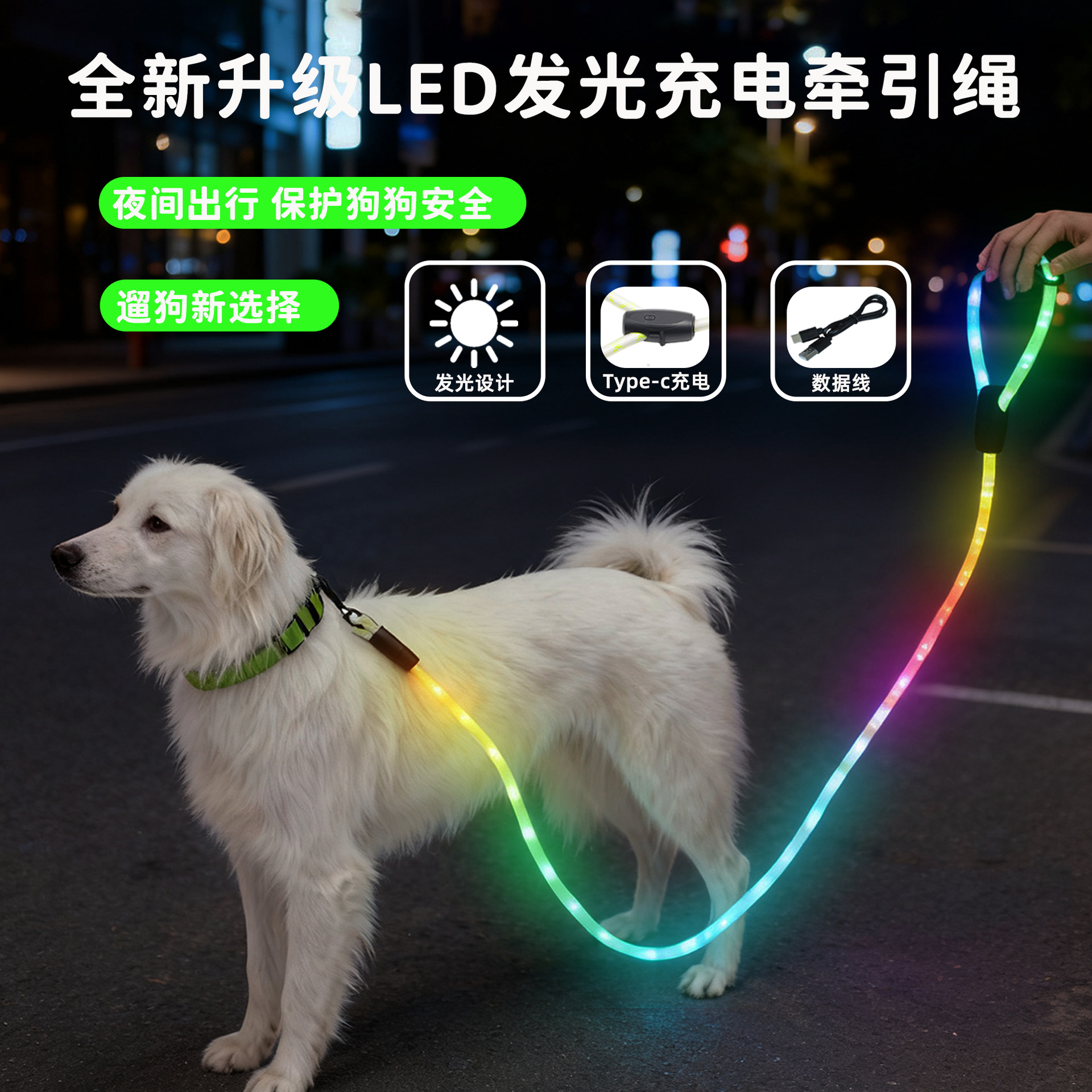 다채로운 멀티 컬러 변환 빛나는 애완 동물 라운드 로프 견인 로프 RGB LED 빛나는 견인 USB 충전 빛나는 풀 스트랩
