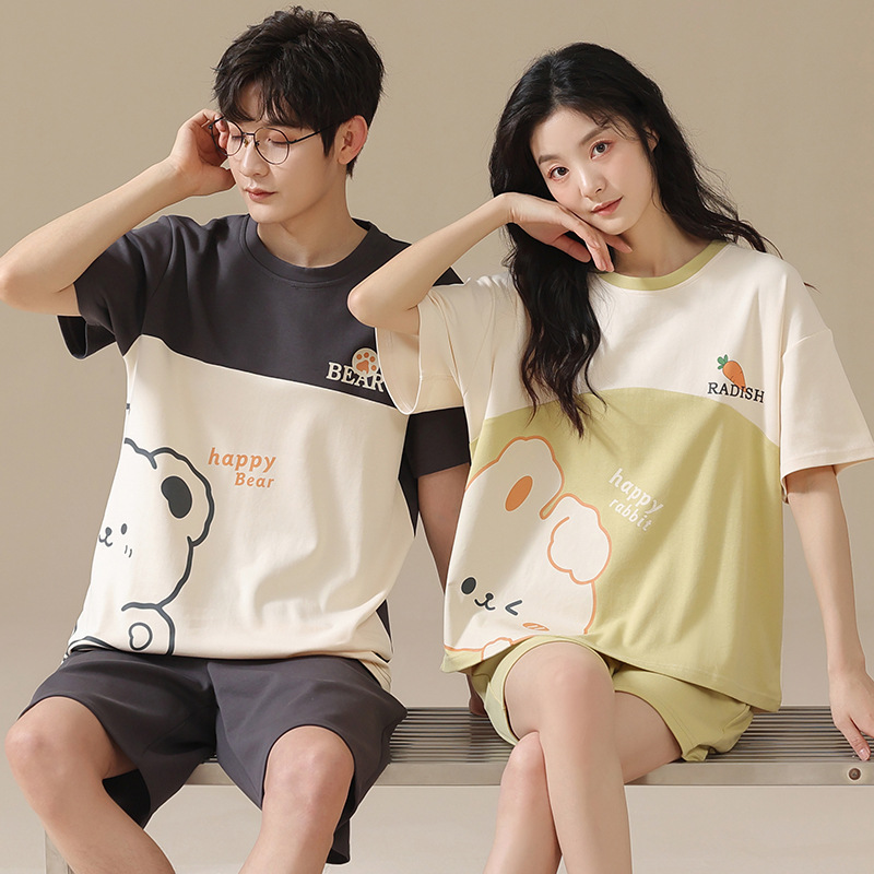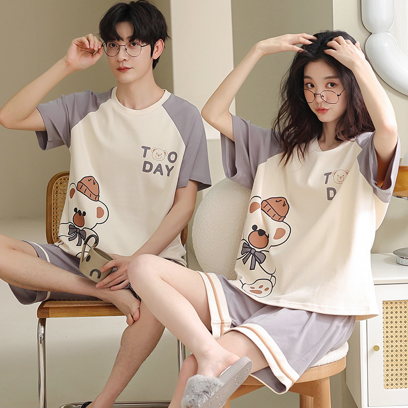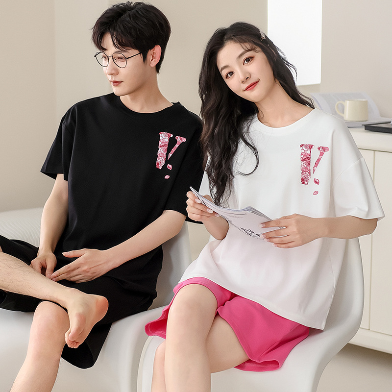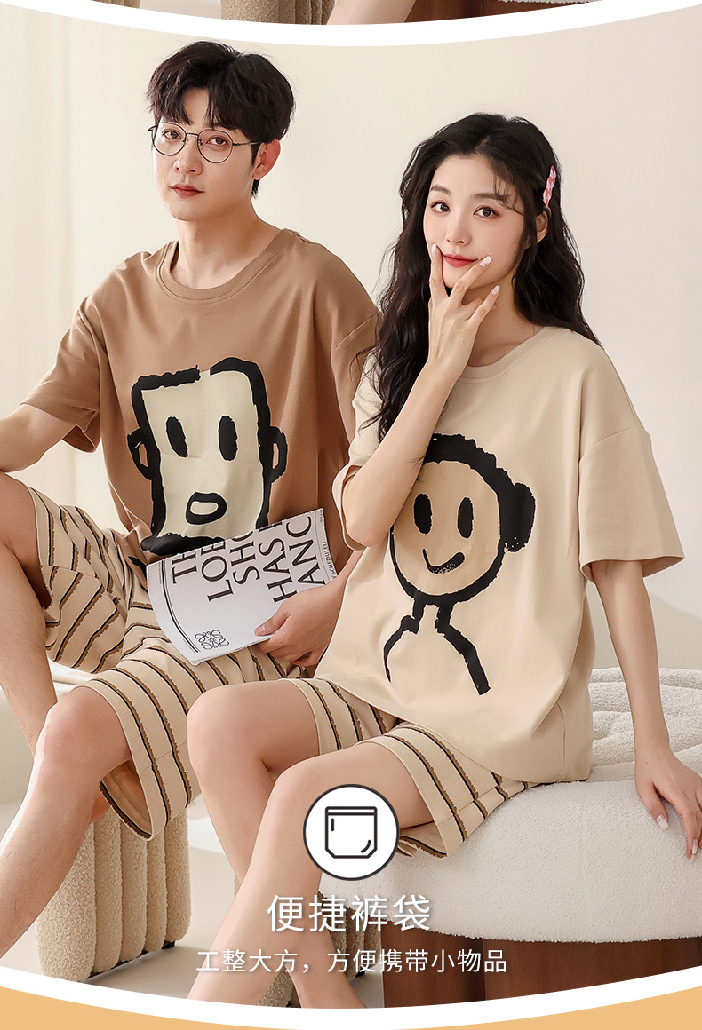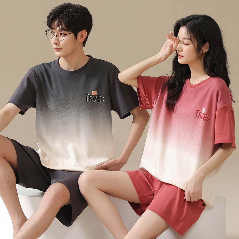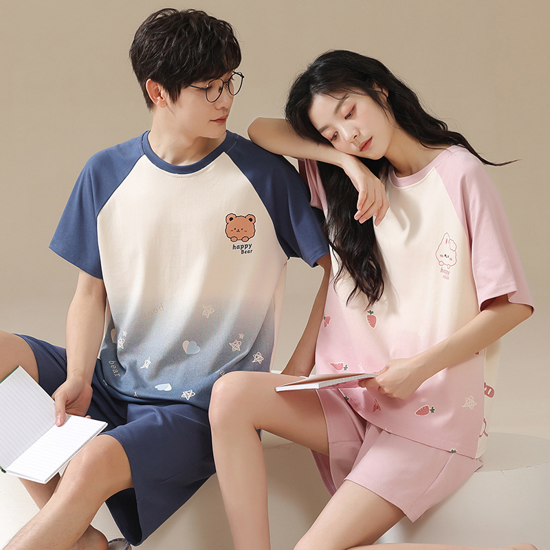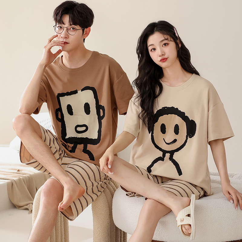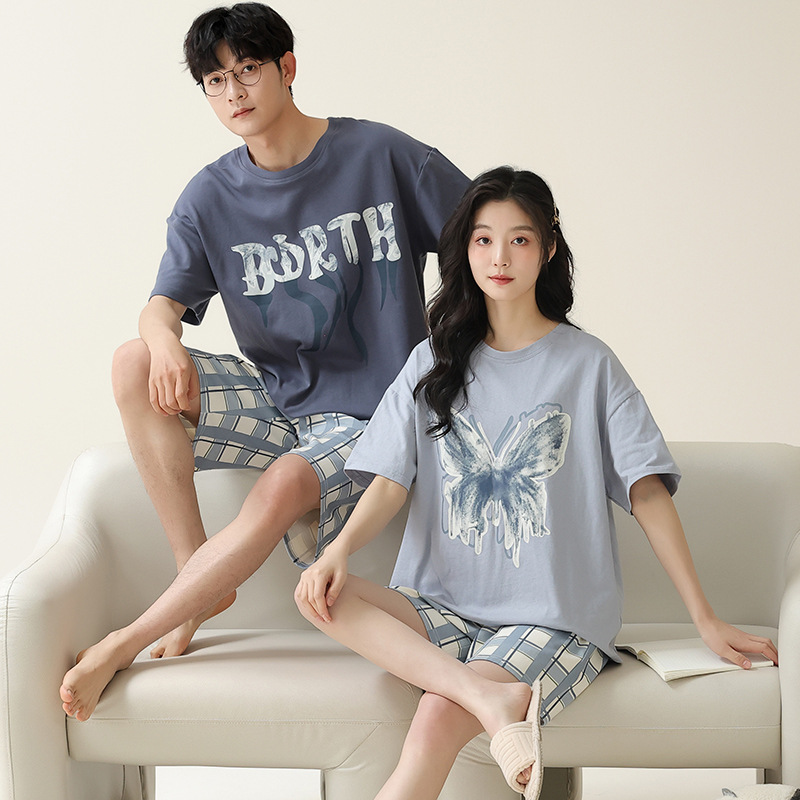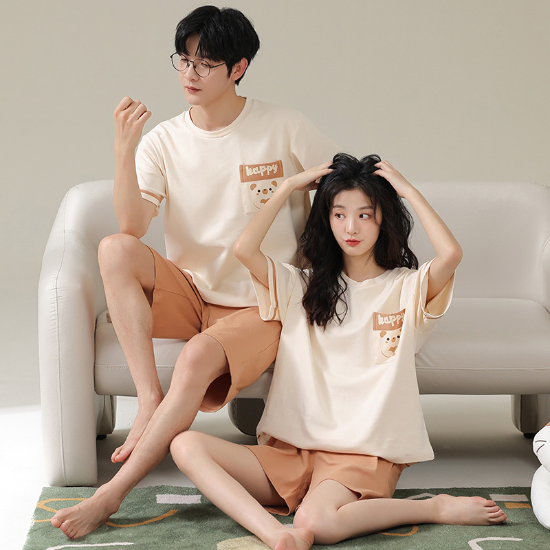 커플 잠옷 반팔 반바지 순면 남성 여름 얇은 여성 외부 착용 홈웨어 세트