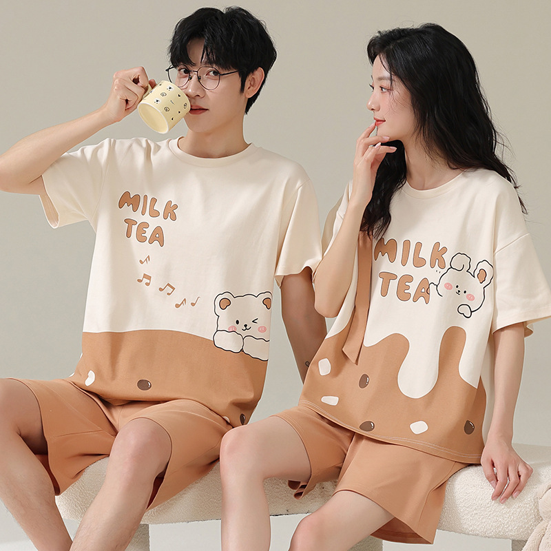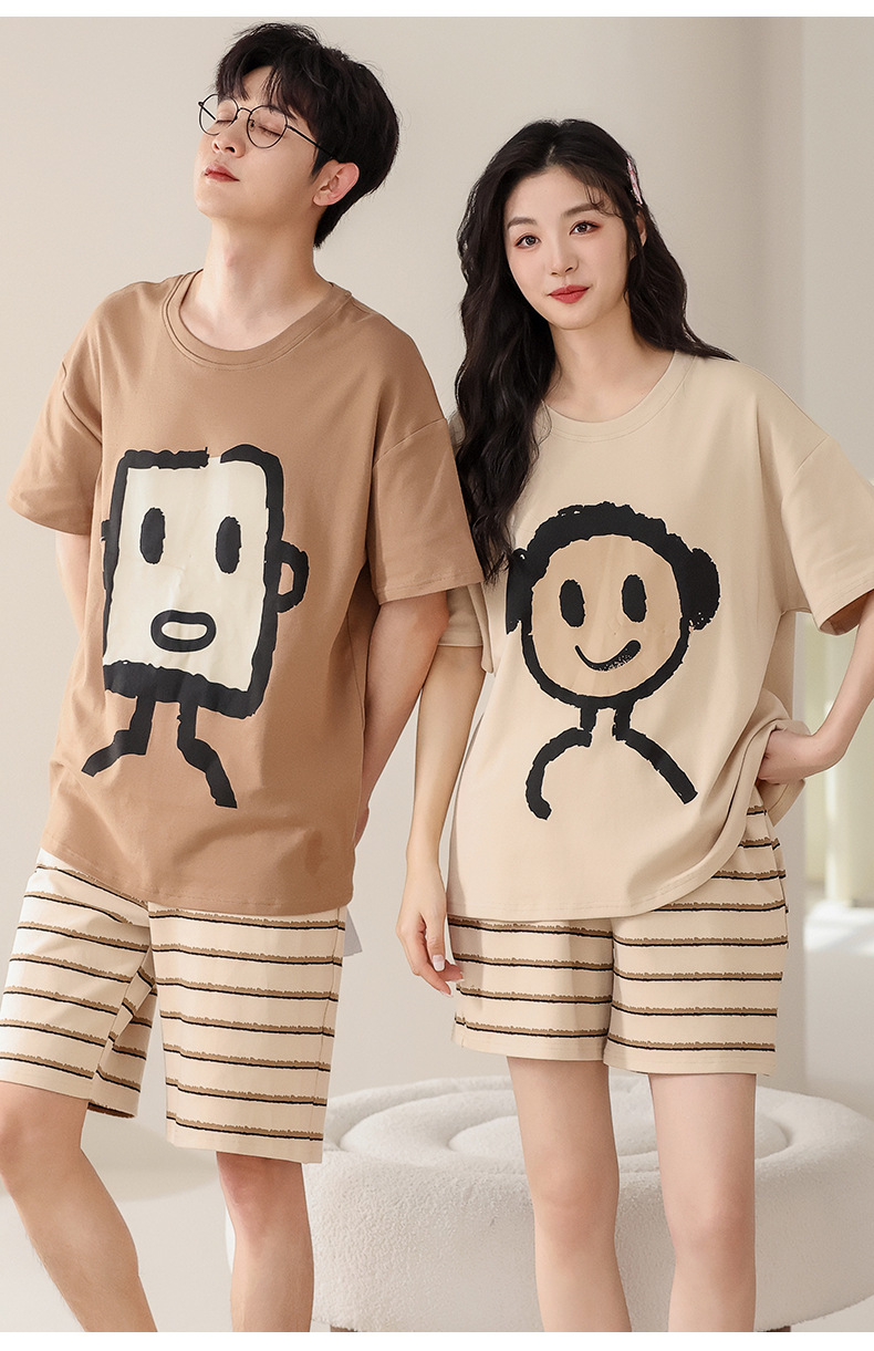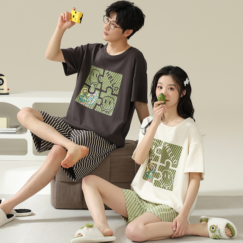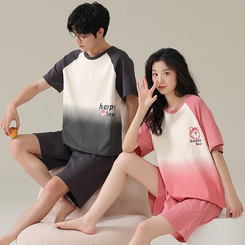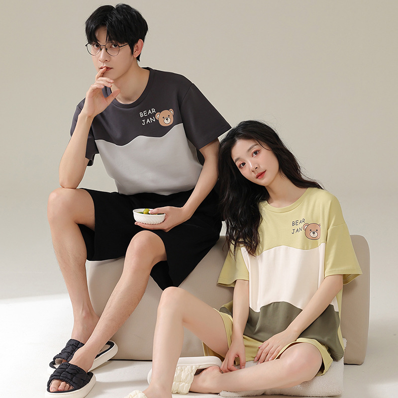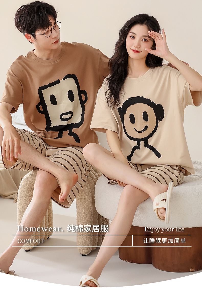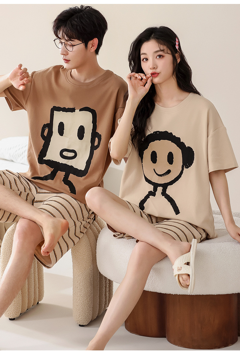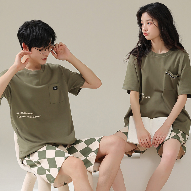 커플 잠옷 반팔 반바지 순면 남성 여름 얇은 여성 외부 착용 홈웨어 세트