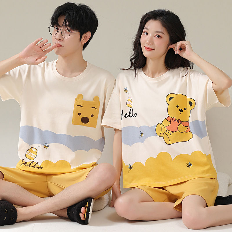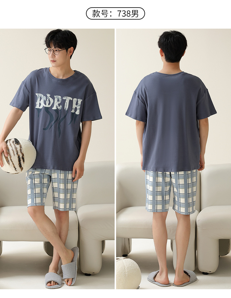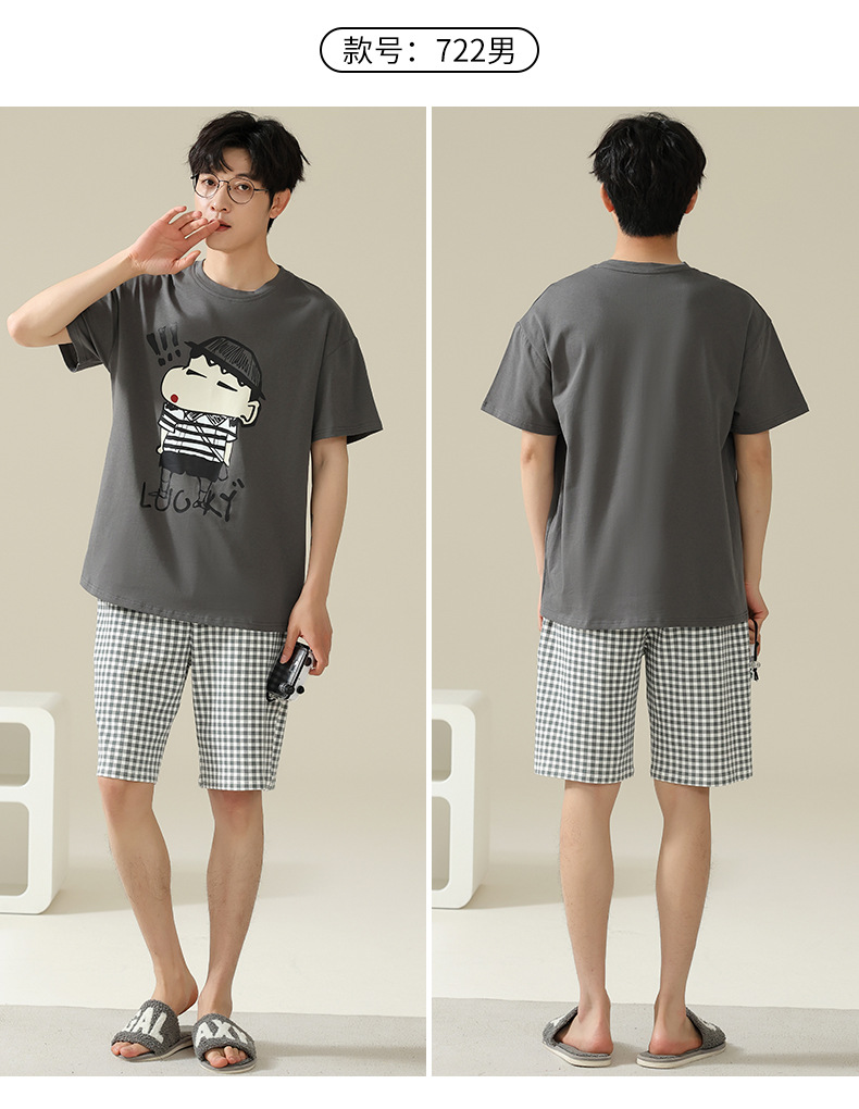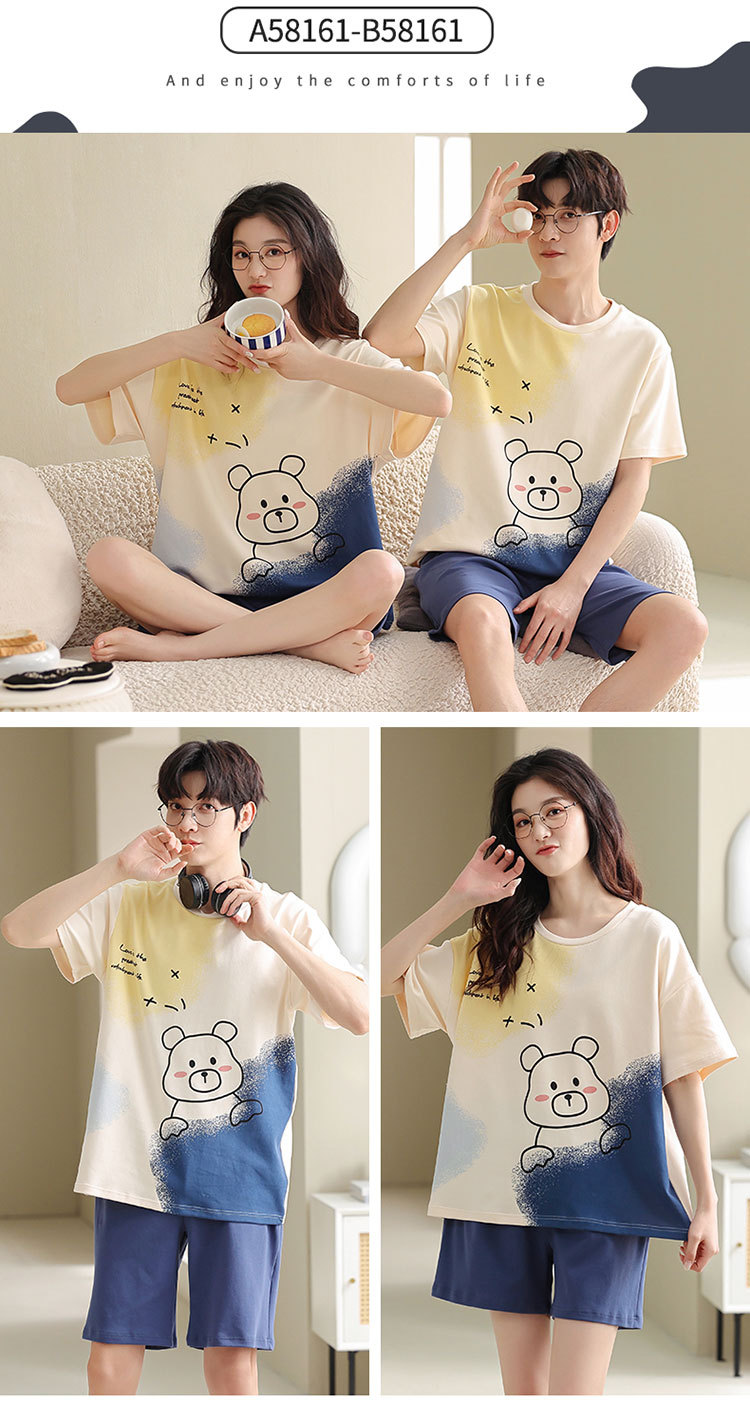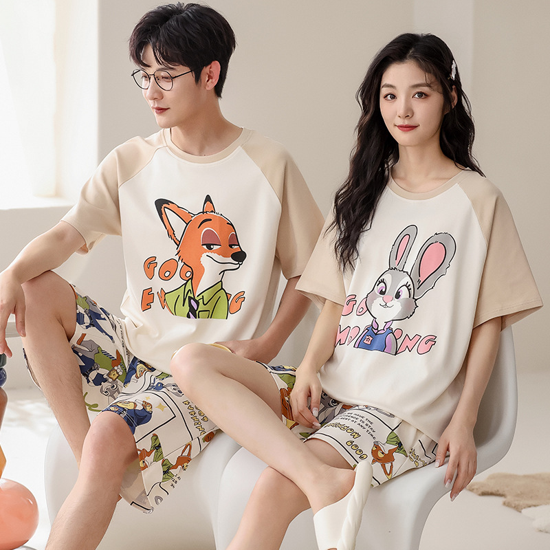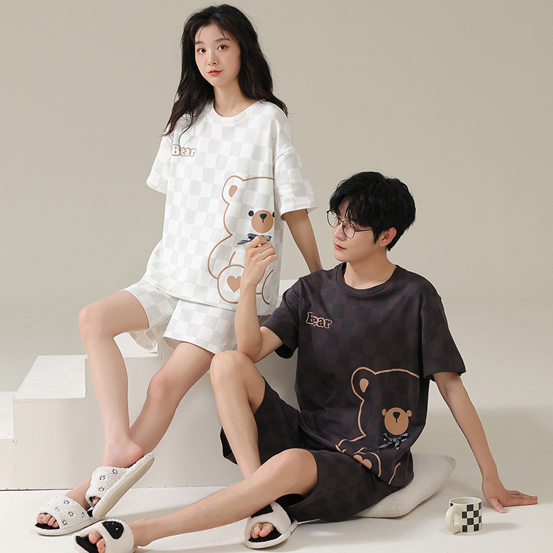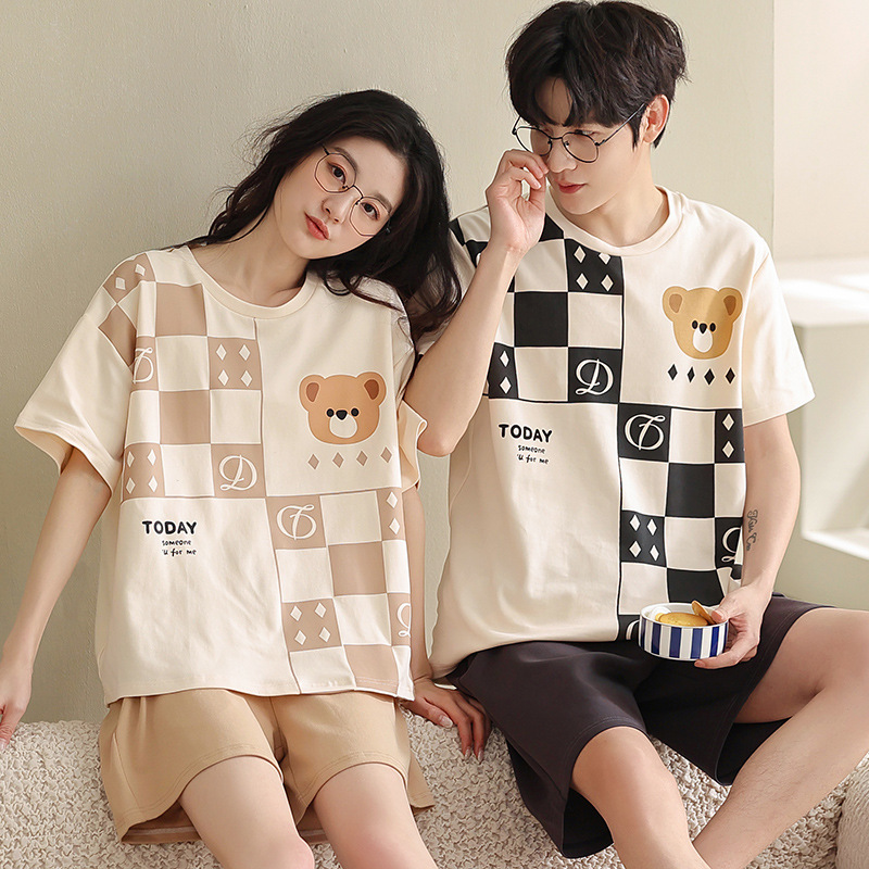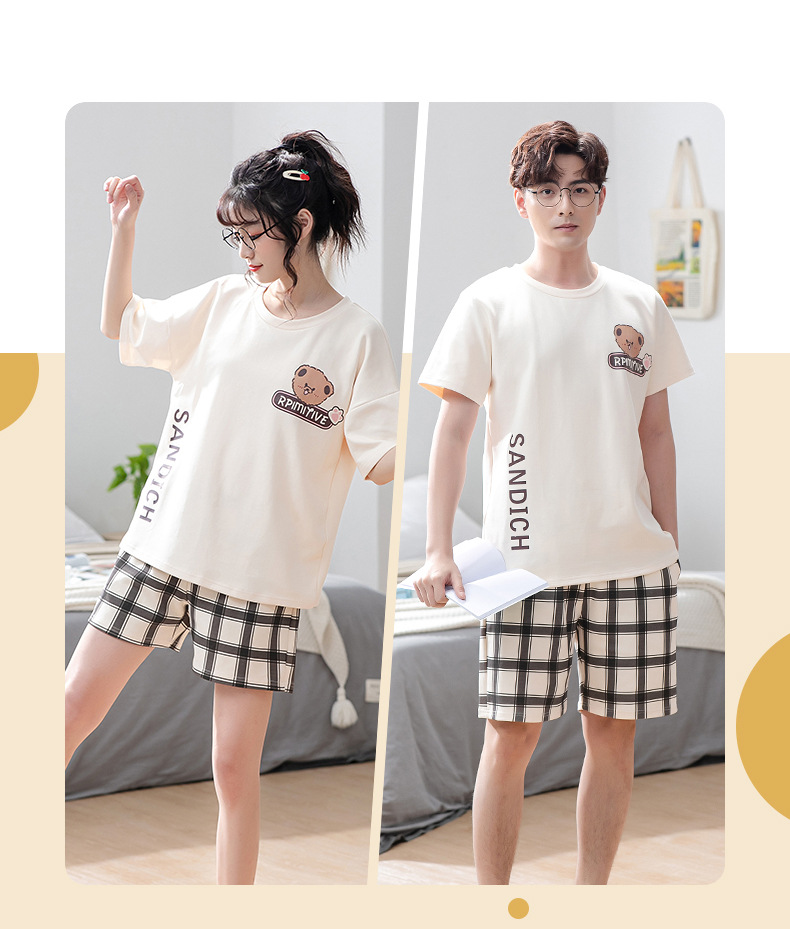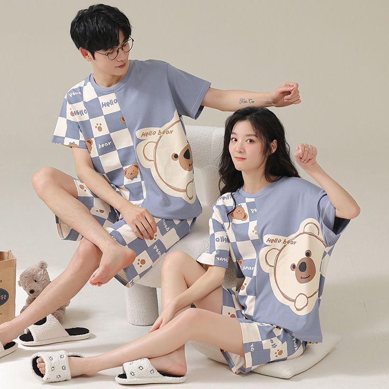 커플 잠옷 반팔 반바지 순면 남성 여름 얇은 여성 외부 착용 홈웨어 세트