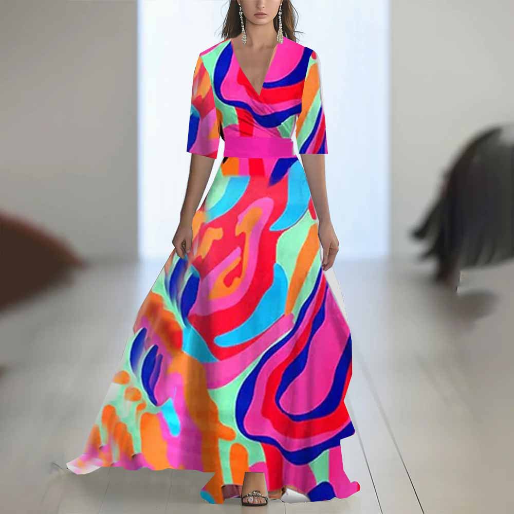 2025 유럽과 미국의 여성 의류 아마존 독립 역 디지털 인쇄 긴 소매 V-목 바느질 긴 원피스 원피스